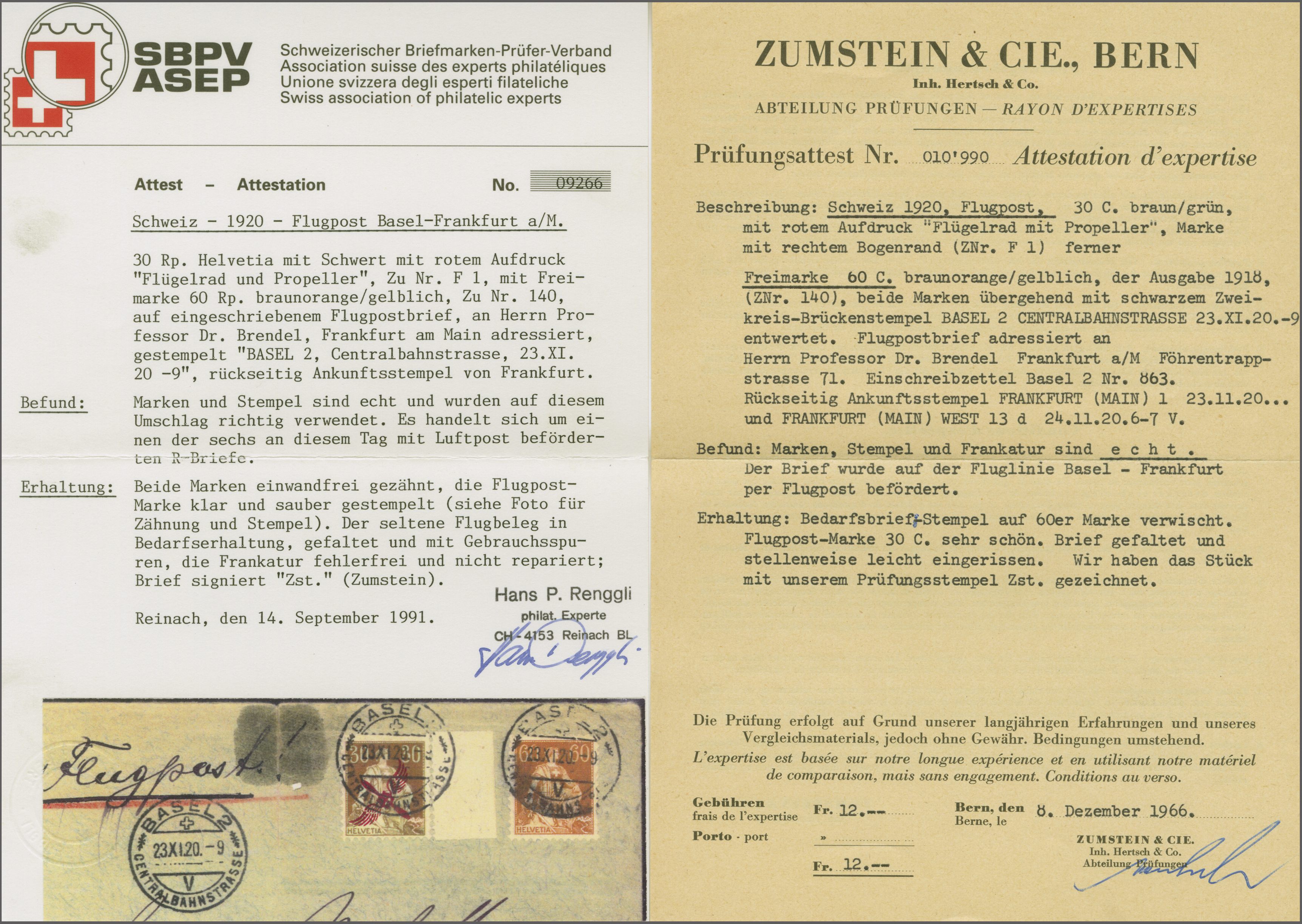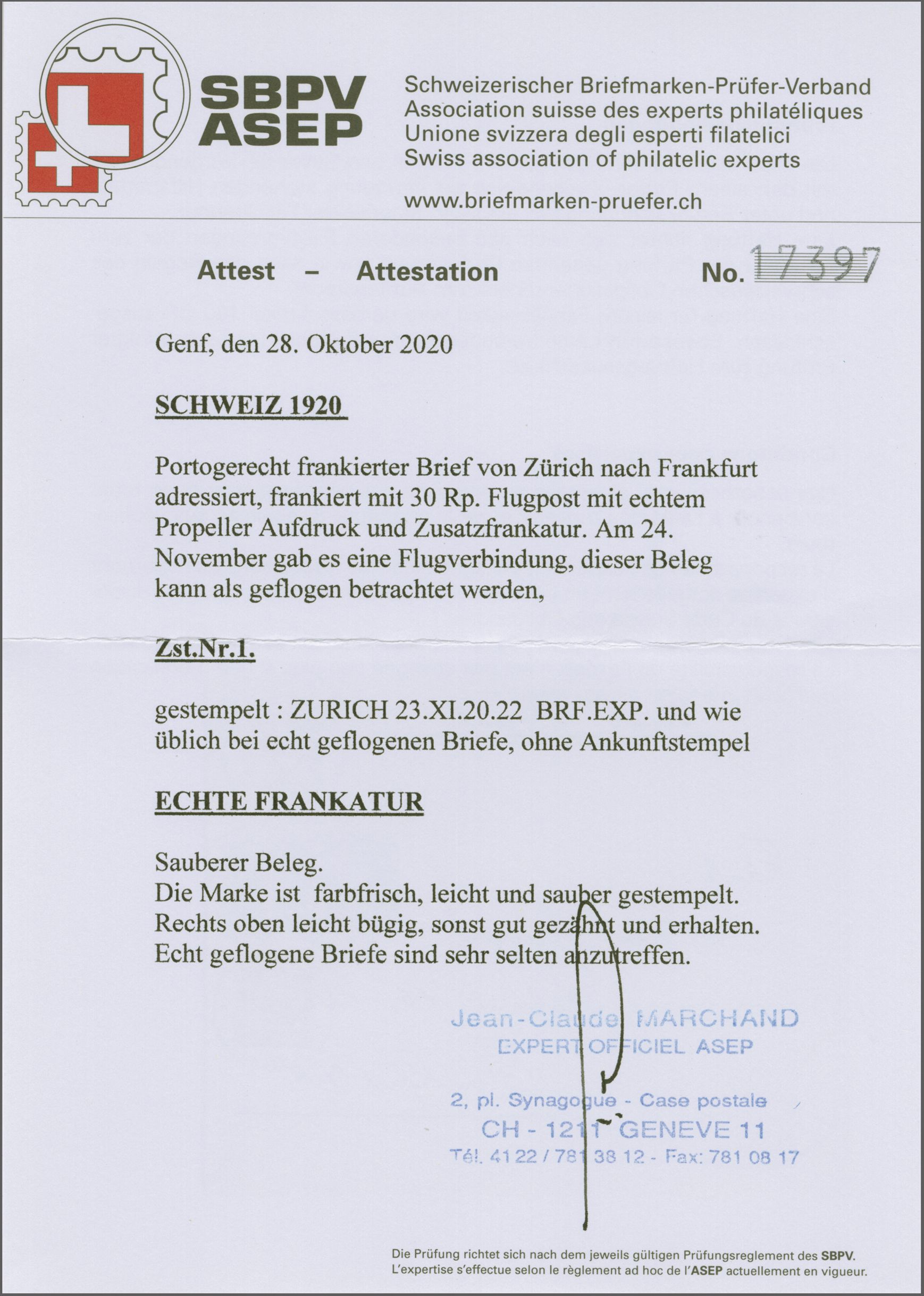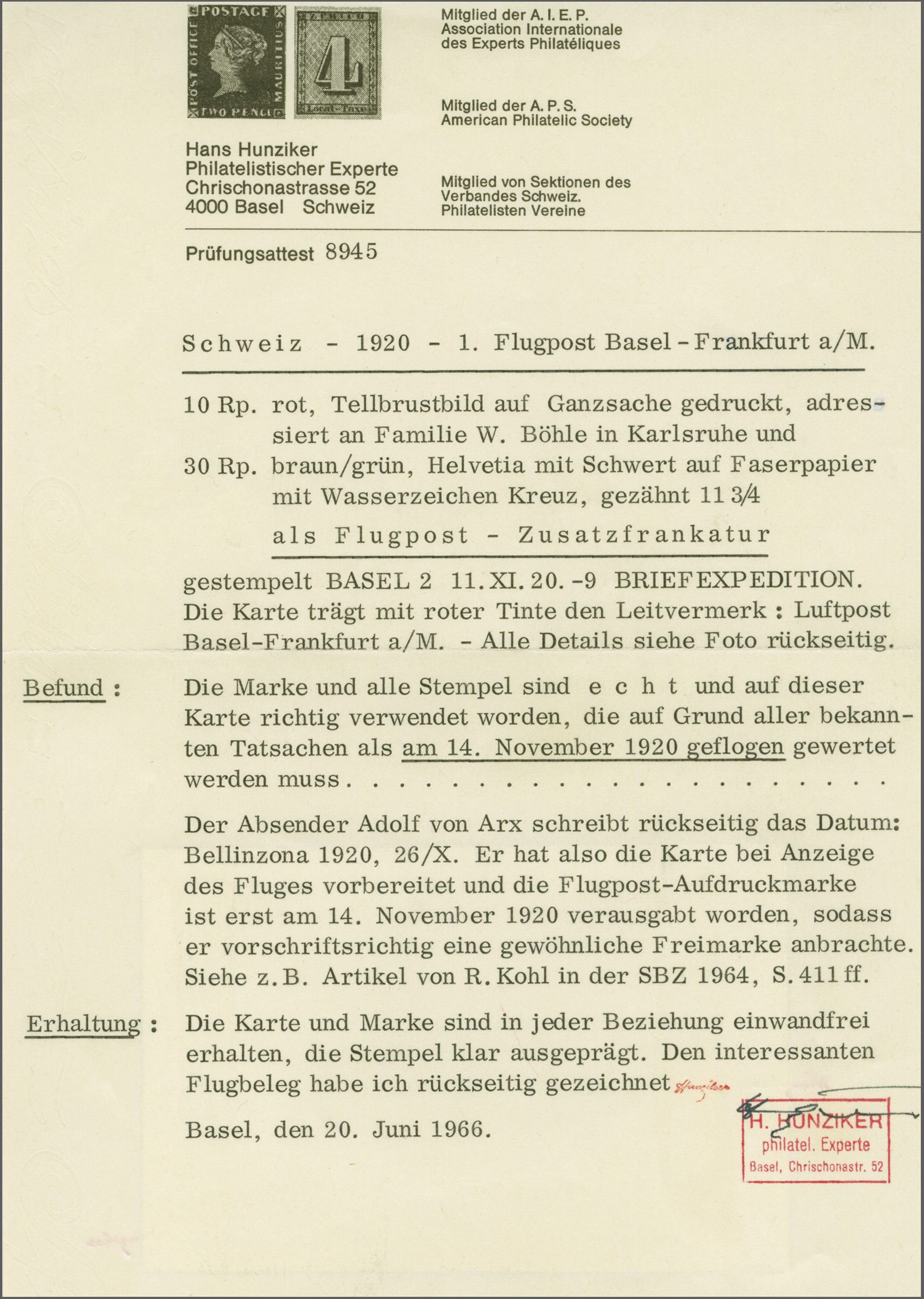 mit Astp. und es darf angenommen werden, dass der Beleg am 29. November geflogen wurde. Gemäss Attest Bohler (1983): "Die damit ausgewiesenen zeitlichen Verhältnisse ergeben, dass der Brief mit Sicherheit am 29.11.20 auf dem Luftwege von Lörrach nach