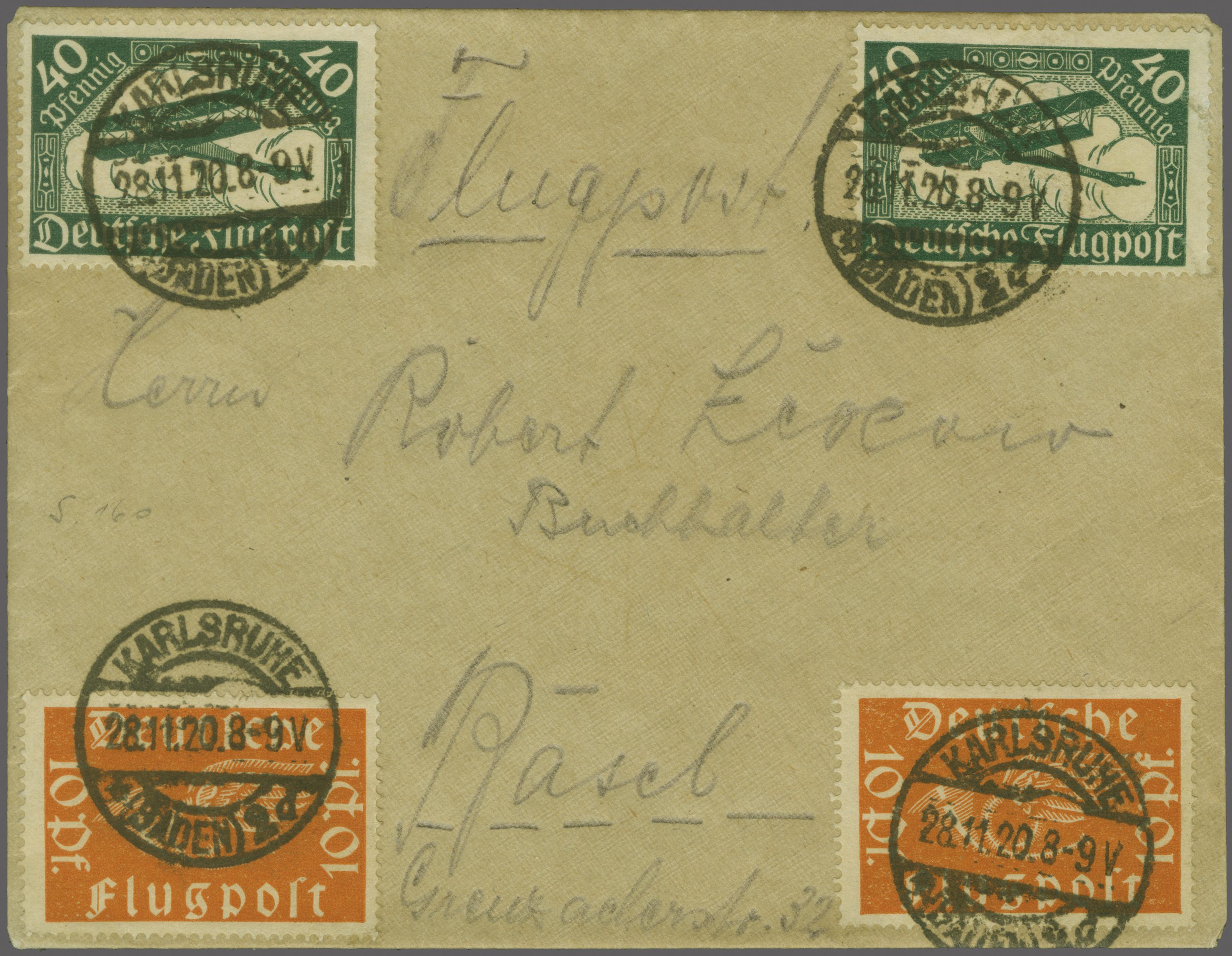 BALUG Linie Frankfurt - Basel / Lörrach, Deutsche Post 1920 (28. Nov.): Seltener Etappenbeleg ab "Karslruhe 28.11.20.8-9V" nach Basel, frankiert mit Flugpost 10 Pfg. orange (2) und 40 Pfg. grün, attraktiv in die Ecken vom