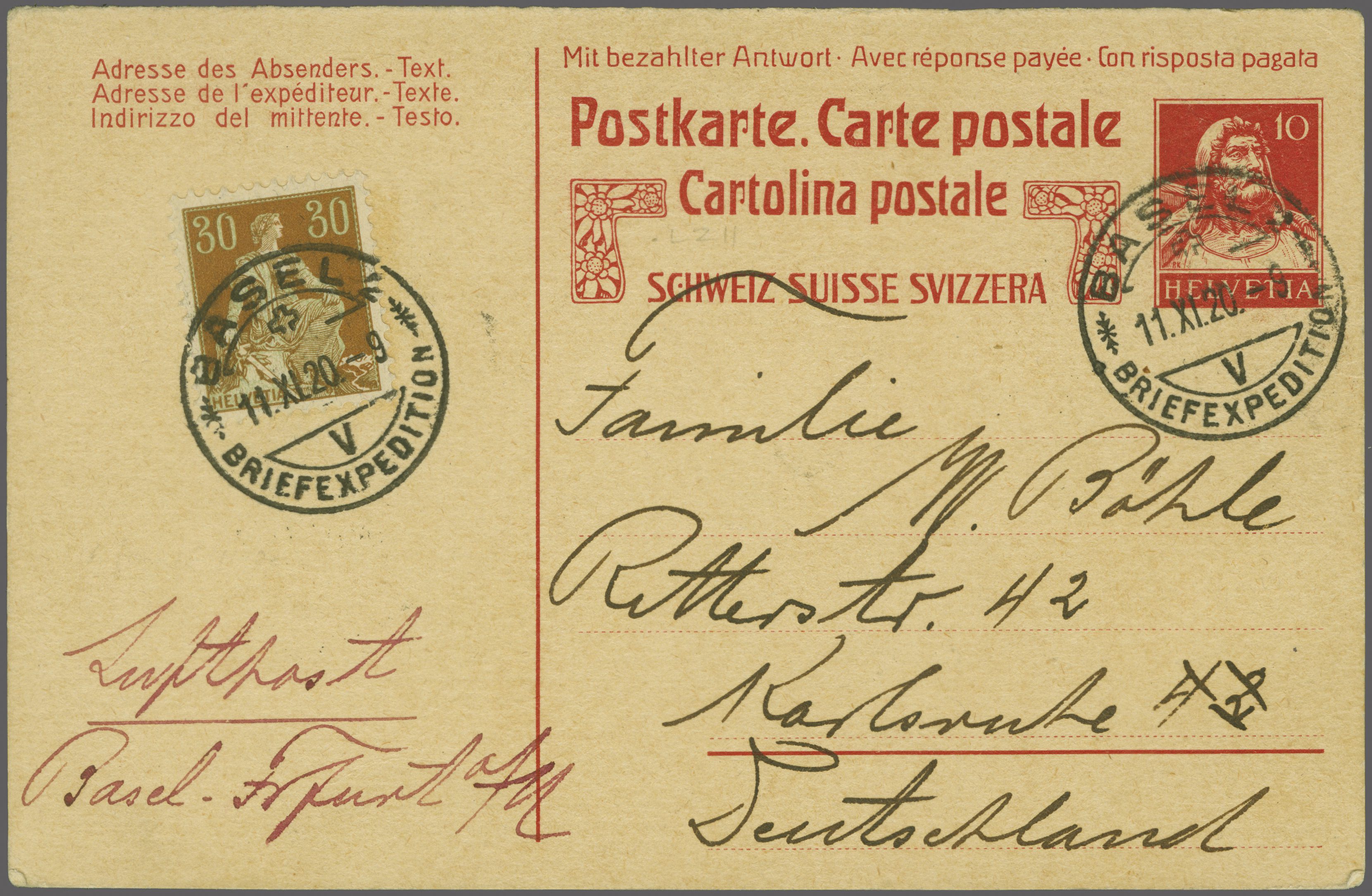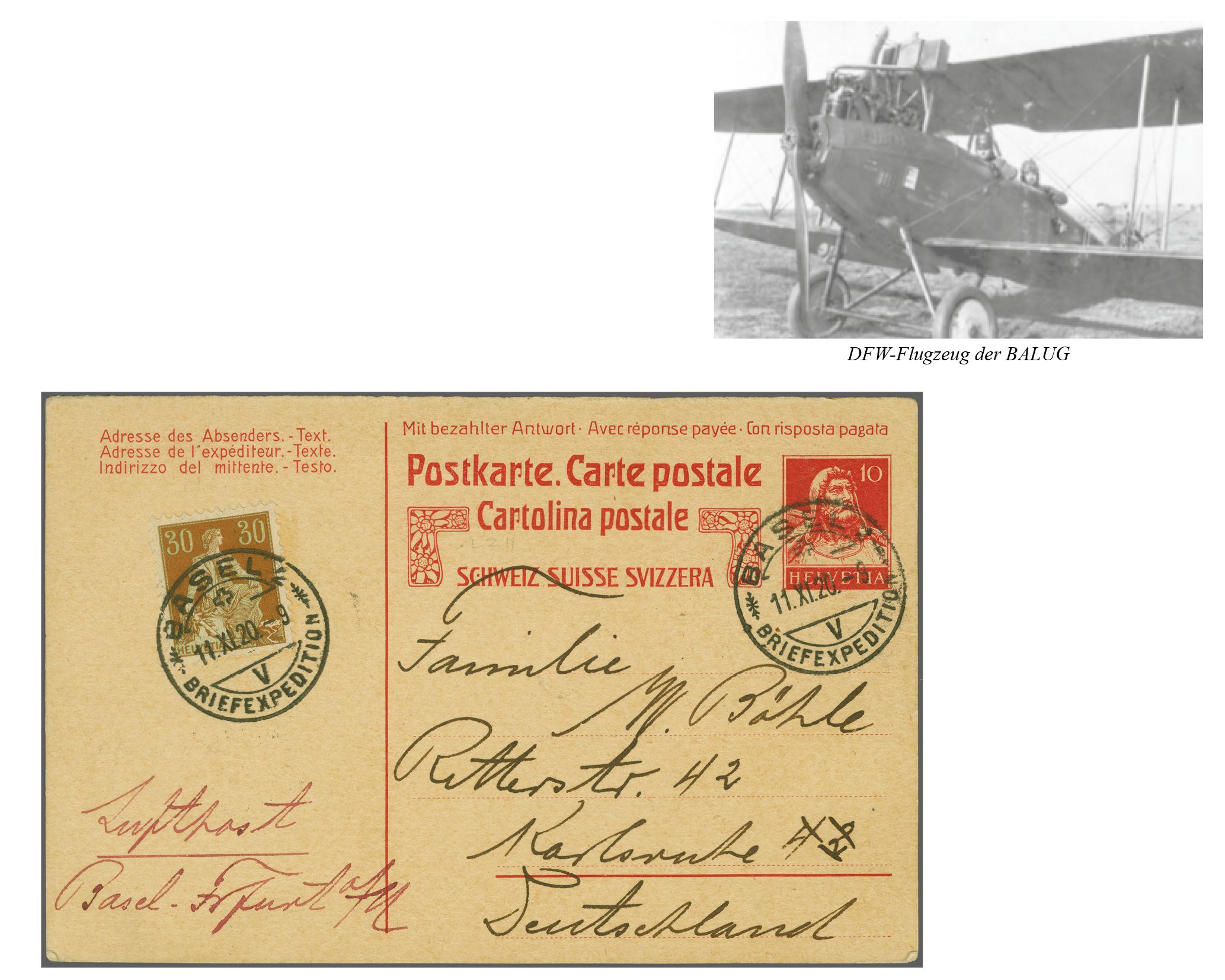 Eröffnung der BALUG Linie Lörrach - Frankfurt 1920 (11. Nov.): 10 Rp. GS-Karte zusätzlich frankiert mit einer gewöhnlichen 30 Rp. Marke (ohne Propeller Aufdruck) für die Flugposttaxe, beide sauber gest. "BASEL Briefexpedition