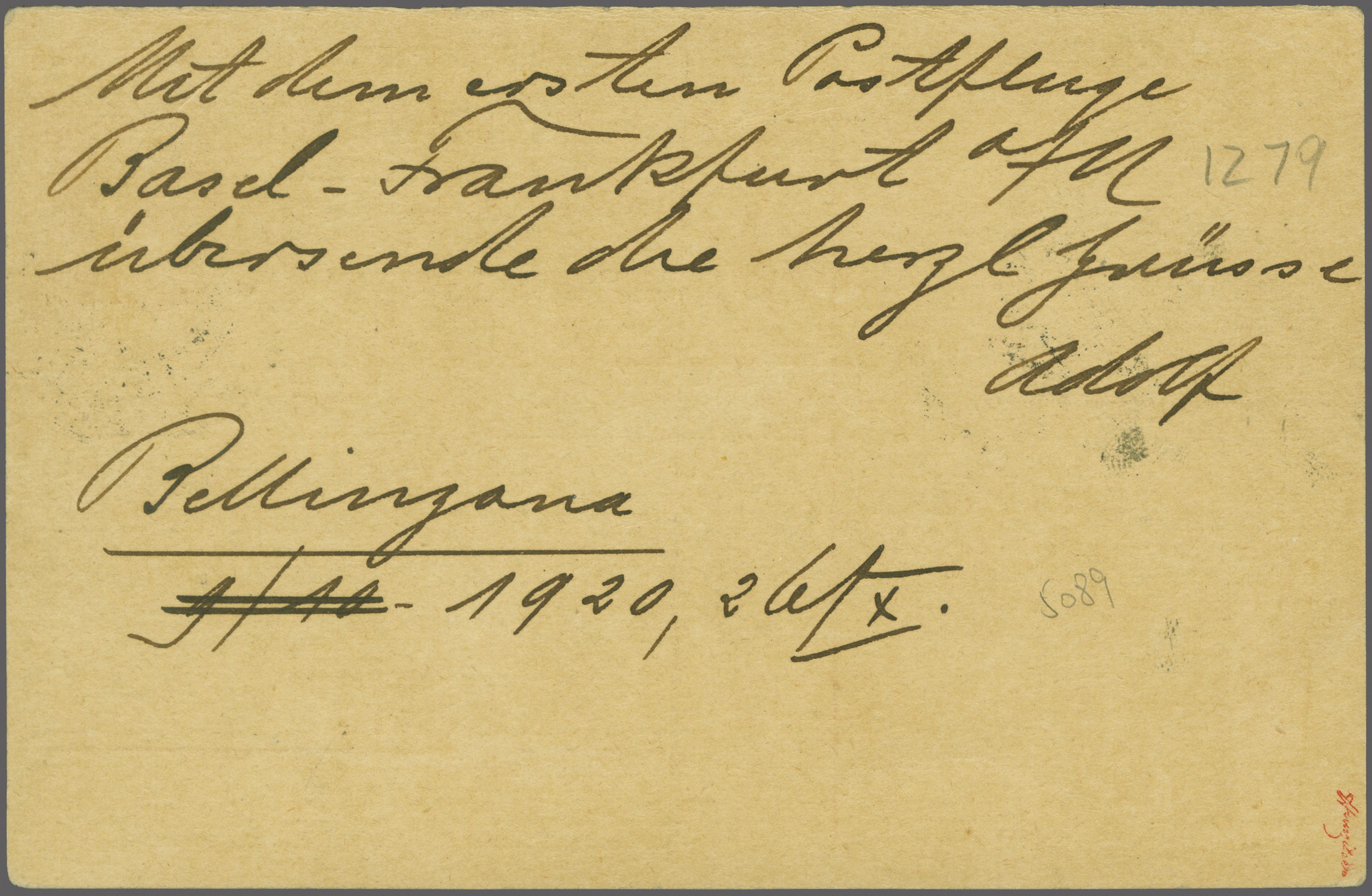 11.XI.20-9" nach Karlsruhe mit vorders. Leitvermerk in roter Tinte und rücks. Grussbotschaft: "Mit dem ersten Postflug Basel - Frankfurt a/M übersende ich herzl. Grüsse Adolf (von Arx) Bellinzona 1920 2. Oct.X.". Wegen Nebels fand der Pilot den
