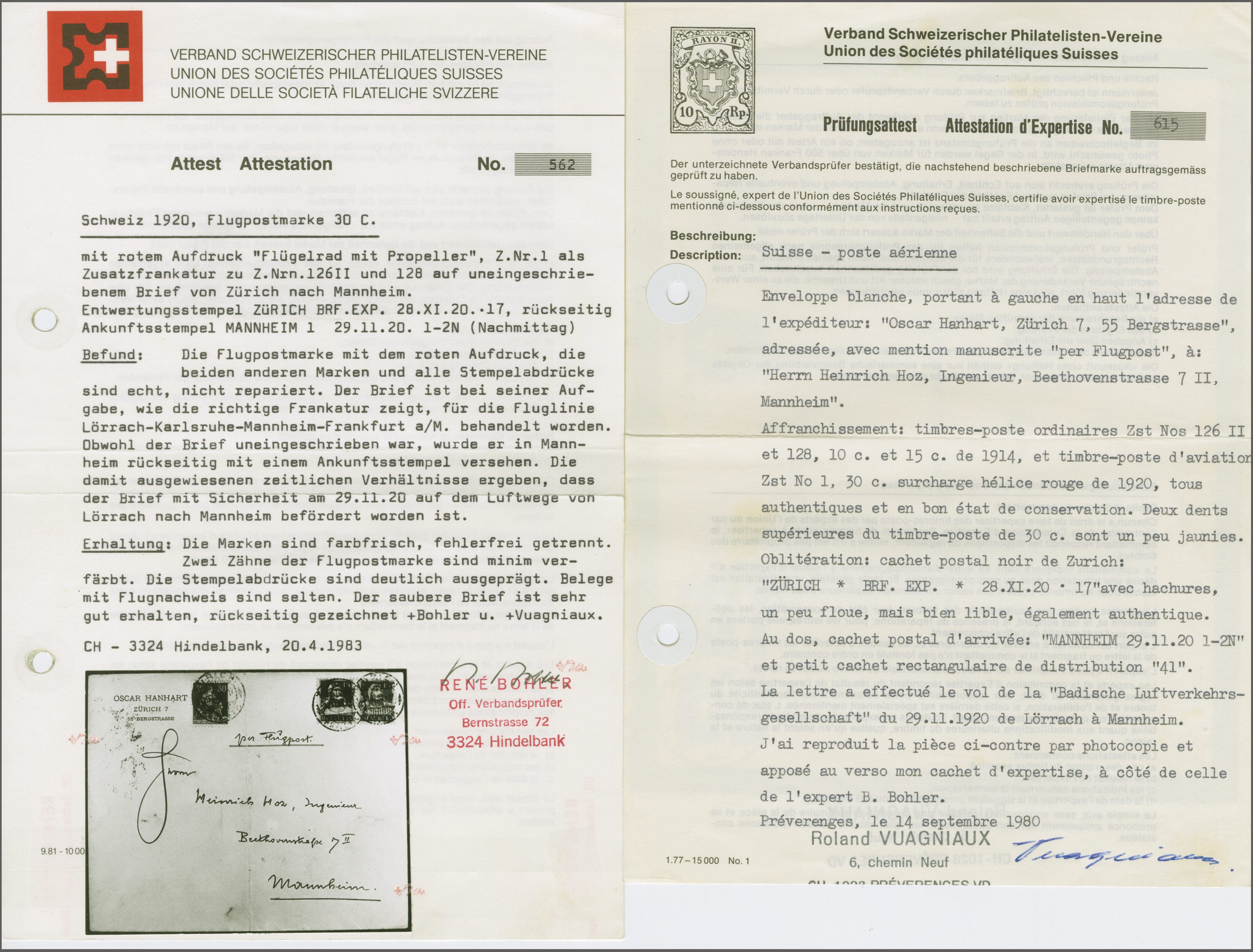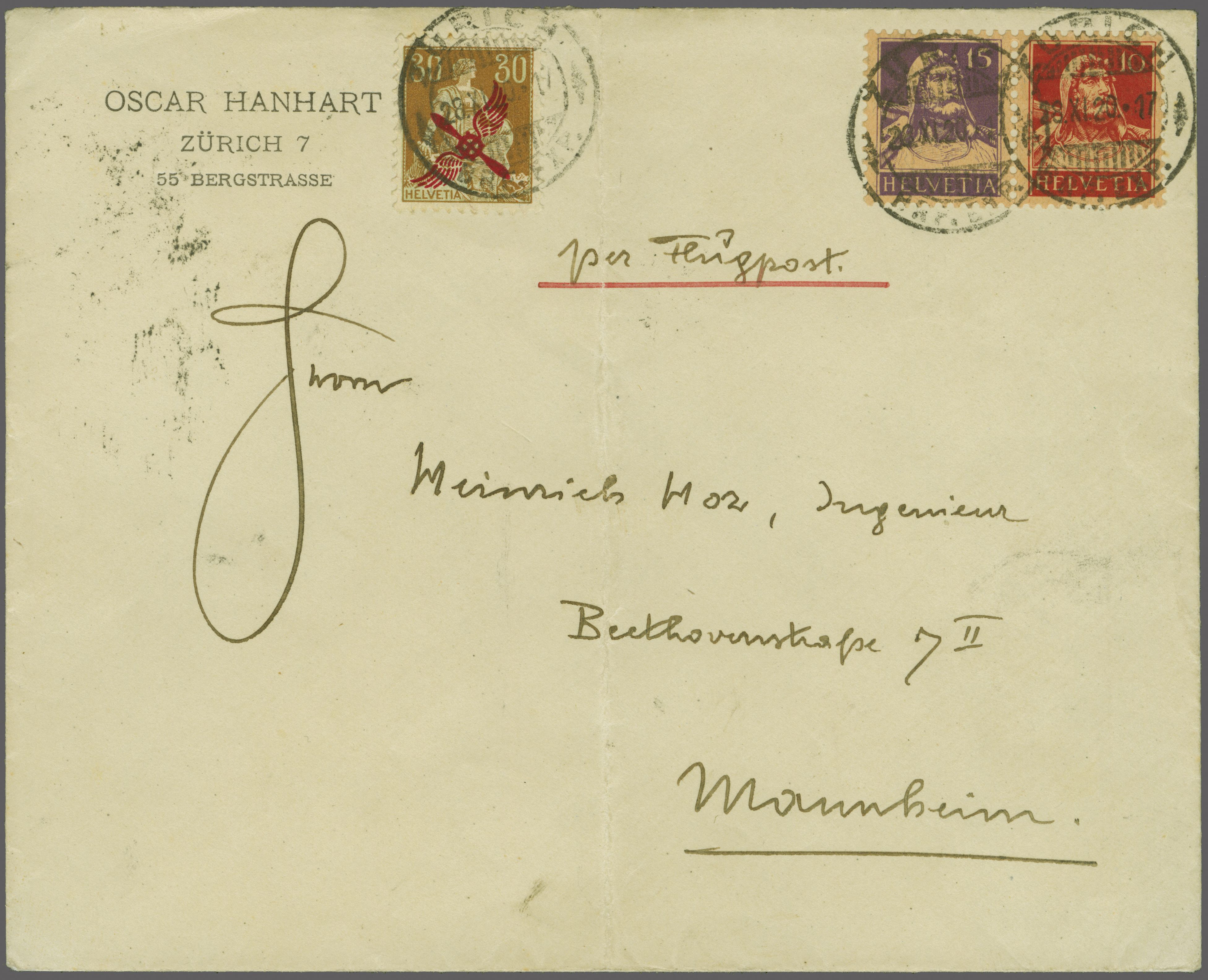 Mannheim befördert worden ist". Bisher sind nur zwei Belege bekannt: Einmal Aufgabe Basel 24. November 1920 sowie der hier vorliegende Beleg der Aufgabe Zürich vom 28. November. Abgebildet im SLH auf S. 50. Ex Sammlung IKARUS, Los 1127. Atteste