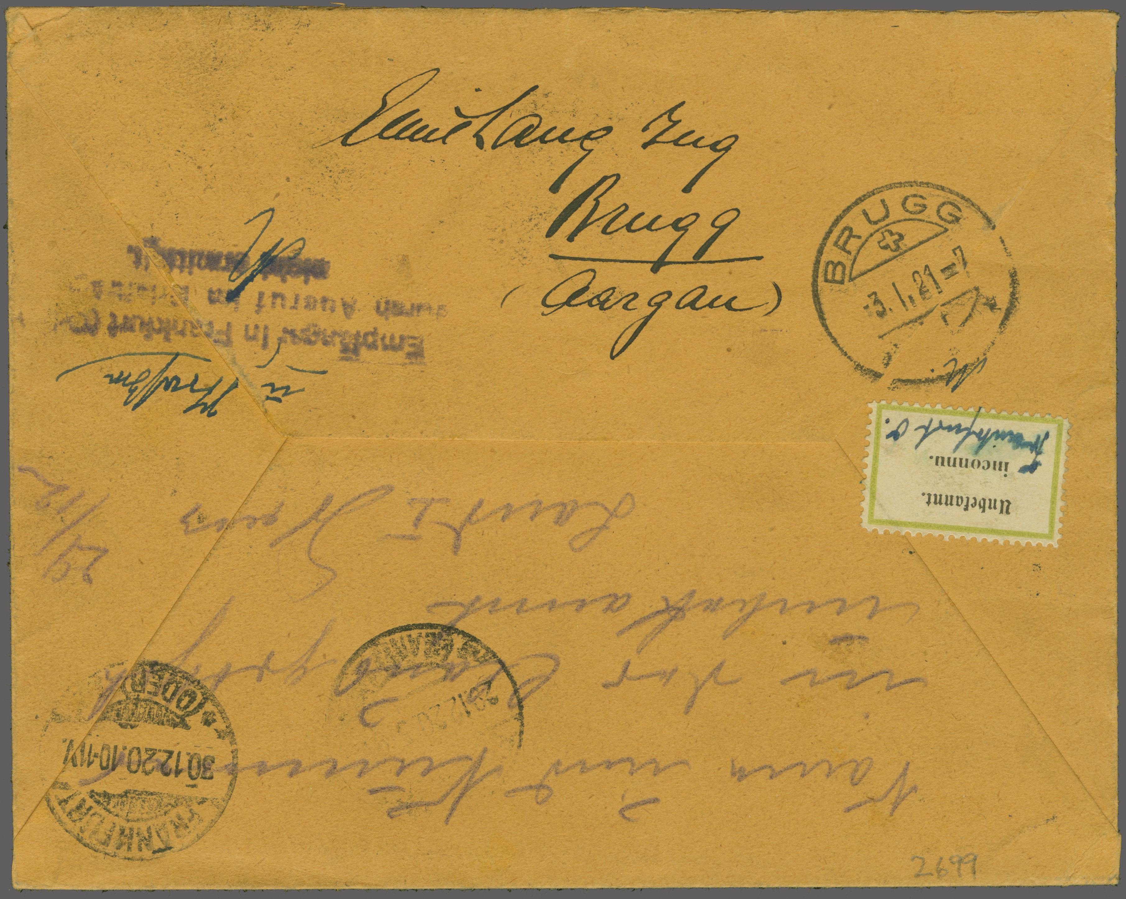 retourniert mit rücks. AStp. "Brugg 3.1.21-7". Ein sehr interessanter Beleg zum letzten Flug am 28. Dezember nach Frankfurt (Main). Gem. rücks. Bestätigungsstp. von "Frankfurt (Main) vom 29. Dezember, muss jedoch angenommen werden, dass der Brief per