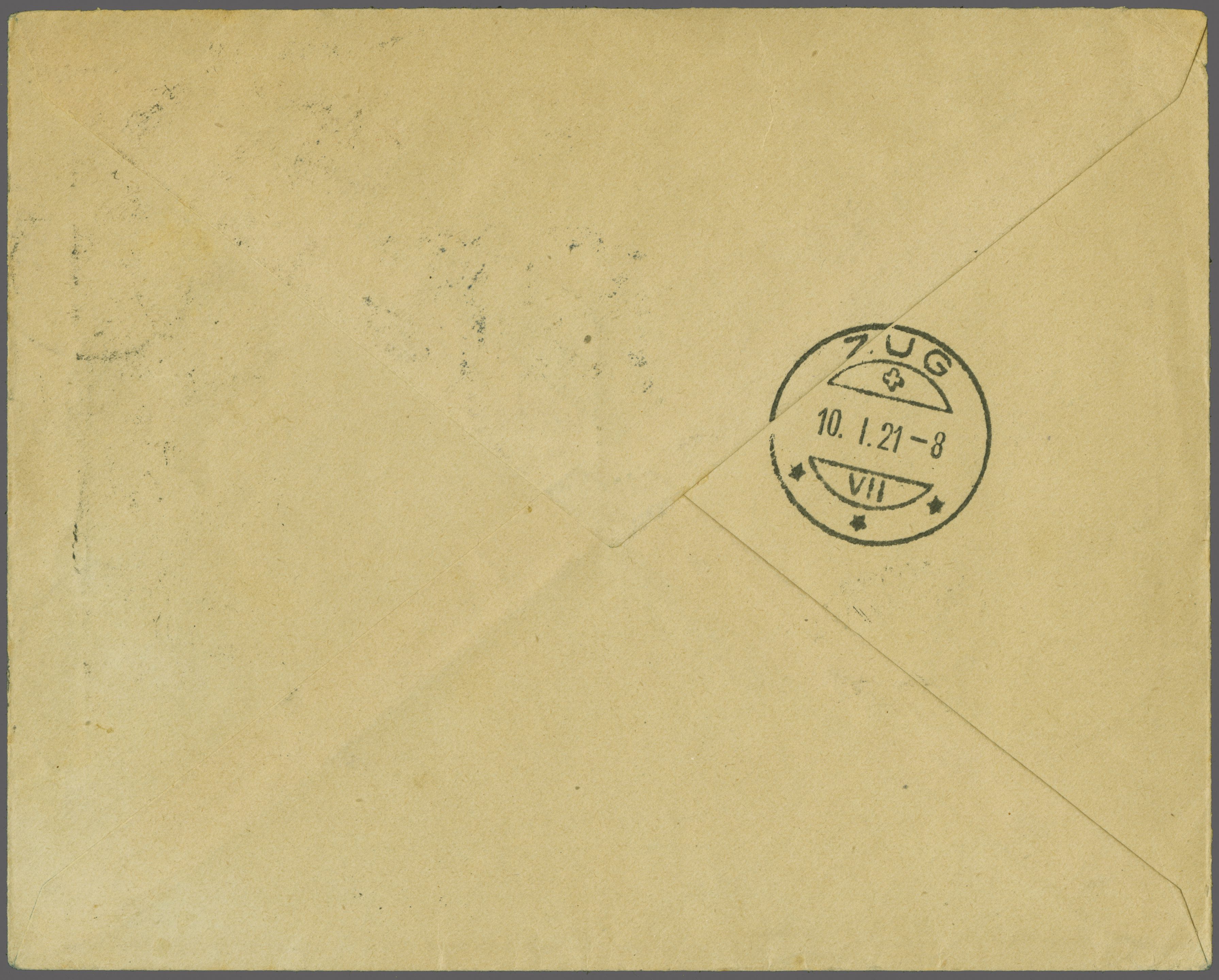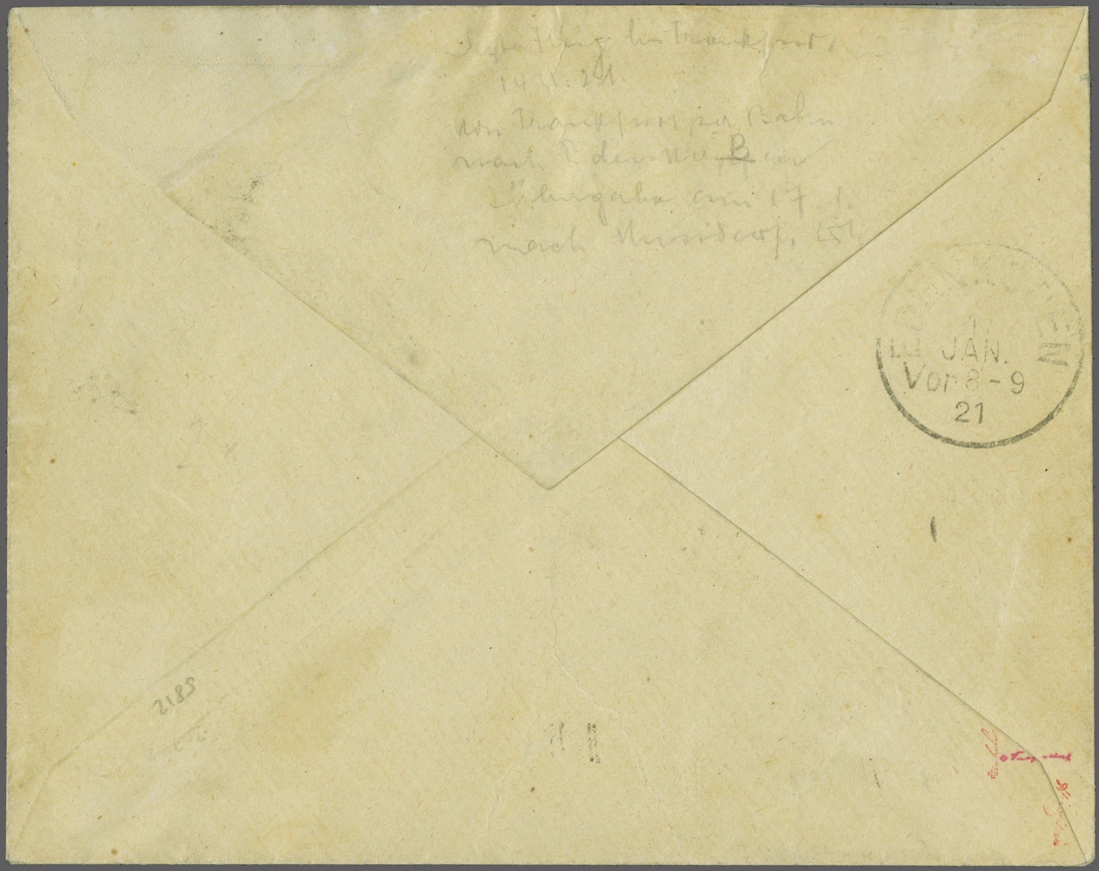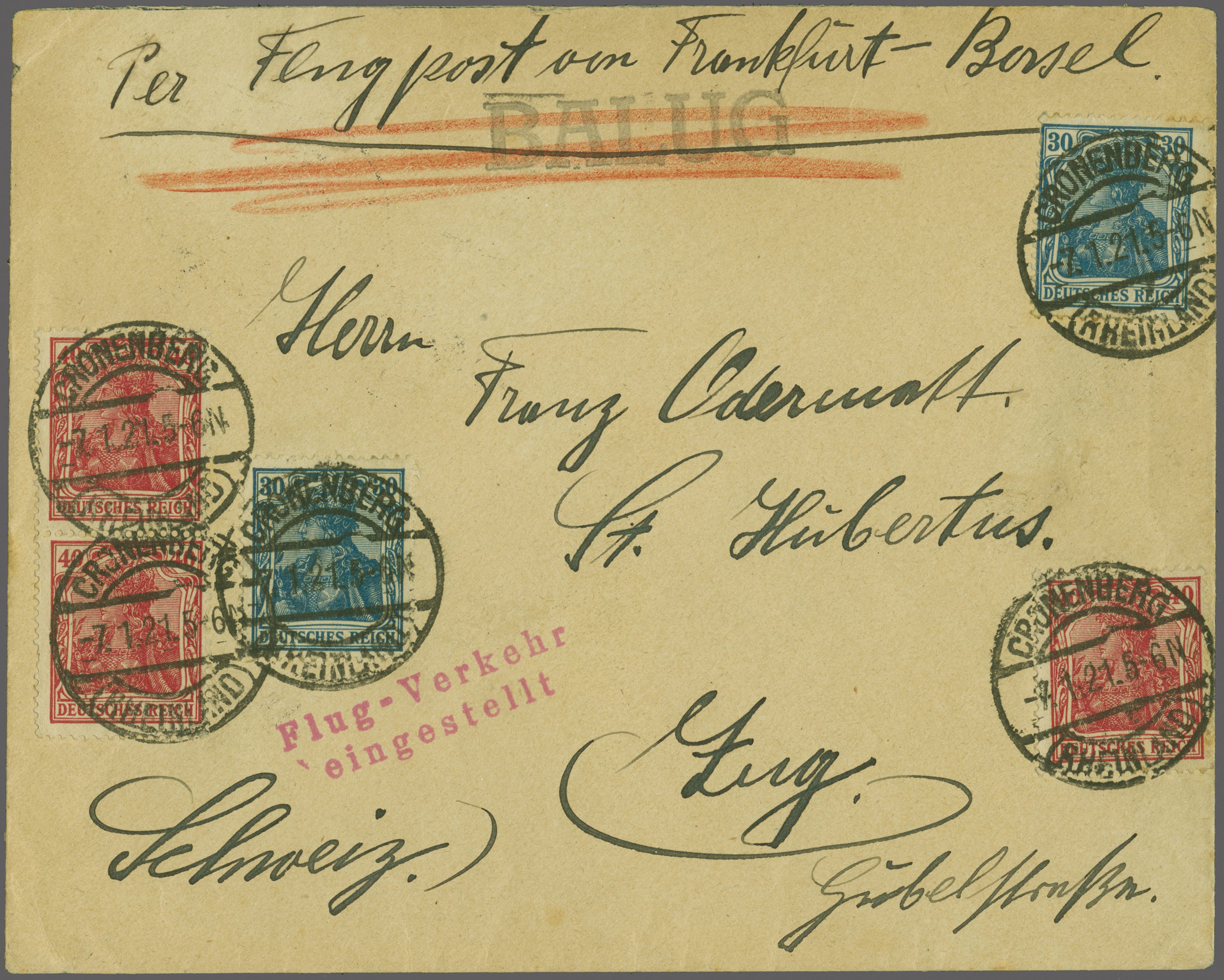 BALUG Linie Frankfurt - Lörrach / Basel 1921 (7. Jan.): Briefumschlag frankiert mit RM 1.80 von "Cronenberg -7.1.21.5-6N" in die Schweiz nach Zug adressiert, mit rücks. AStp. vom 10. Januar, vorders. handschriftl. Leitvermerk
