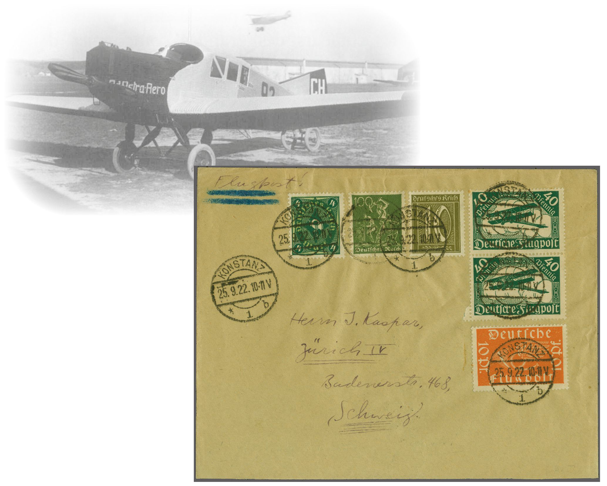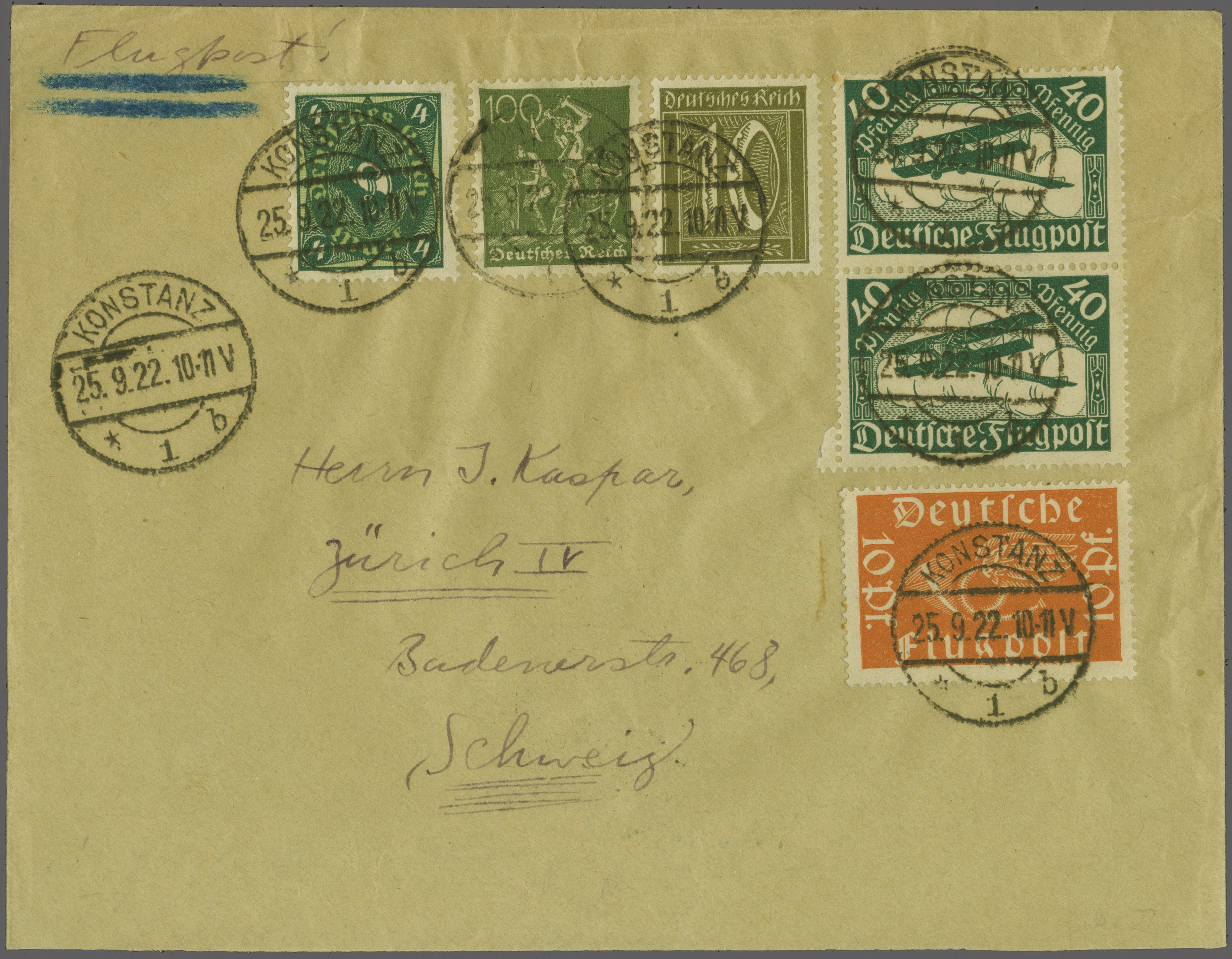 Ad Astra Linie ab Konstanz 1922 (25. Sept.): Brief mit blau unterstrichenem Vermerk: "Flugpost!" von Konstanz nach Zürich mit Deutscher Frankatur 50 Pfg. Flugpost plus Zusatzfrankatur, alle Werte einzeln und sauber entw., bei