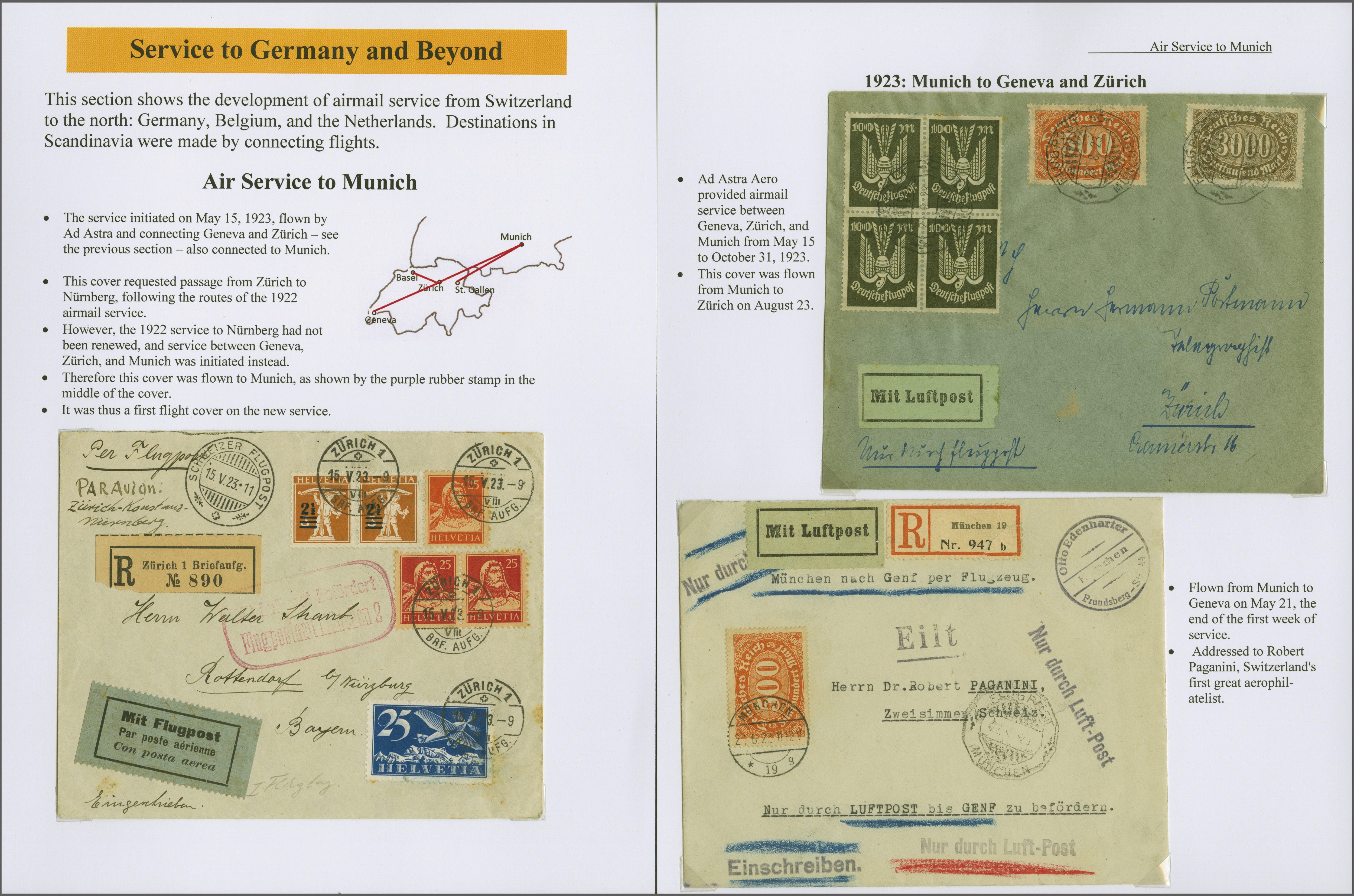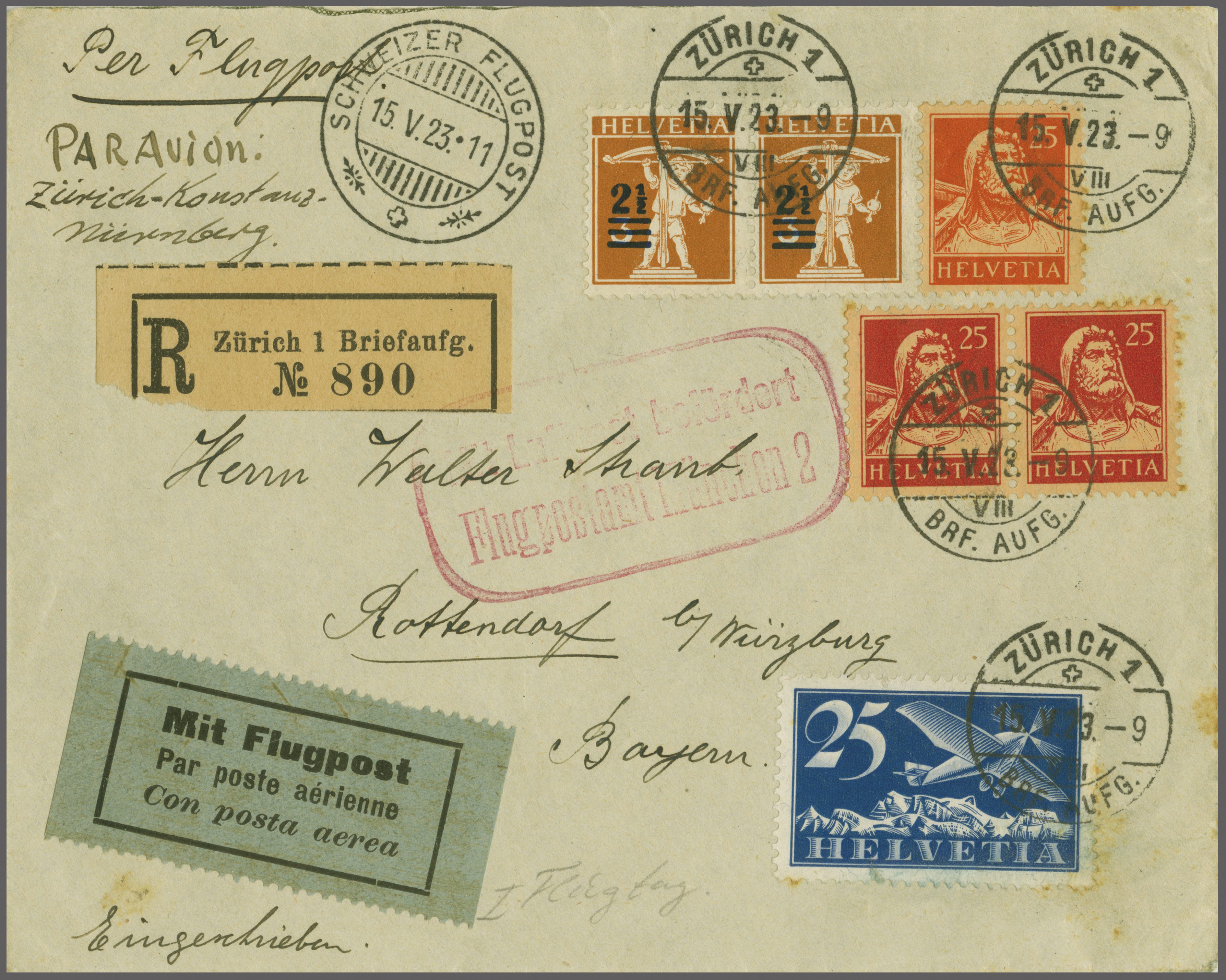 FLUGPOST 15.V.23.11" und rotem LpBST von München, nach Rottendorf b. Würzburg. Ein doch recht seltener Erstflug-Beleg, zusammen mit zwei Belegen späterer Flüge mit Dt. Frankaturen ab München in die Schweiz, einmal nach Zürich (Aug. 23), bezw. der