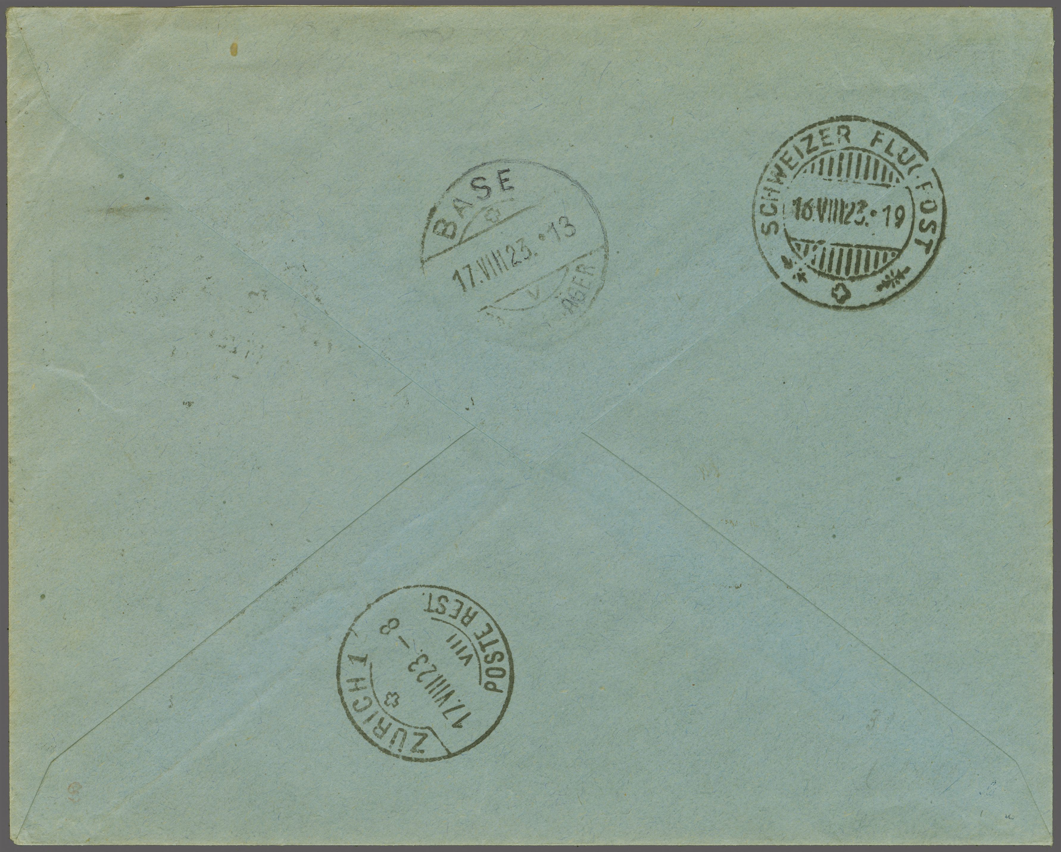 "Zürich 1 Poste Rest. 17.VIII.23-8" zurück nach Basel befördert. Ein sauberer Beleg zur Erweiterung der Fluglinie ab London - Paris - Basel nach Zürich. BefS 56 SLH = CHF 2'600 (Image 1)