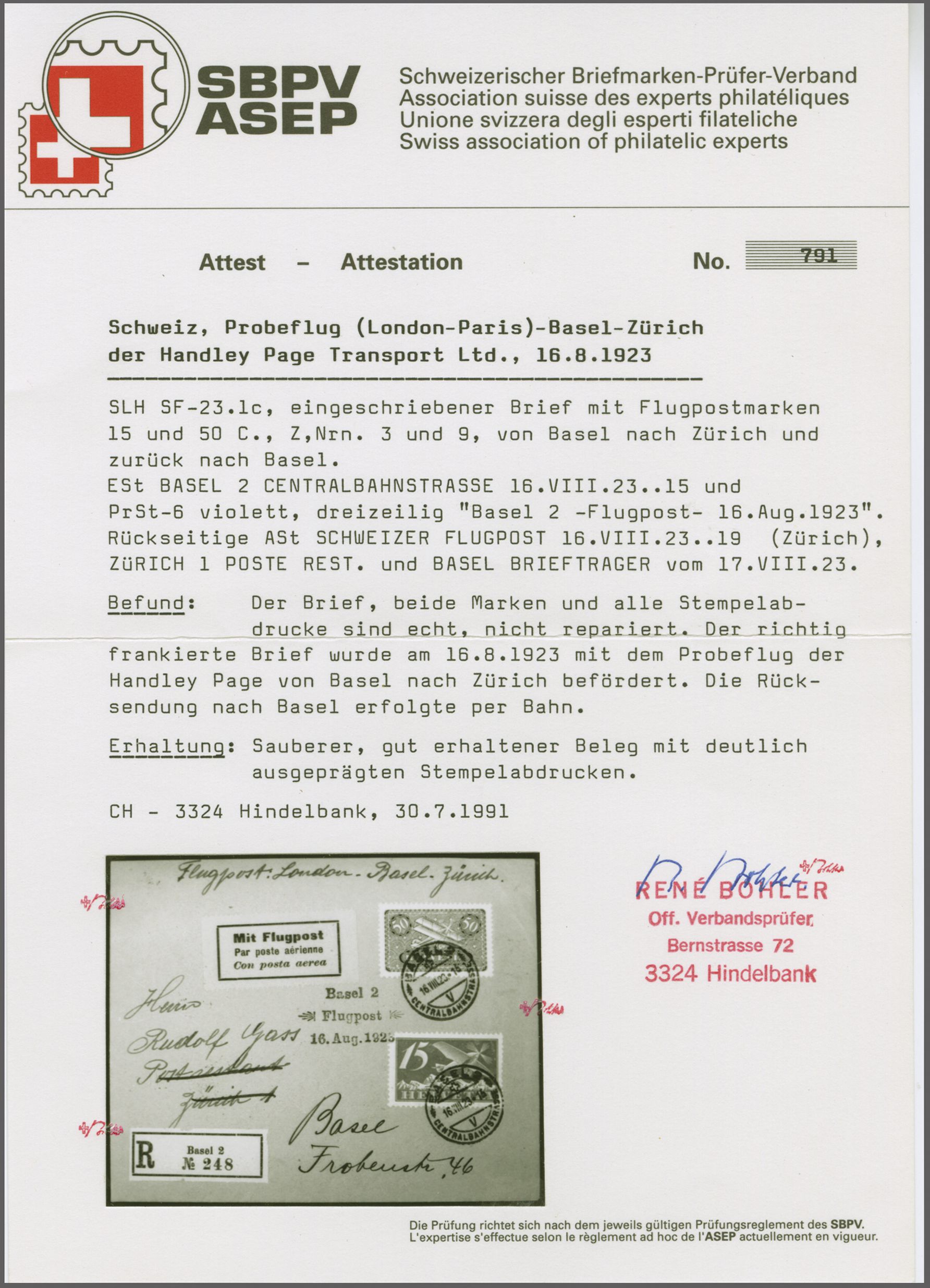 Handley Page Versuchsflug Basel - Zürich 1923 (16. Aug.): R-Brief frakiert mit Luftpost 15 Rp. und 50 Rp. ab "Basel 2 Centralbahnstrasse 16.VIII.23.15" mit PrSt 6 in Violett, rücks. FPS von 19 Uhr, am Folgetag per Bahnpost von