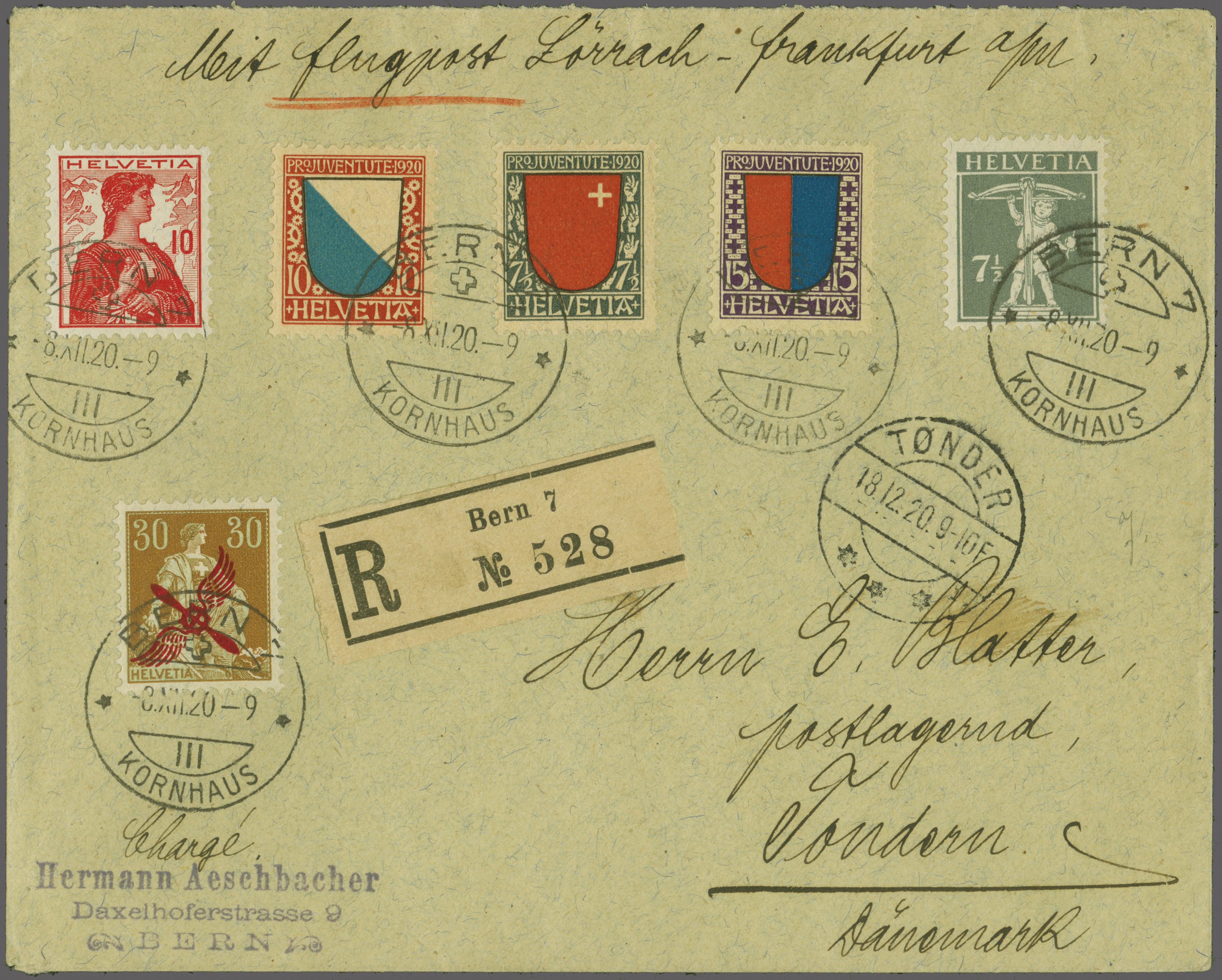 1920 (8. Dez.): Propeller auf 30 Rp. braun auf eingeschr. 'Blatter'-Brief von Bern nach Tondern, Dänemark, zusätzlich frankiert mit kompl. Pro Juventute Satz 1920 plus Freimarken zu 10 Rp. und 7 ½ Rp., alle Werte sauber gest.