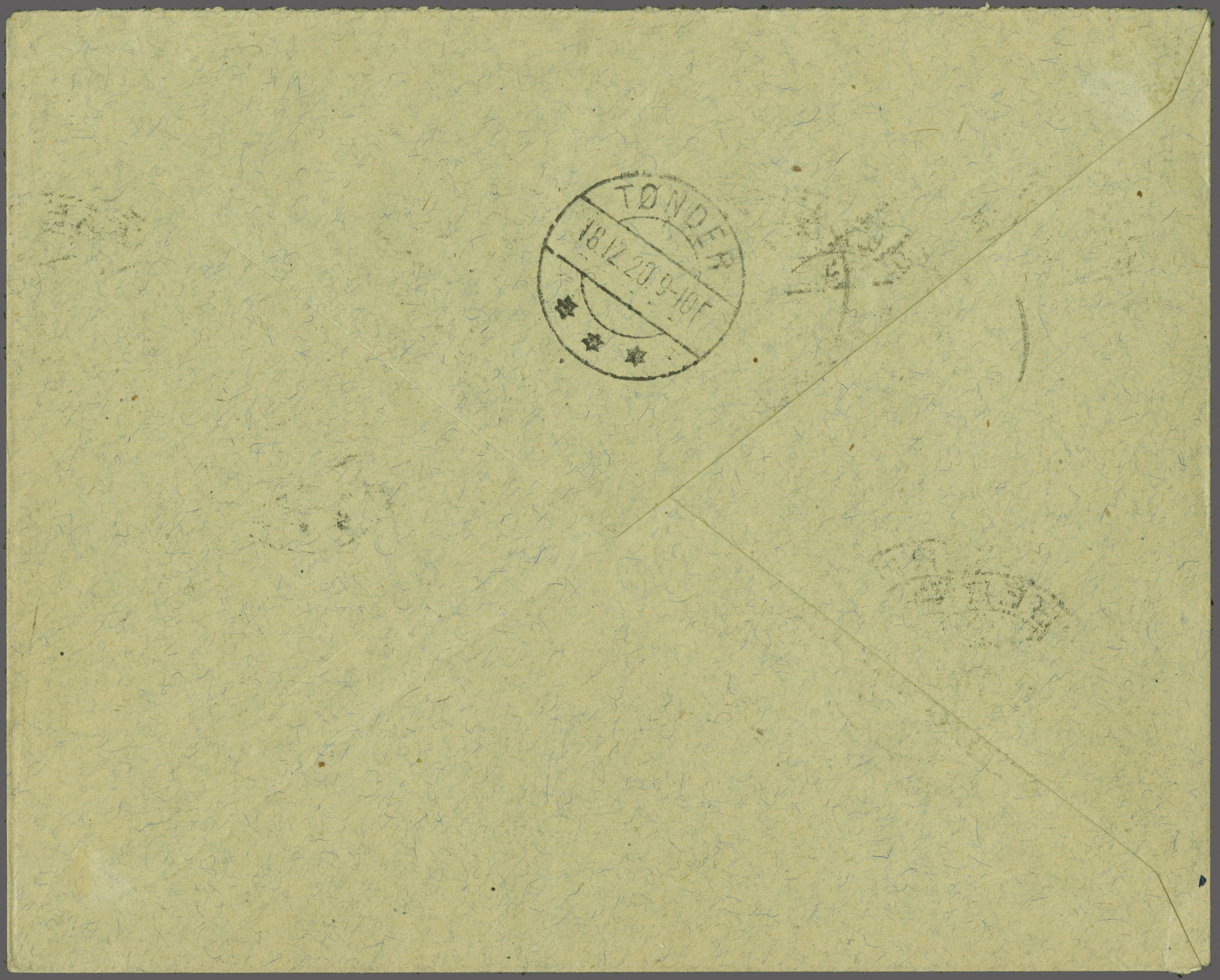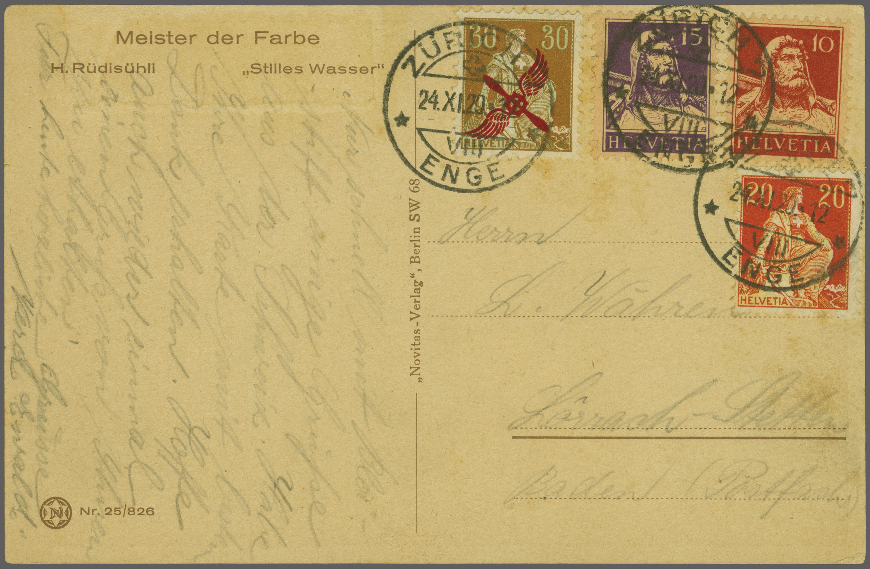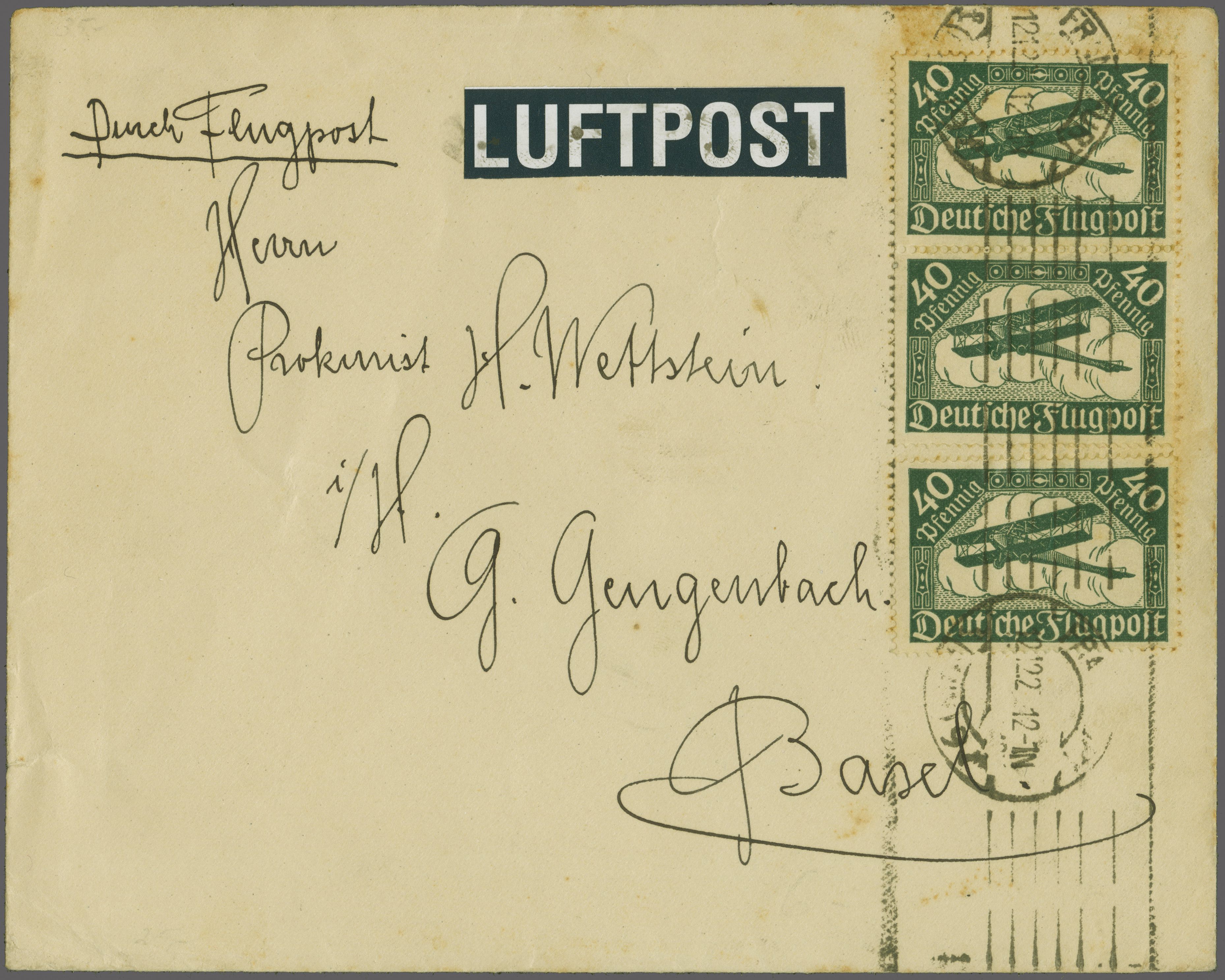 (Zähnung leicht getönt), entw. mit Maschinenstp. "Frankfurt 12.12.20. 12-1N", adressiert an 'Herrn Prokurist Wettstein z/H G. Geugenbach Basel'. Im Dezember konnte wegen schlechter Witterung nur am 24. und 28. Dezember bis Lörrach geflogen werden.