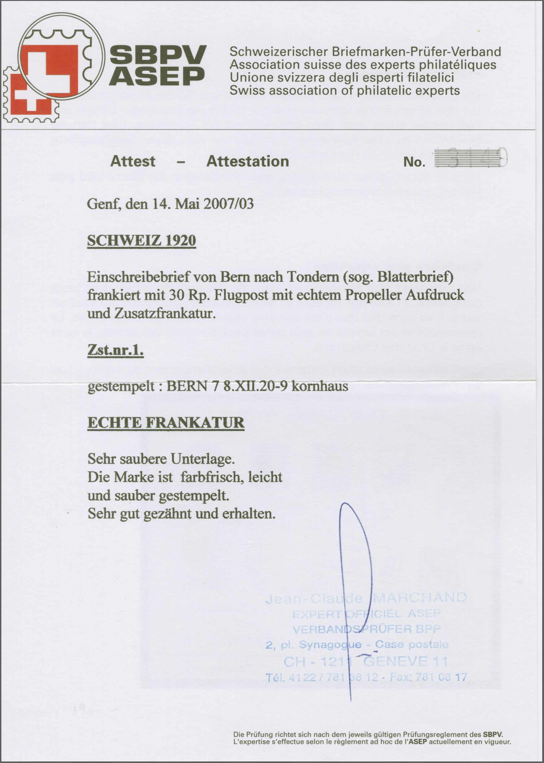 "BERN 7 KORNHAUS 8.XII.20-9", mit beigef. handschriftl. Vermerk: "Mit Flugpost Lörrach-Frankfurt" und Ankunftstp. vom 18.12.20. Obwohl der Brief nicht geflogen wurde, eine seltene Flugpostaufgabe. Attest Marchand (2007) SLH RF 20.1.czII = CHF 3'000