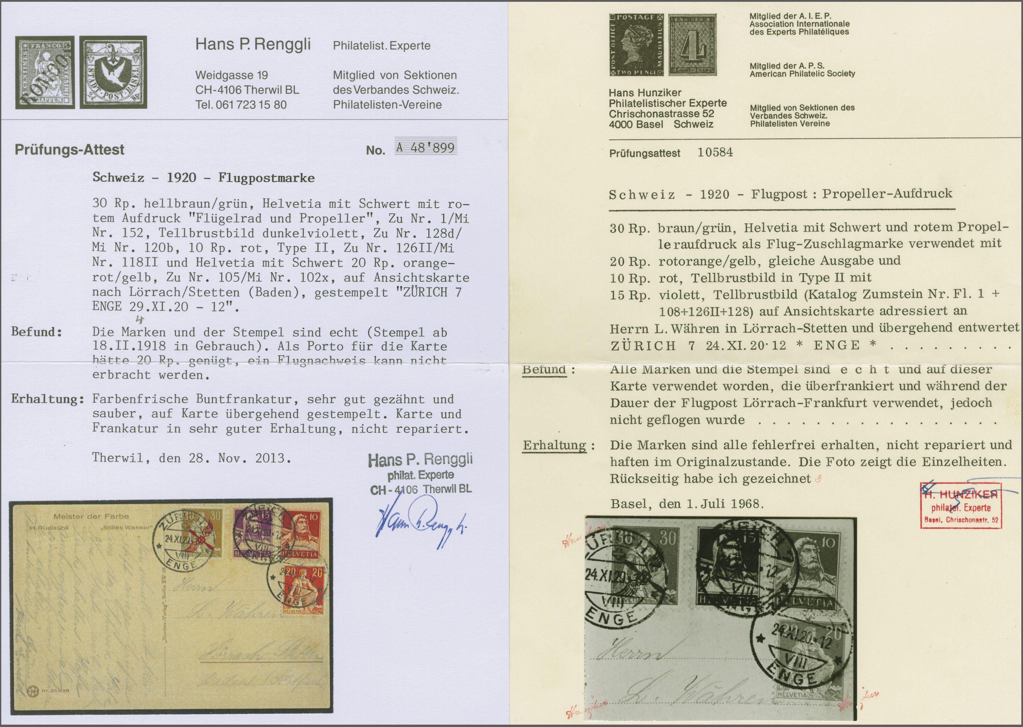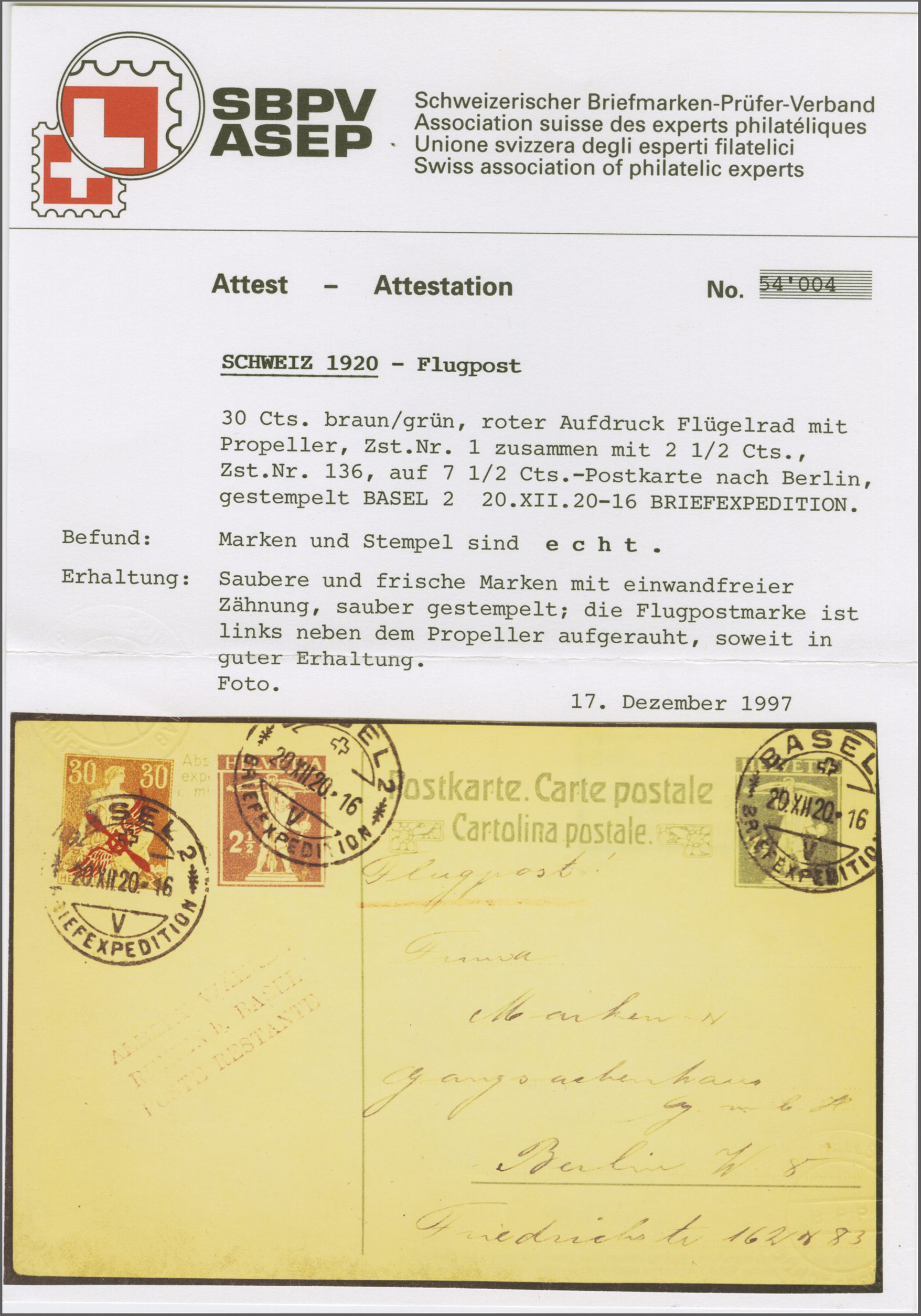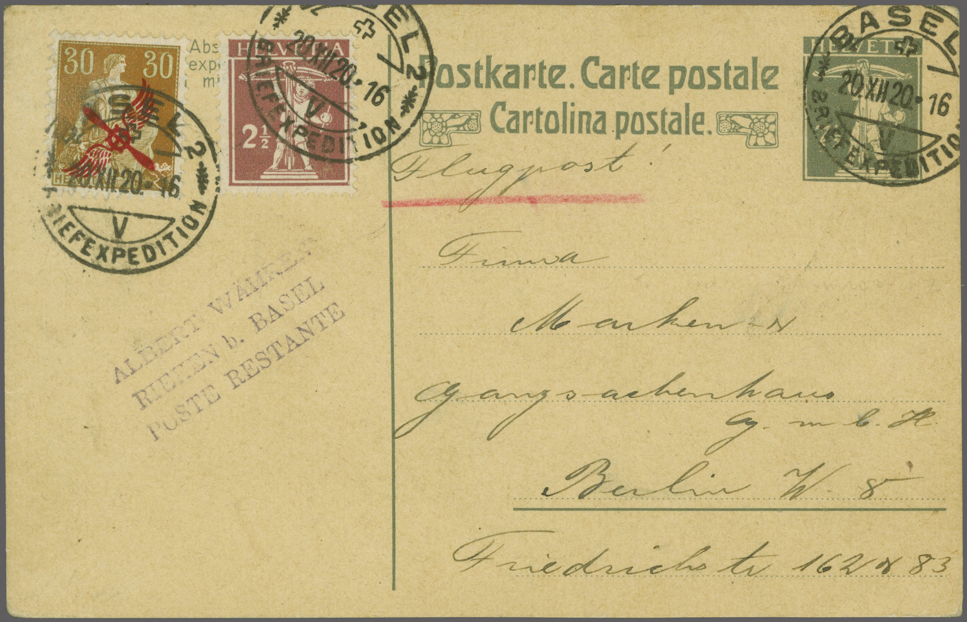 Dazu eine weitere Verwendung auf 7½ Rp. GS-Postkarte mit 2½ Rp. Zusatzfrankatur ab "Basel 2 20.XII.20" nach Berlin mit Attest Rellstab (1997). Zwei saubere Belege, da an beiden Daten keine Flüge stattgefunden haben, wurde die Post per Bahn befördert.