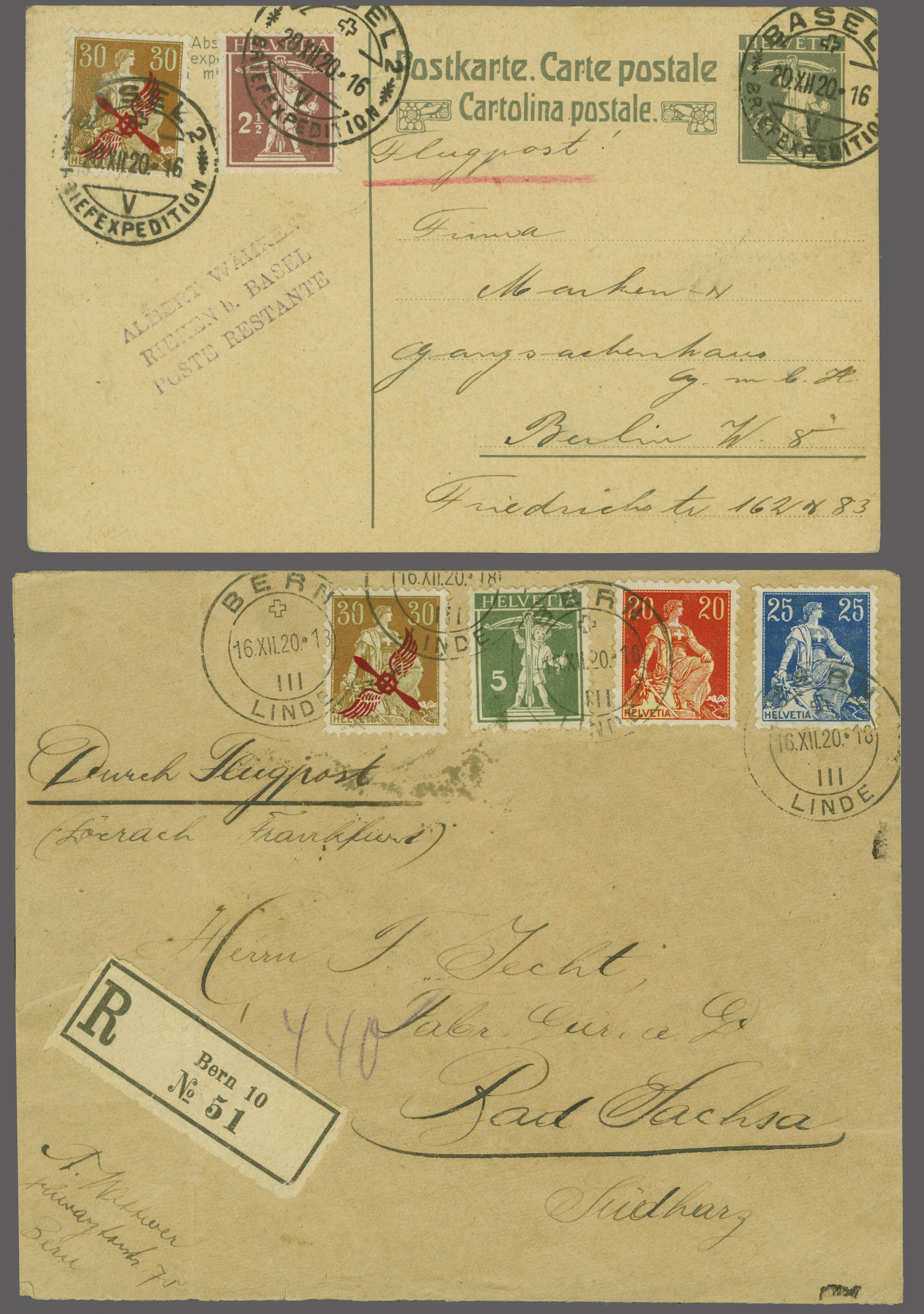 Basel / Lörrach - Frankfurt 1920 (16./20. Dez.): 'Propeller' Aufdruck auf 30 Rp. Helvetia mit Schwert mit Zusatzfrankatur auf R-Brief von "Bern 10 Linde 16.XII.20" nach Bad Sachsa, Südharz mit rücks. AStp. vom 18. Dezember.