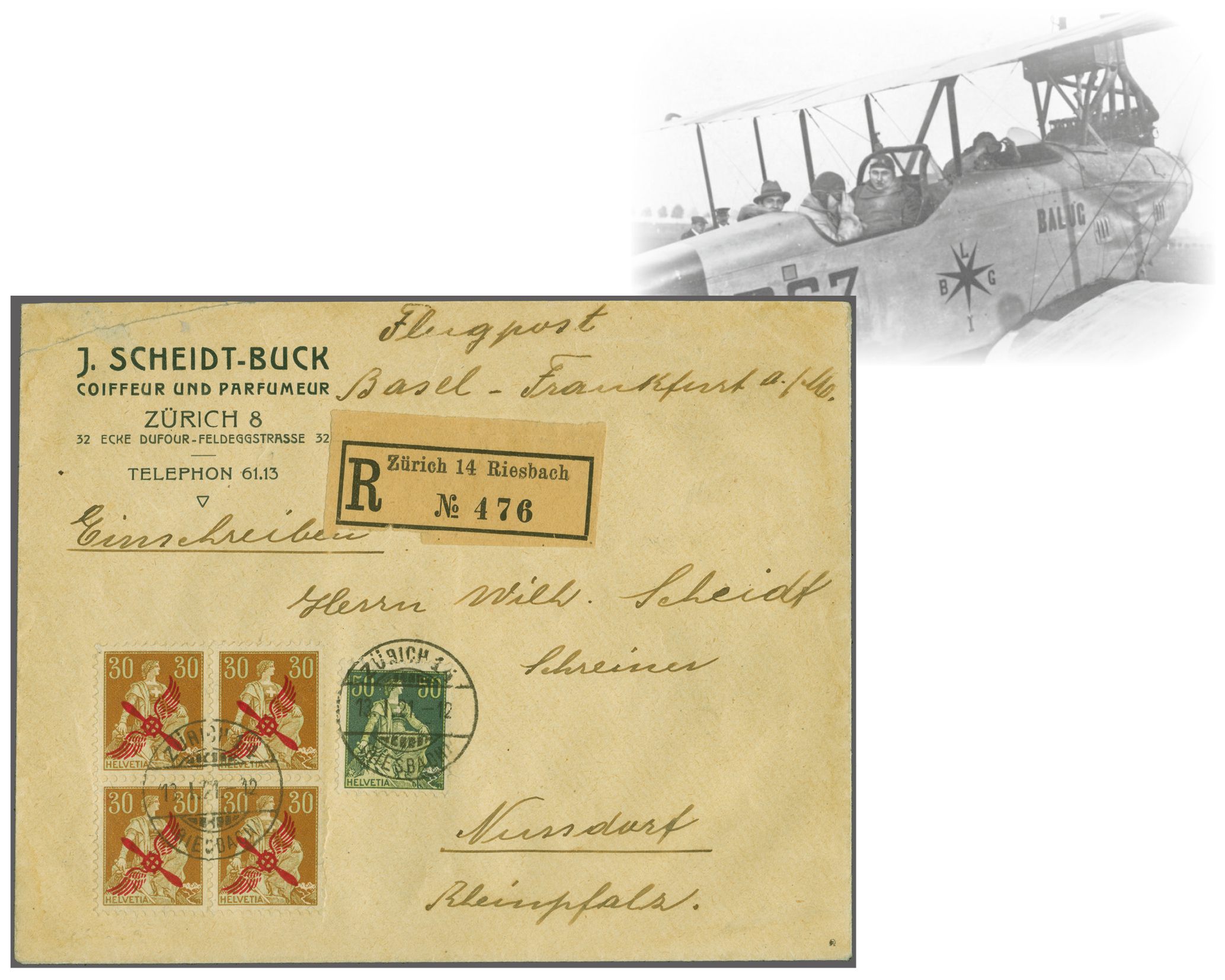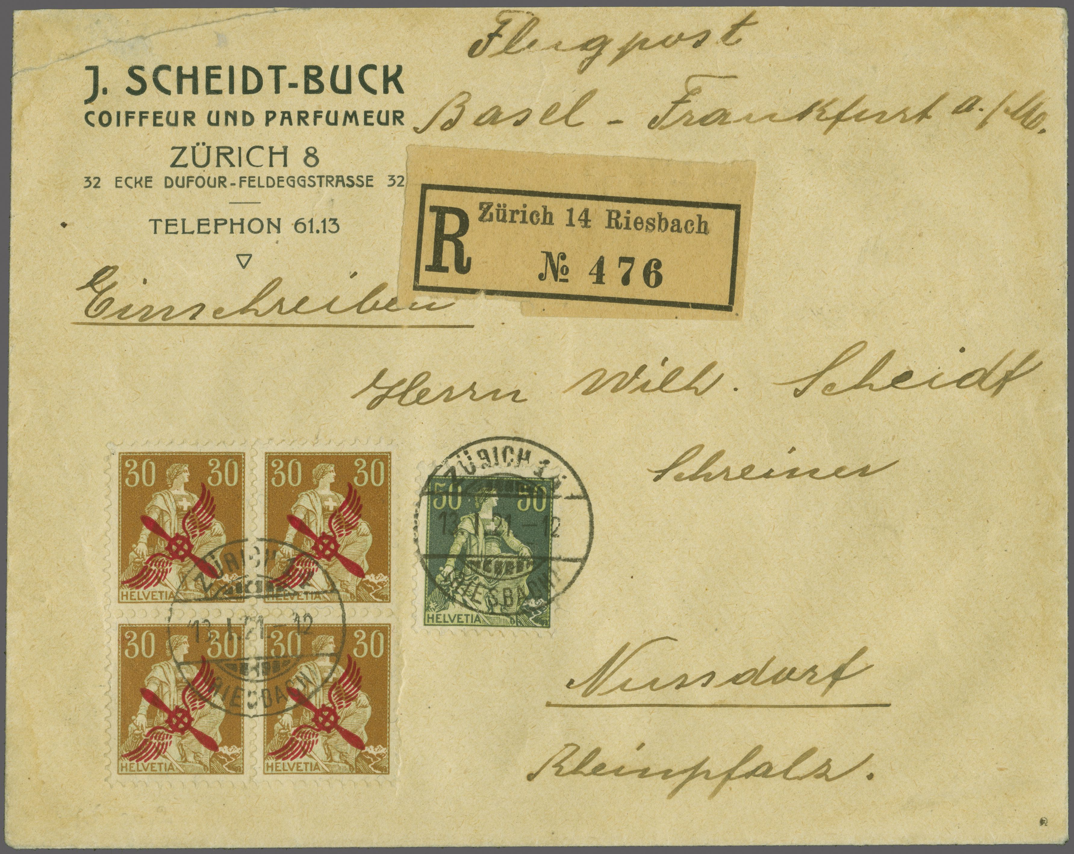 BALUG Linie Basel / Lörrach - Frankfurt 1921 (13. Jan.): 'Propeller' Aufdruck auf 30 Rp. Helvetia mit Schwert im zentrisch entw. Viererblock, plus Helvetia mit Schwert 50 Rp. gest. "Zürich 11 13.I.21 12 Riesbach" nach Nussdorf