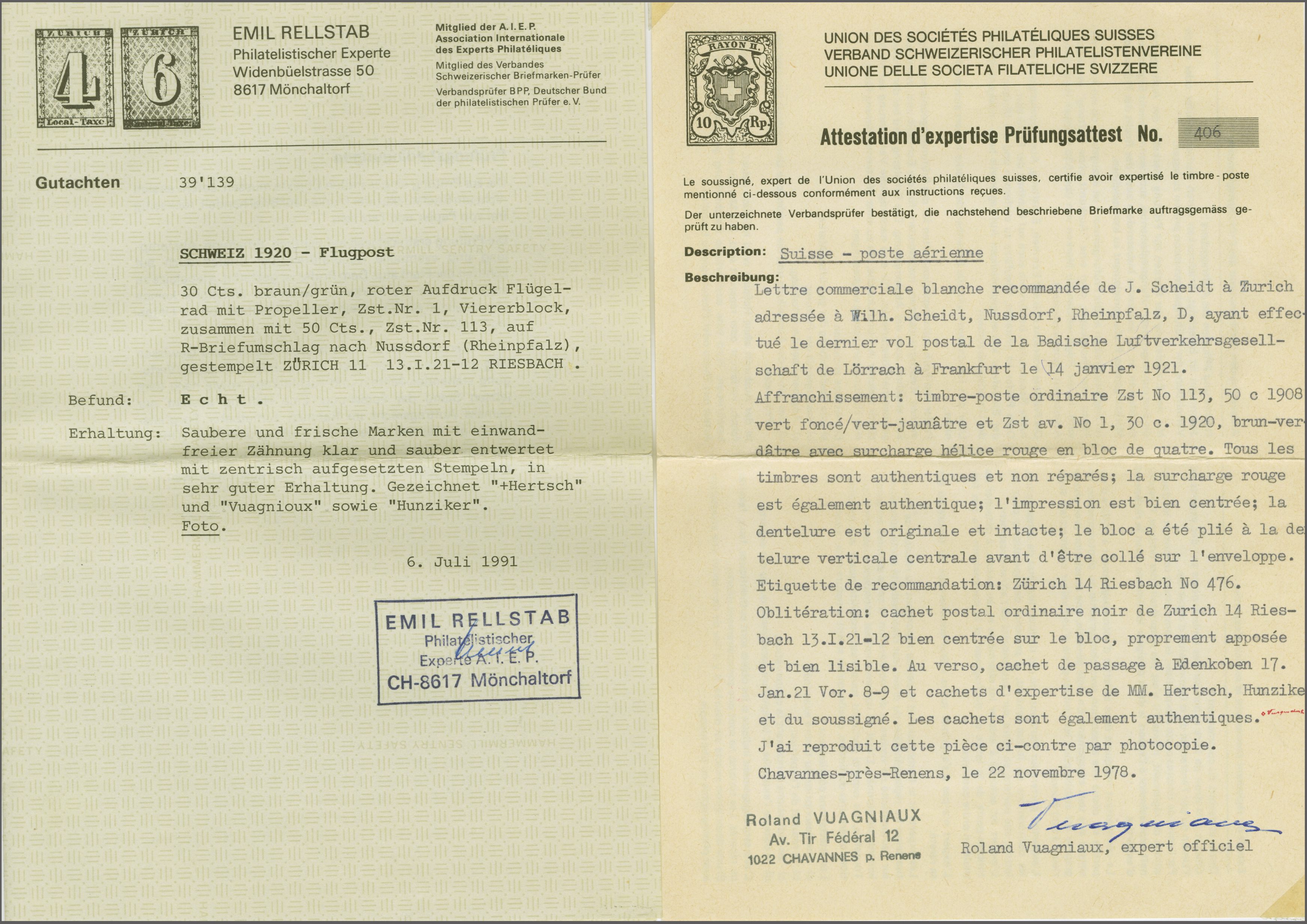 November 2021 angeboten (Los 1121) Atteste von Zumstein (1966) und Renggli (1991) SLH = CHF 5'000 (Image 1)