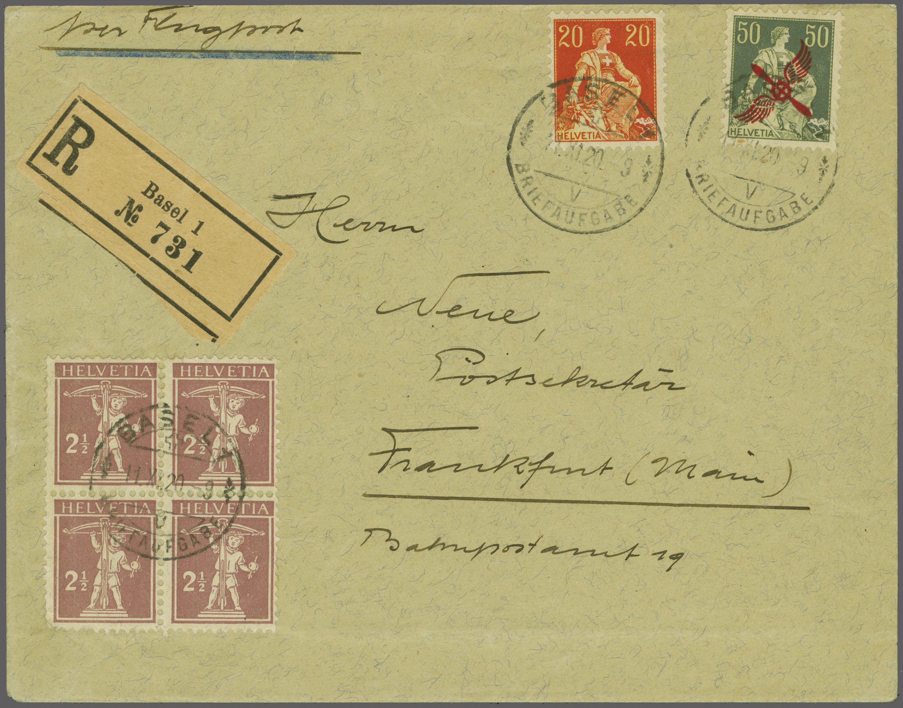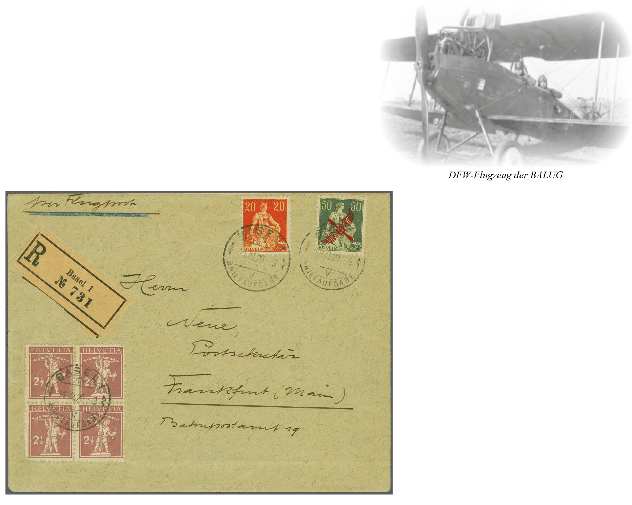 Eröffnung der BALUG Linie Lörrach - Frankfurt 1920 (11. Nov.): 'Propeller' 50 Rp. grün mit Zusatzfrankatur Helvetia mit Schwert 20 Rp. plus 2 ½ Rp. im Viererblock sauber entw. "Basel 1 Briefaufgabe 11.XI.20-9" auf
