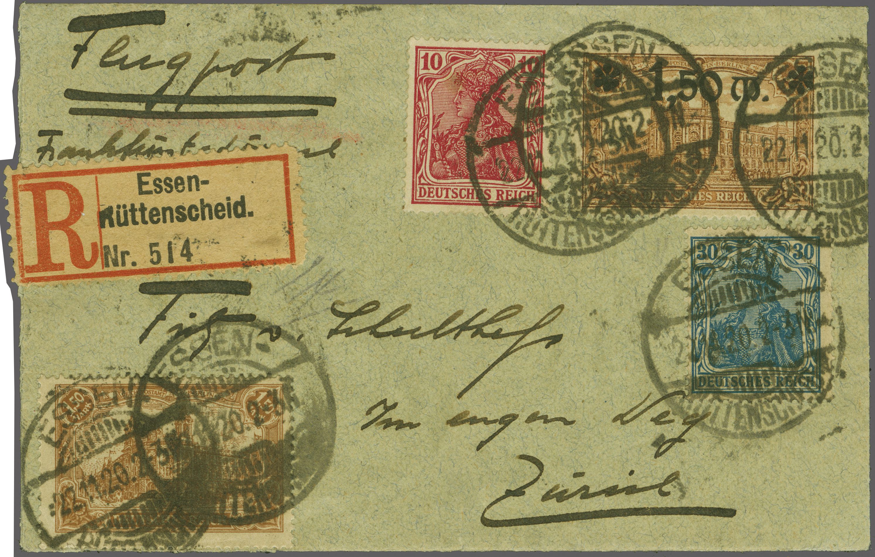 BALUG Linie Frankfurt - Basel / Lörrach, Deutsche Post 1920 (22. Nov.): Kleinformatiger R-Brief ab Essen-Rüttenscheid mit vorders. Frankatur aufgegeben zum Flug ab Frankfurt mit handschriftl. Vermerk Flugpost / Frankfurt -