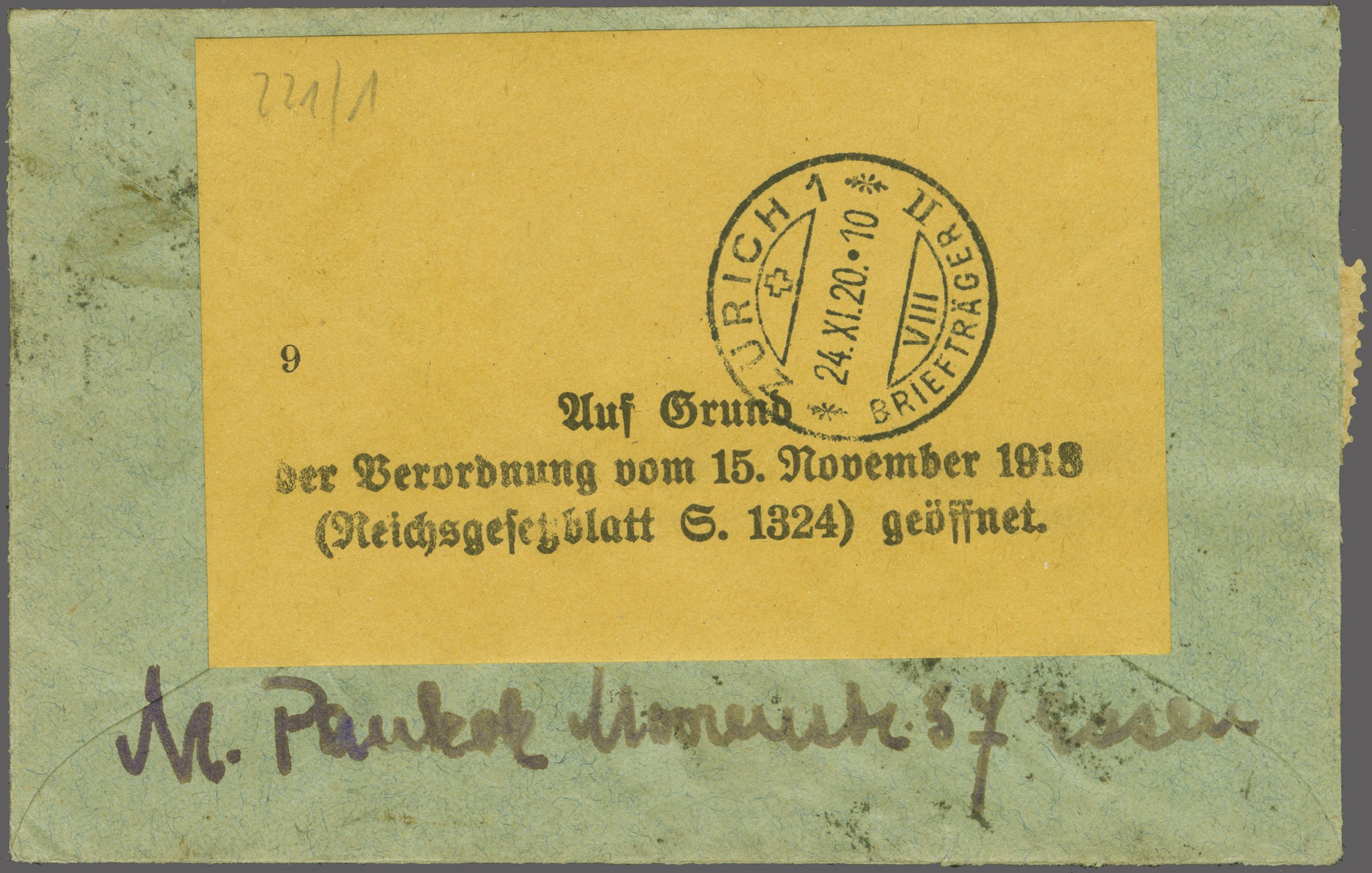 Lörrach mit rücks. Astp. "Zürich 1 Briefversand 24.XI.20.10 Briefträger" auf Vermerkzettel: "Auf Grund der Verordnung vom 15. Nov. 1918 ... geöffnet". Ein seltene Zuleitung. Ein weiterer Brief dieser Korrespondenz befand sich in der Sammlung IKARUS