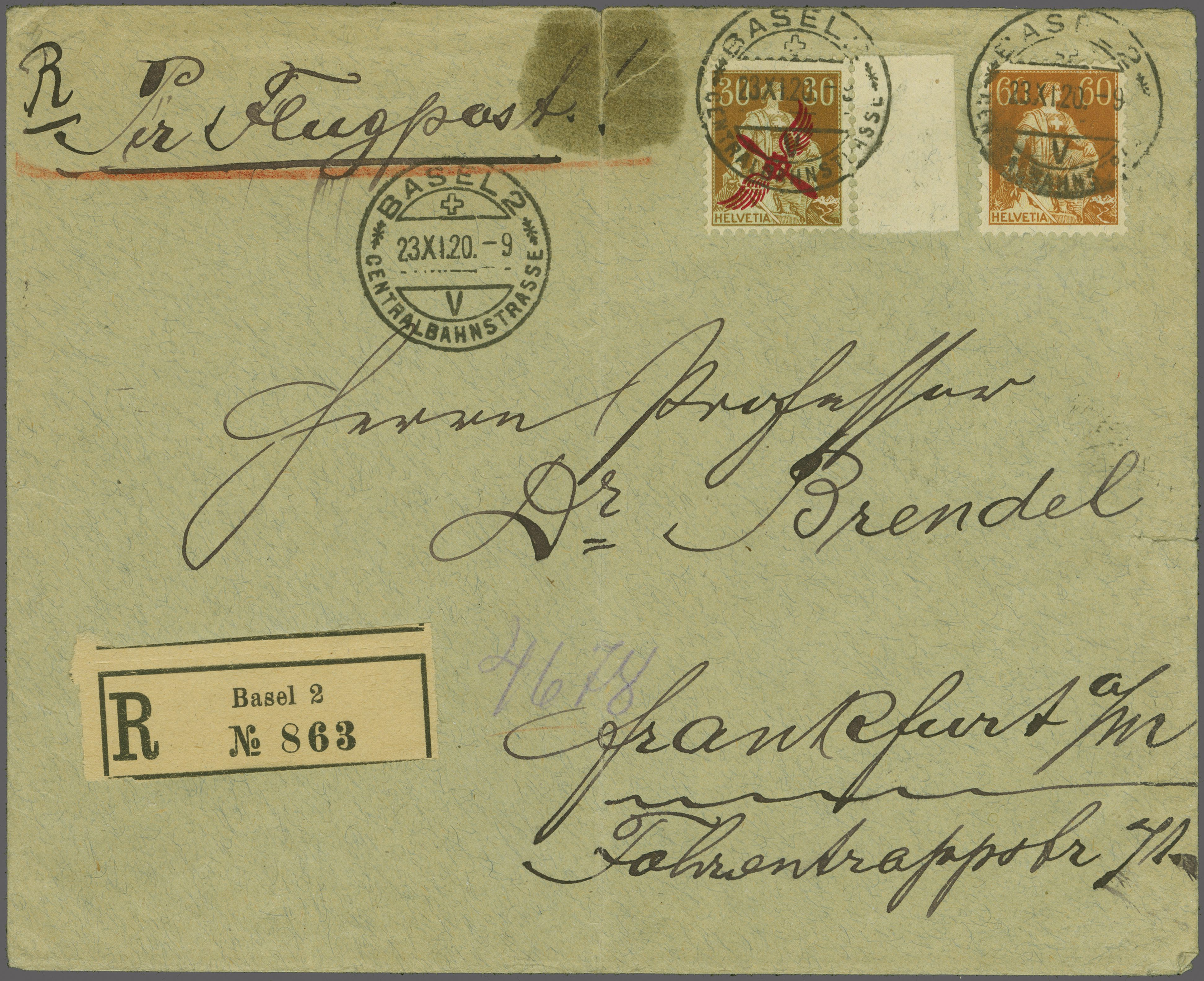 BALUG Linie Basel / Lörrach - Frankfurt 1920 (23. Nov.): 'Propeller' 30 Rp. vom rechten Bogenrand plus Helvetia mit Schwert 60 Rp. braun gest. "Basel 2 Centralbahnstrasse 23.XI.20-9" auf R-Brief (R-No. 863) nach Frankfurt mit