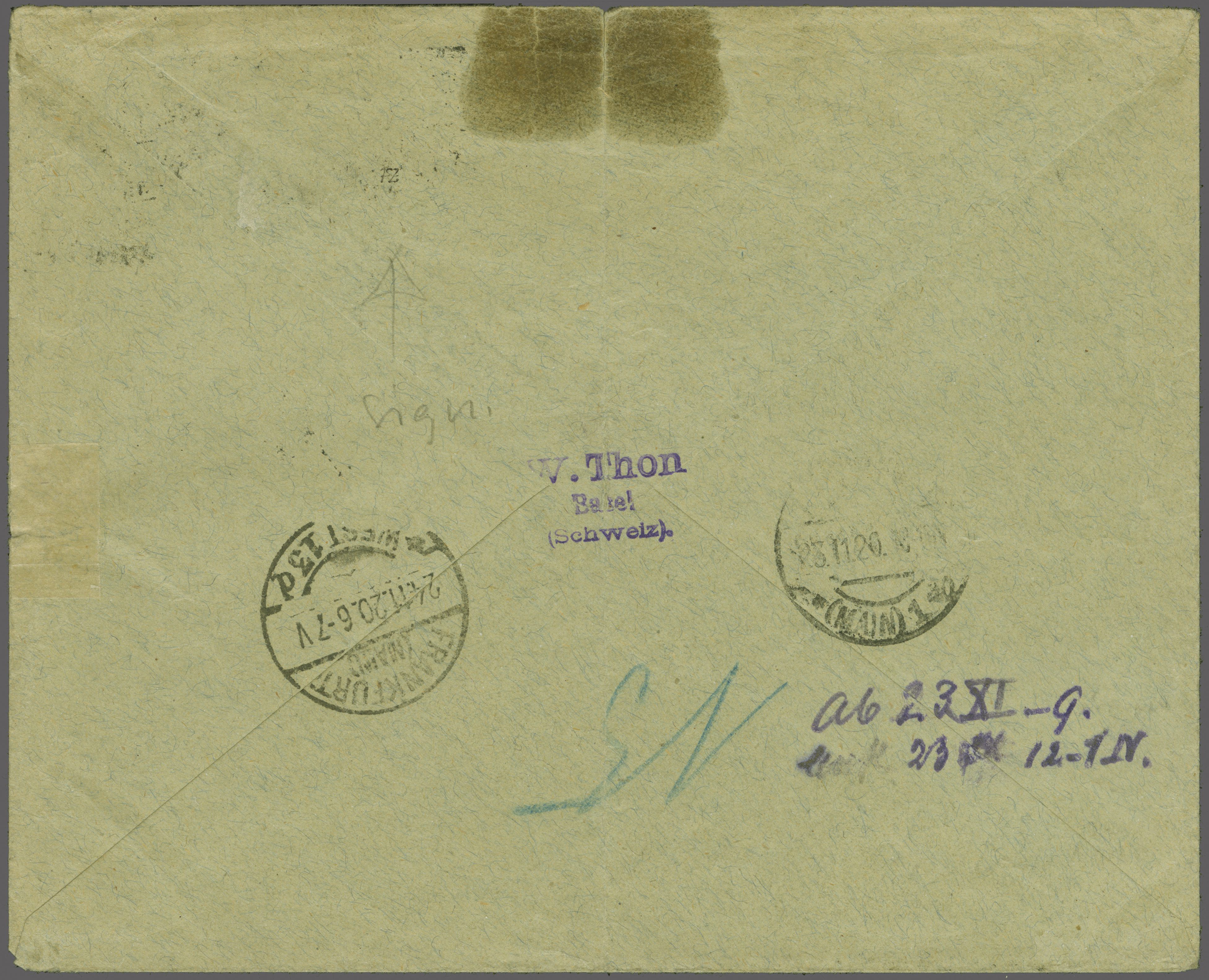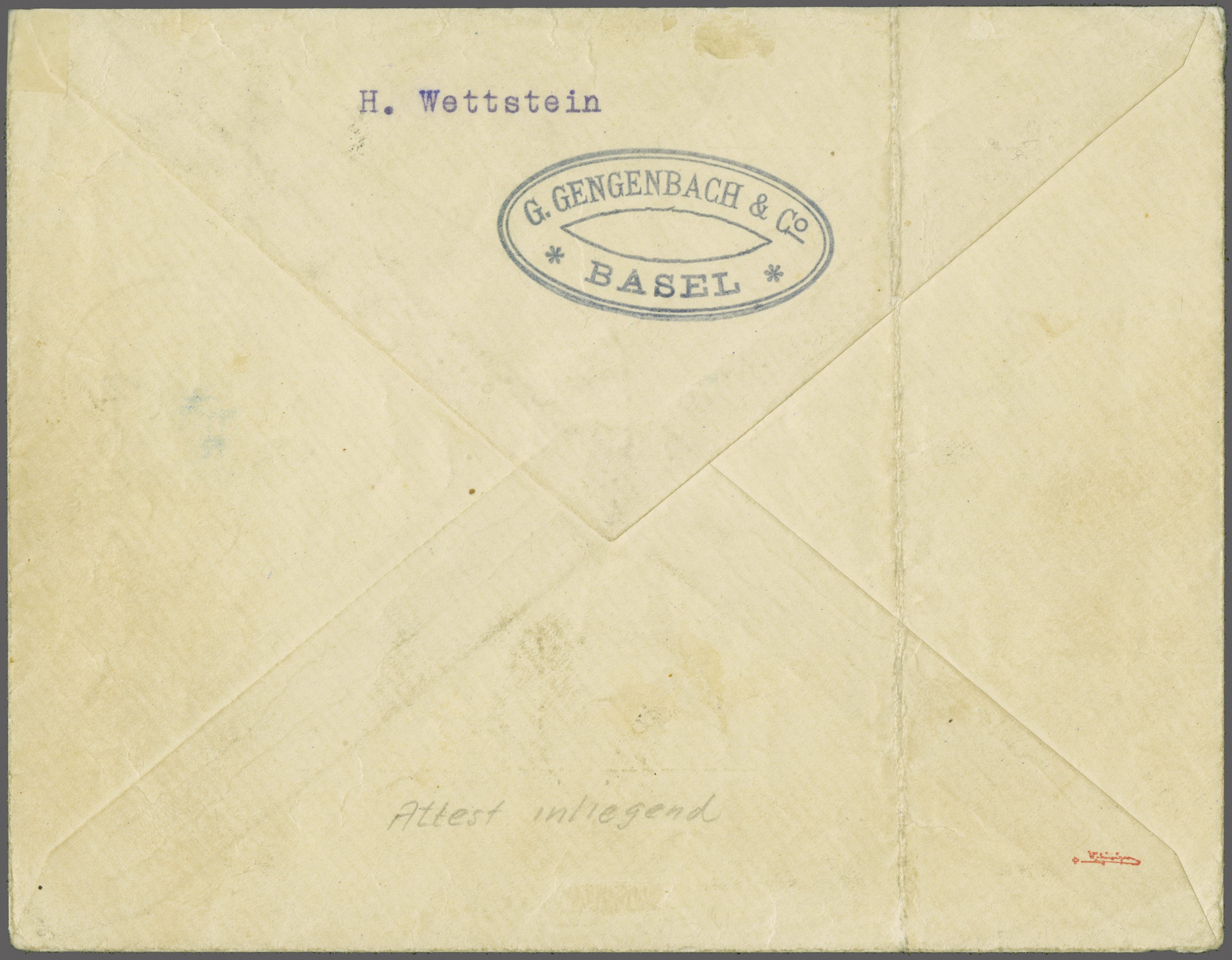 W. Thon war ein bekannter Flugpostsammler in Basel und legte stets Wert auf echt geflogene Belege. Ein weiterer Brief (ebenfalls senkr. gefaltet) der selben Korrespondenz mit Einschreibenummer '865' wurde in der Sammlung IKARUS bei Corinphila