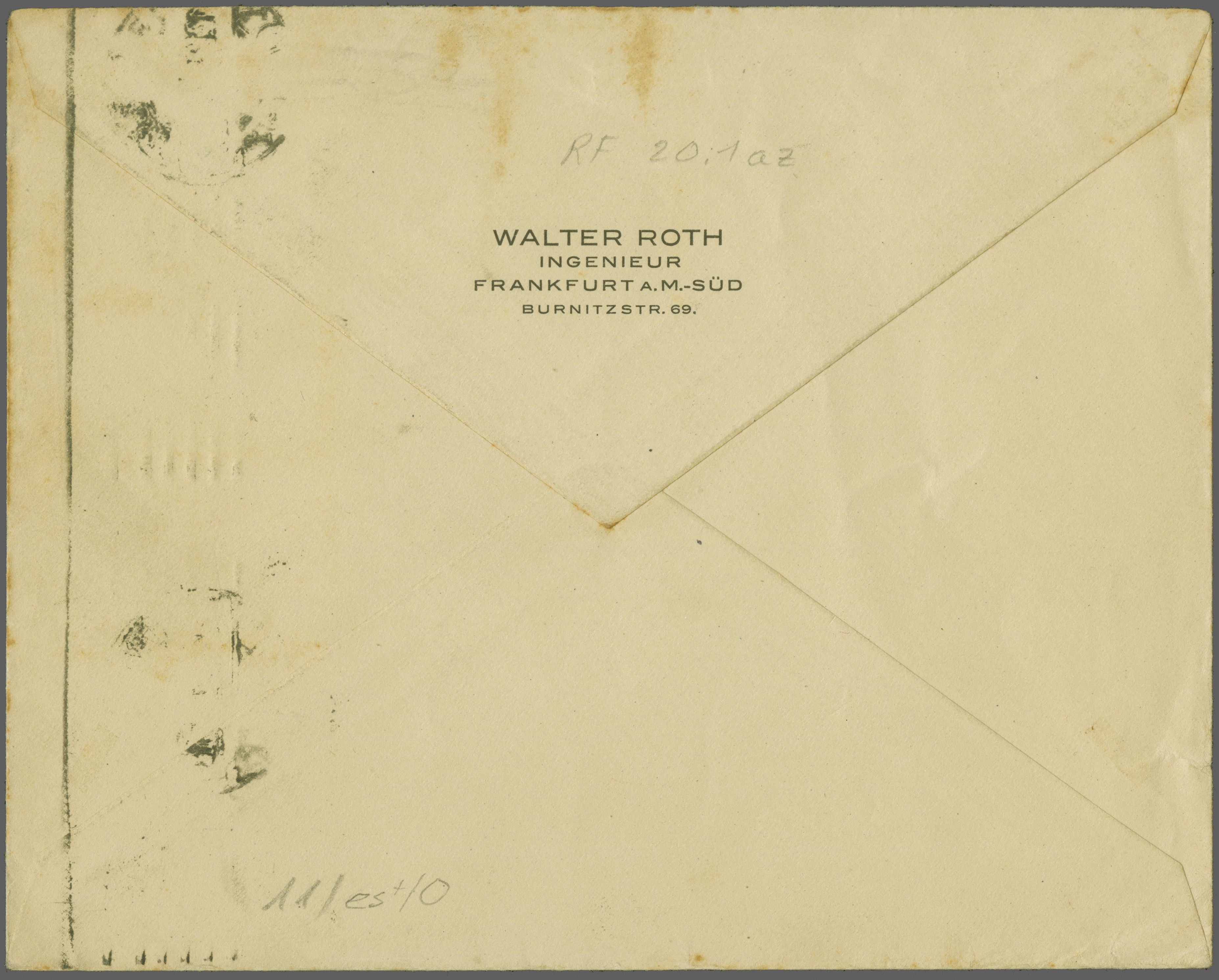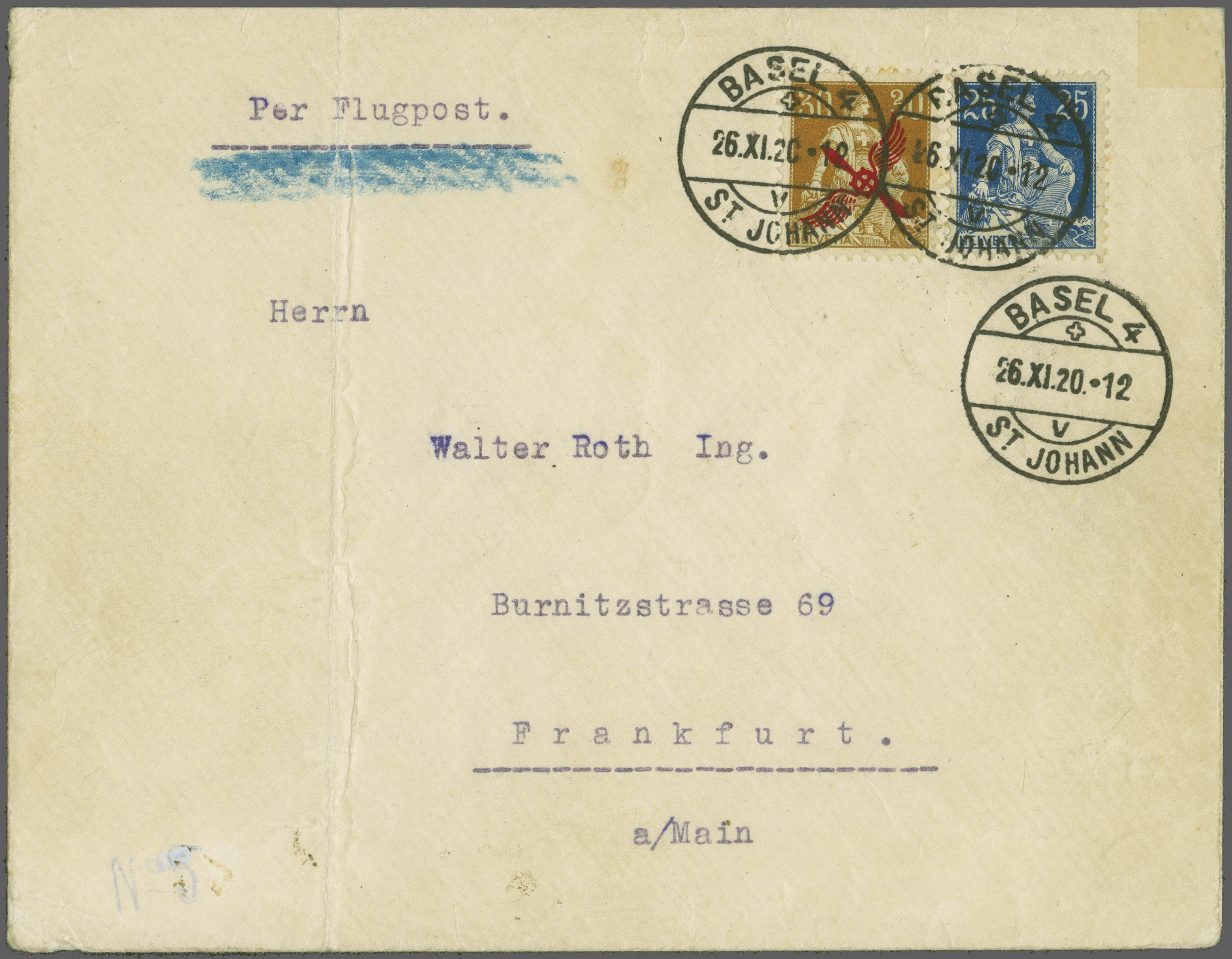 Flugpost' adressiert an Walter Roth Ing. in Frankfurt a. Main. Briefhülle ehem. senkr. gefaltet, die Frankatur jedoch nicht tangierend. Da der Flug am 26. Nov. 1920 bereits um 11.00 Uhr gestartet war, wurde der Brief am darauffolgenden Tag von
