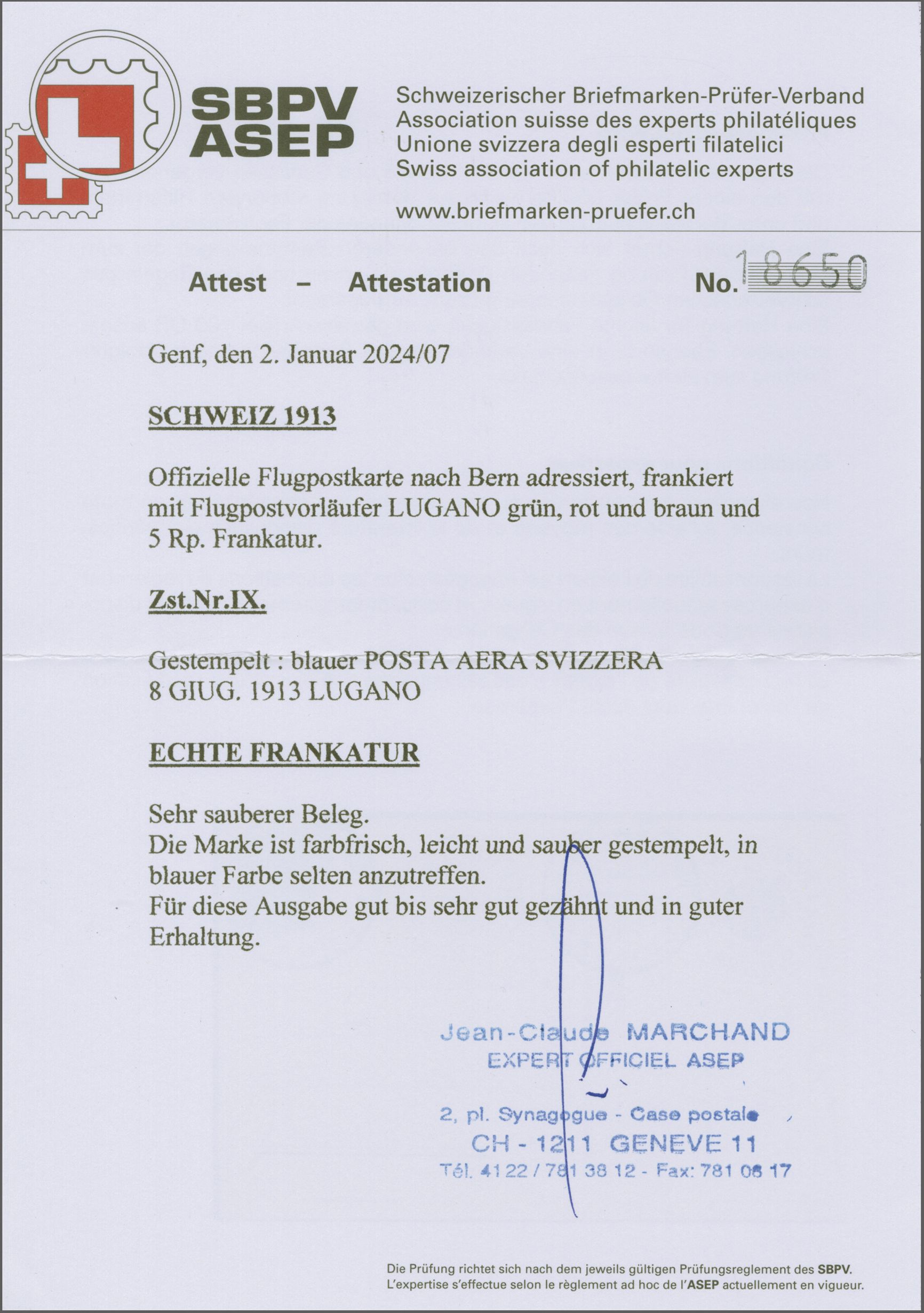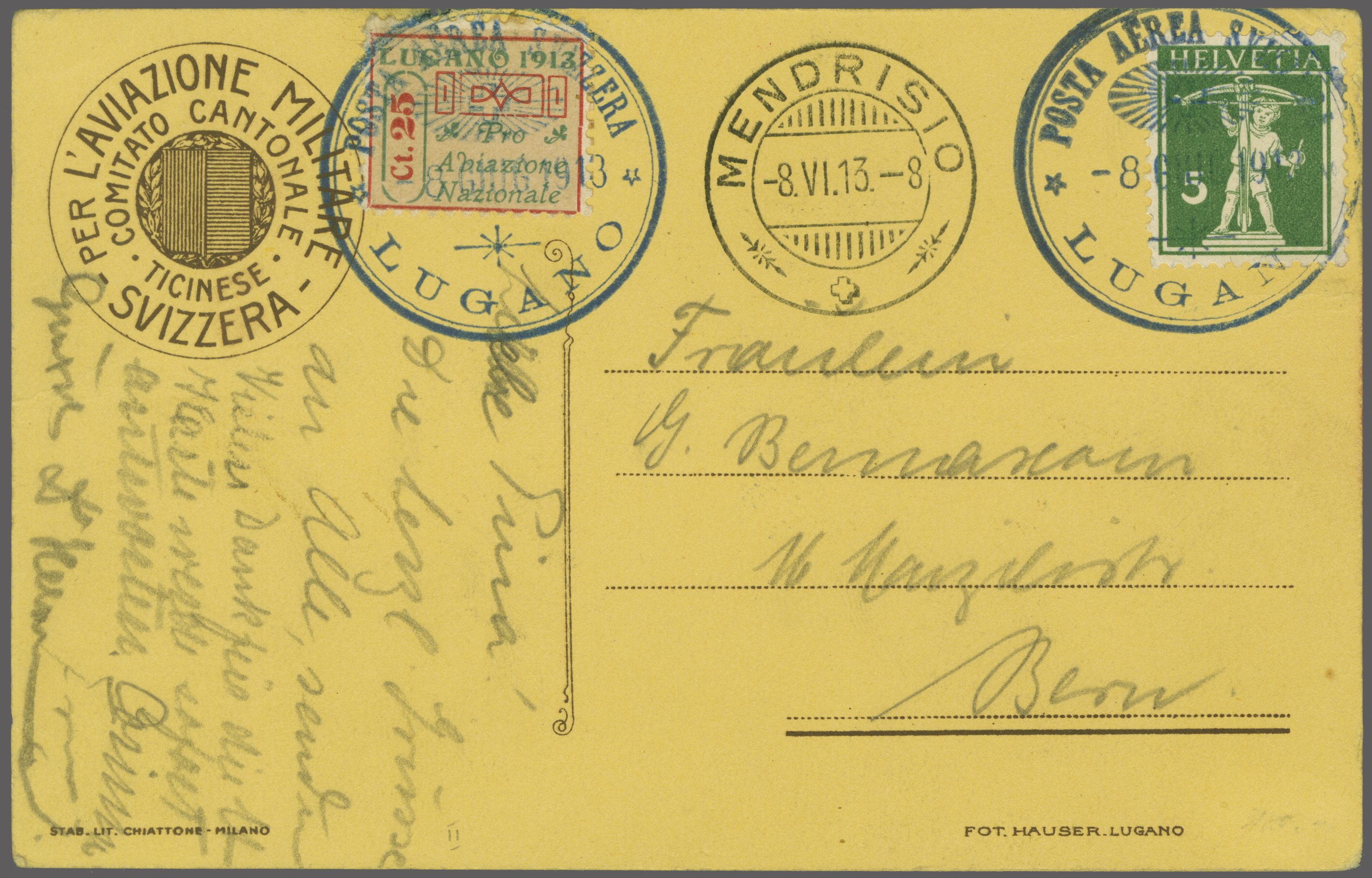 "POSTA AEREA SVIZZERA 8 GIUG. 1913 LUGANO", daneben klar "MENDRISIO -8.VI.13-8". Ein prächtiges Stück! Attest Marchand (2024). SLH= CHF = 5'000 (Image