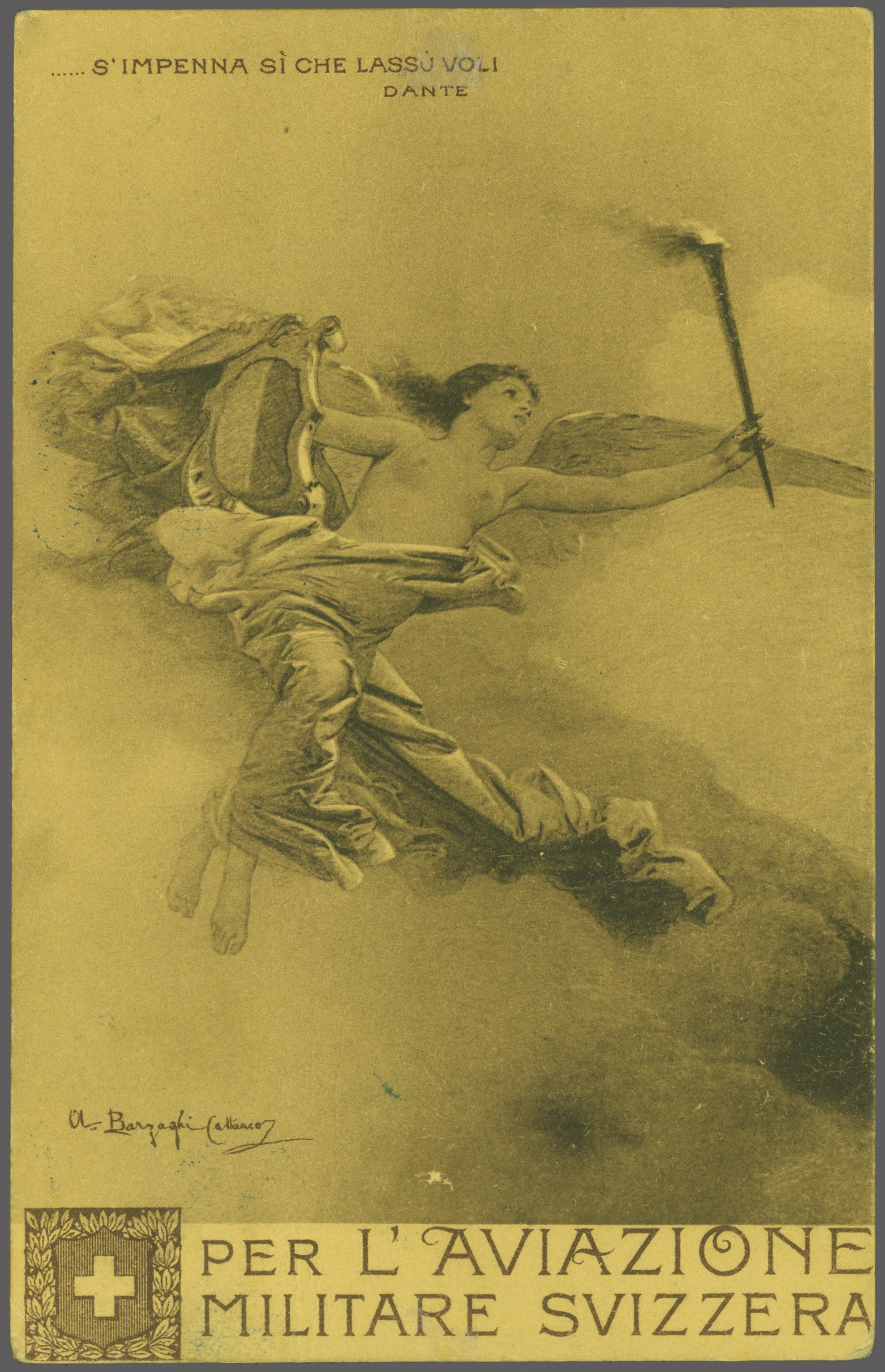 1913: Flugtag Lugano. Offizielle Karte 'fliegenden Allegorie mit Tessinerwappen und Fackel' (SLH OK 1), adressiert nach Bern. Frankiert mit Vorläufer und 5 Rp. Tellknabe (125III), jeweils entwertet mit seltenem blauen Stempel
