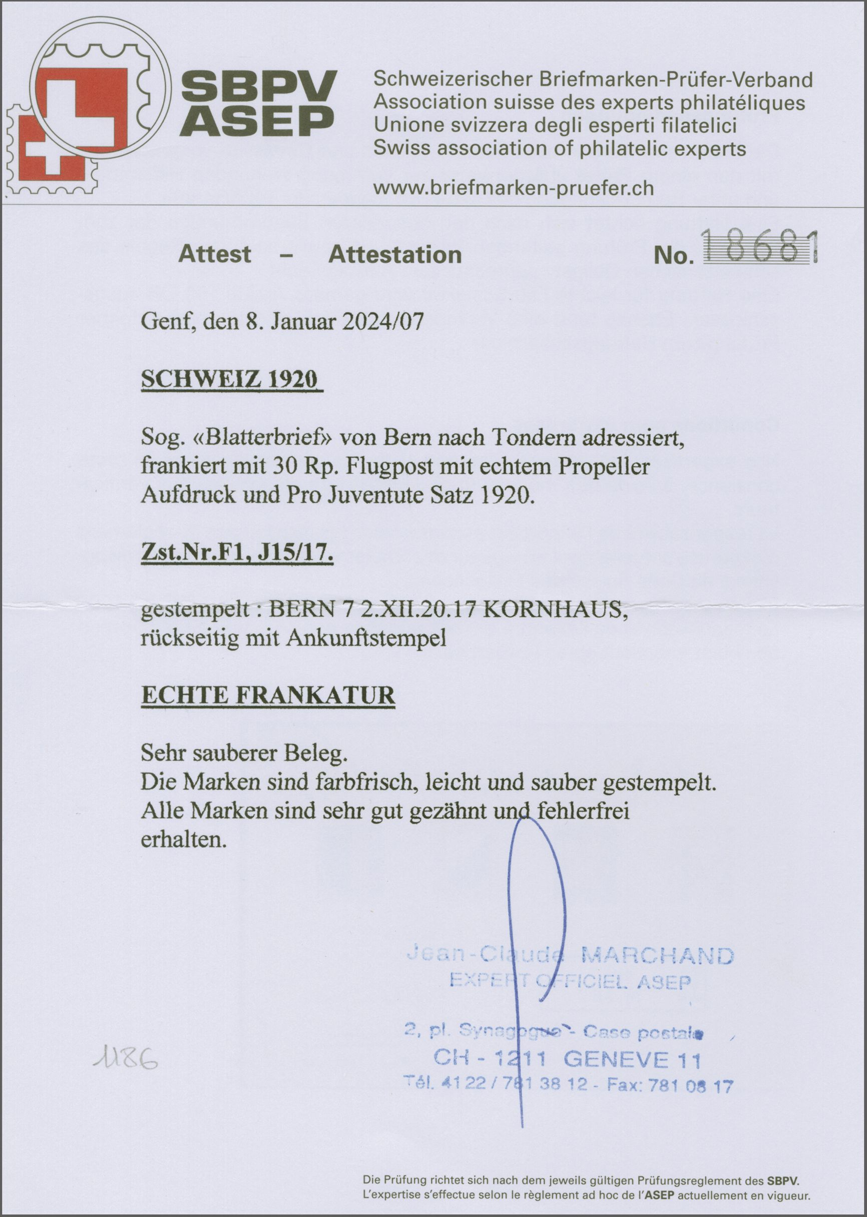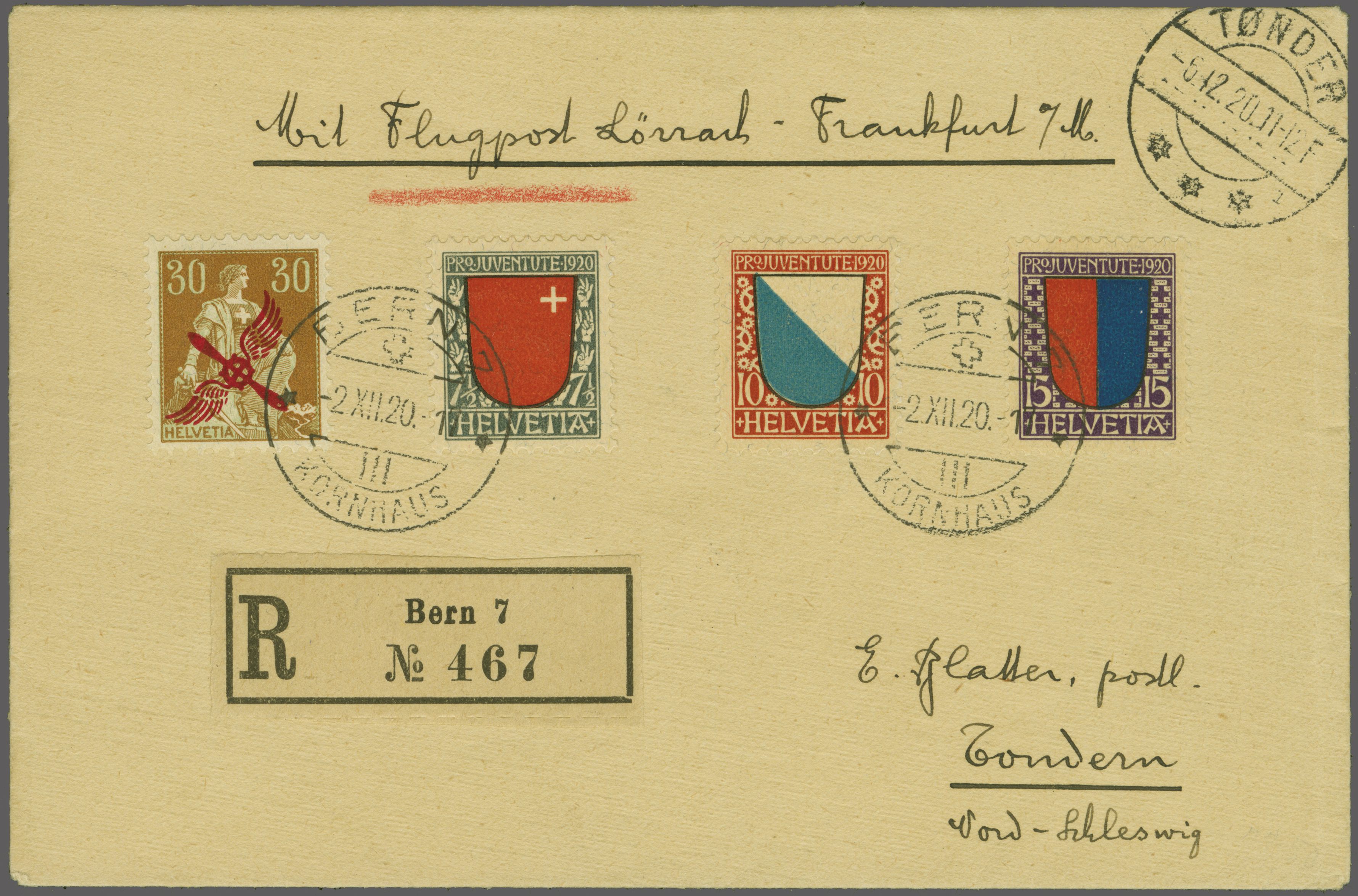 1920 (2.XII.20): Schöner Tondern-Brief eingeschrieben, postlagernd an E. Blatter, frankiert mit 30 Rp.- Flugpostmarke und mit Pro Juventute Satz 1920, gestempelt "BERN 7 -2.XII.20.17 KORNHAUS" vorder- u- rückseitig mit