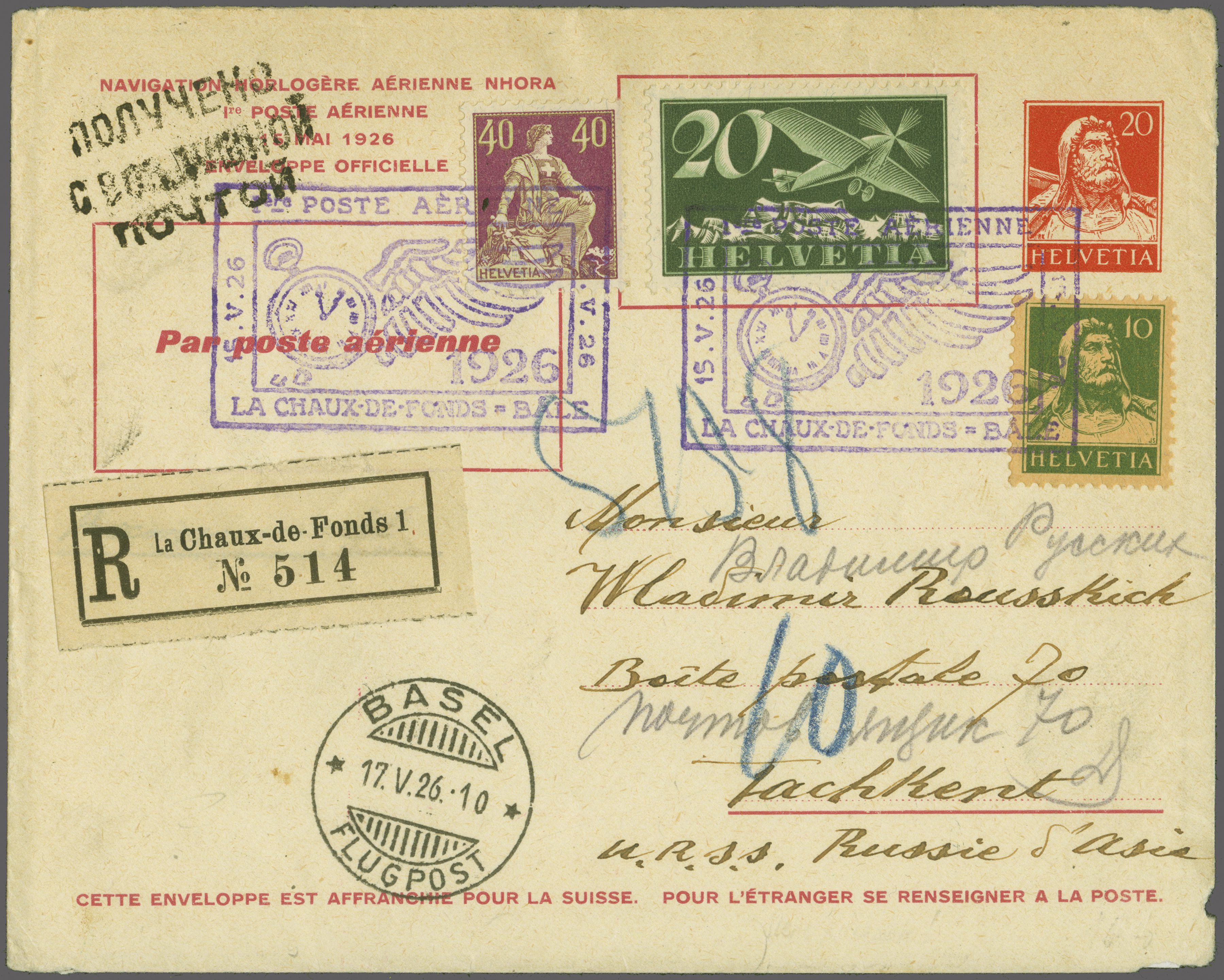 NHORA - Sowjetunion 1926 (17. Mai): NHORA Erstflug La Chaux-de-Fonds - Basel, eingeschriebener NHORA Ganzsachenbrief zu 20 Rp. nach Taschkent (Usbekistan) mit portorichtiger Zusatzfrankatur zu 70 Rp., sauber entw.mit SStp. ab