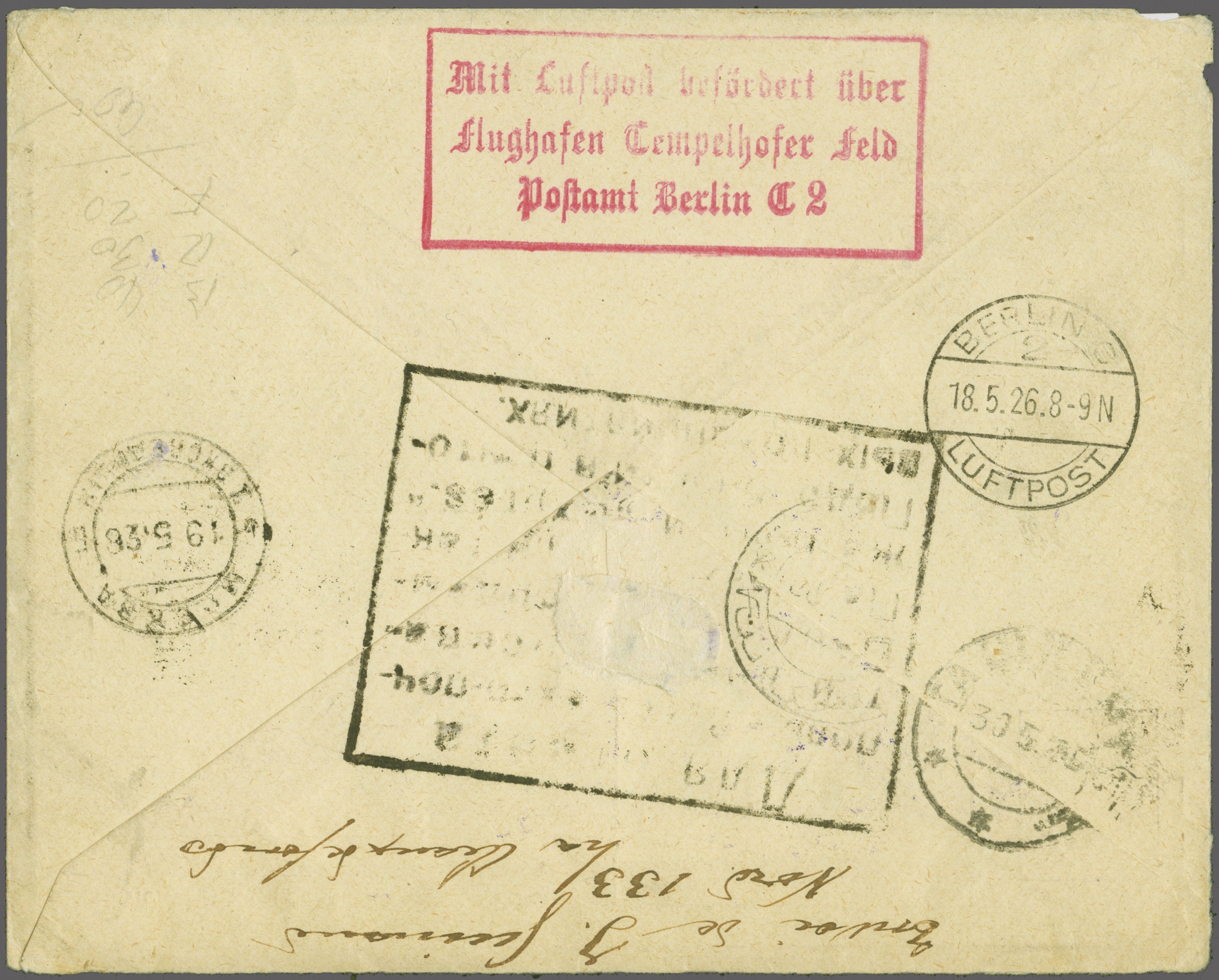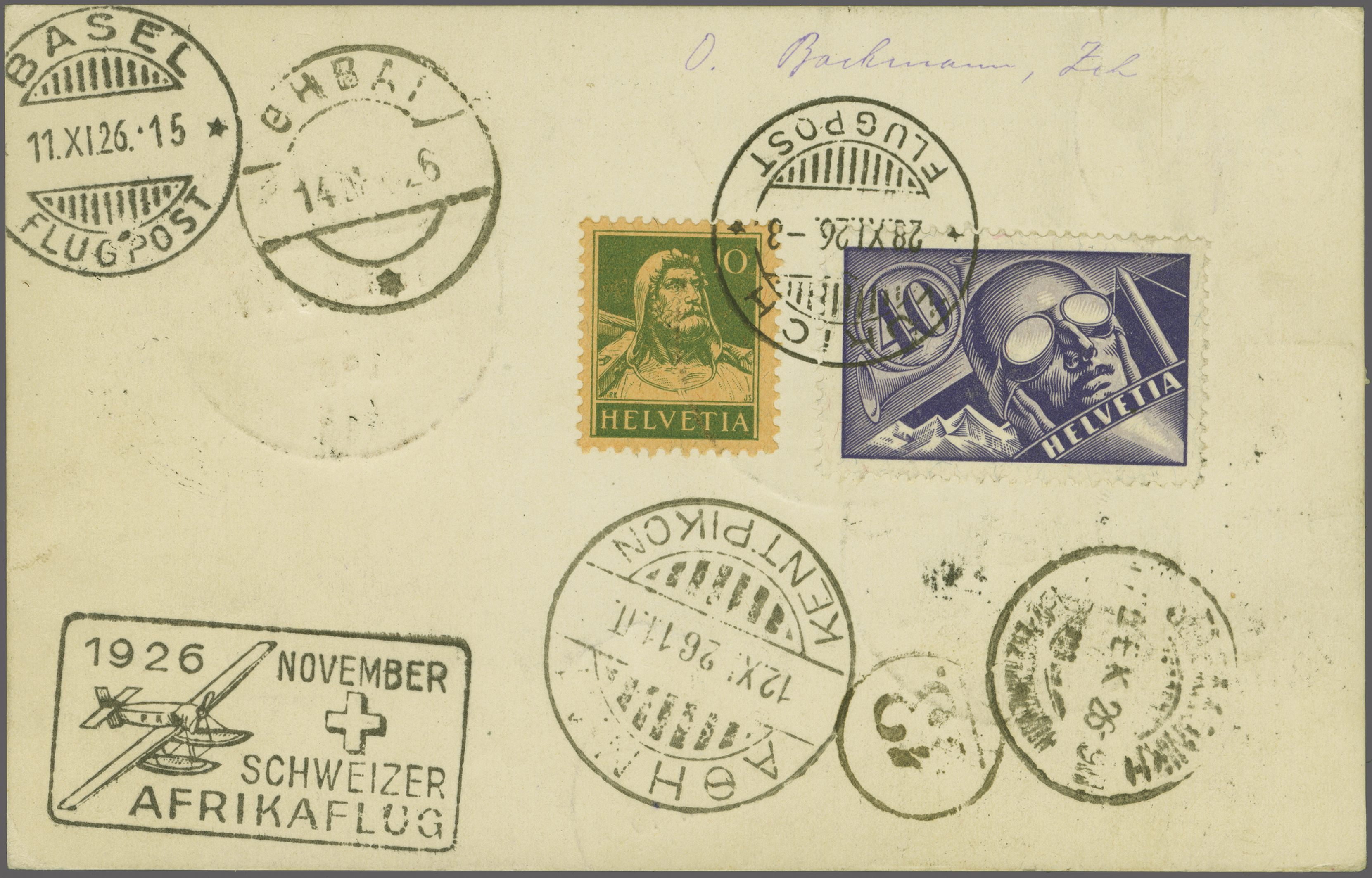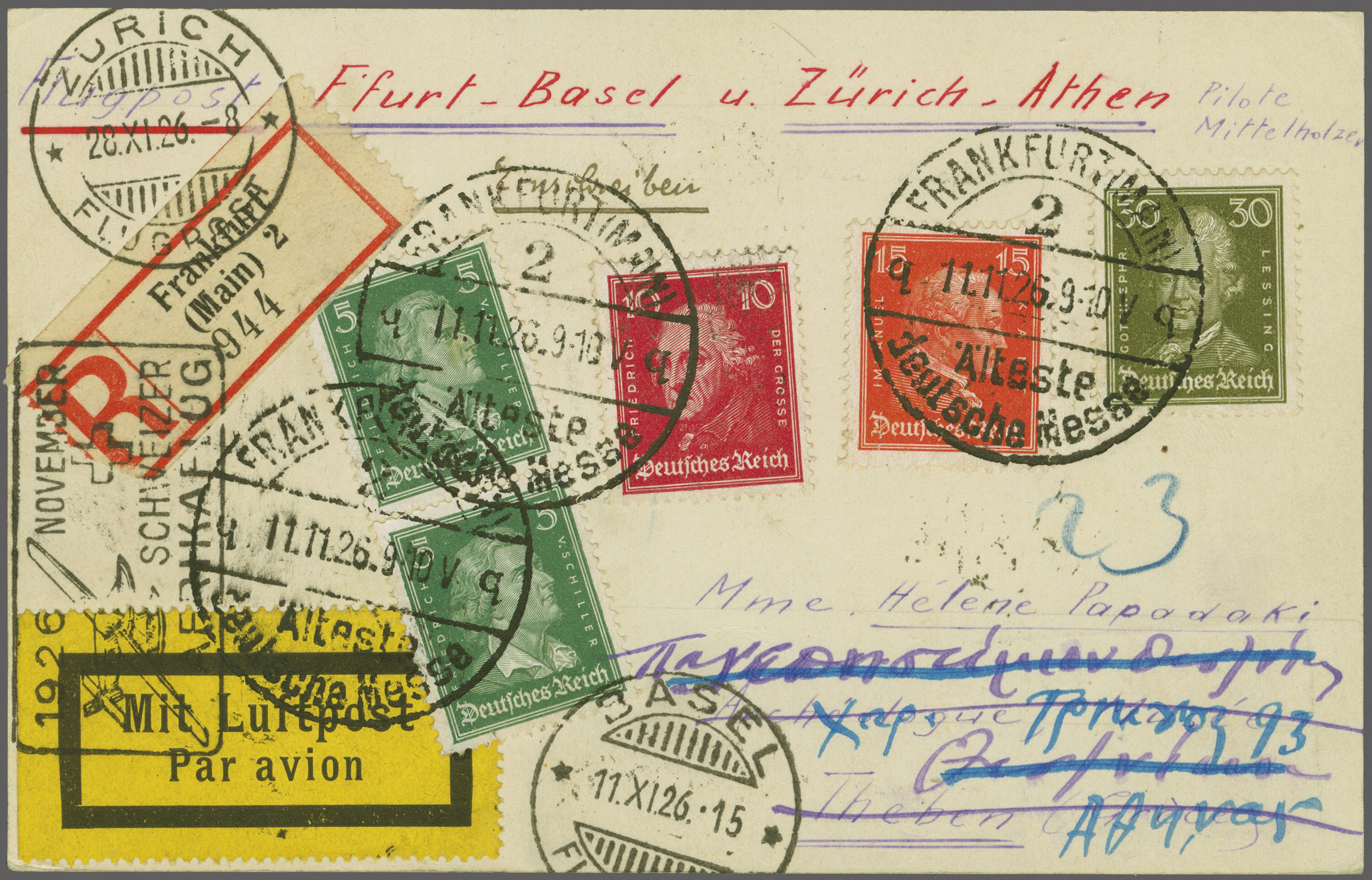1. Schweizer Afrikaflug Etappe Zürich - Athen 1926 (7. Dez.): Eingeschr. Karte ab "Frankfurt Messe 11.11.26" mit Dt. Frankatur, zugleitet via "Basel Flugpost 11.XI. 16.15" zum 1. Mittelholzer Afrikaflug, in Zürich zusätzlich