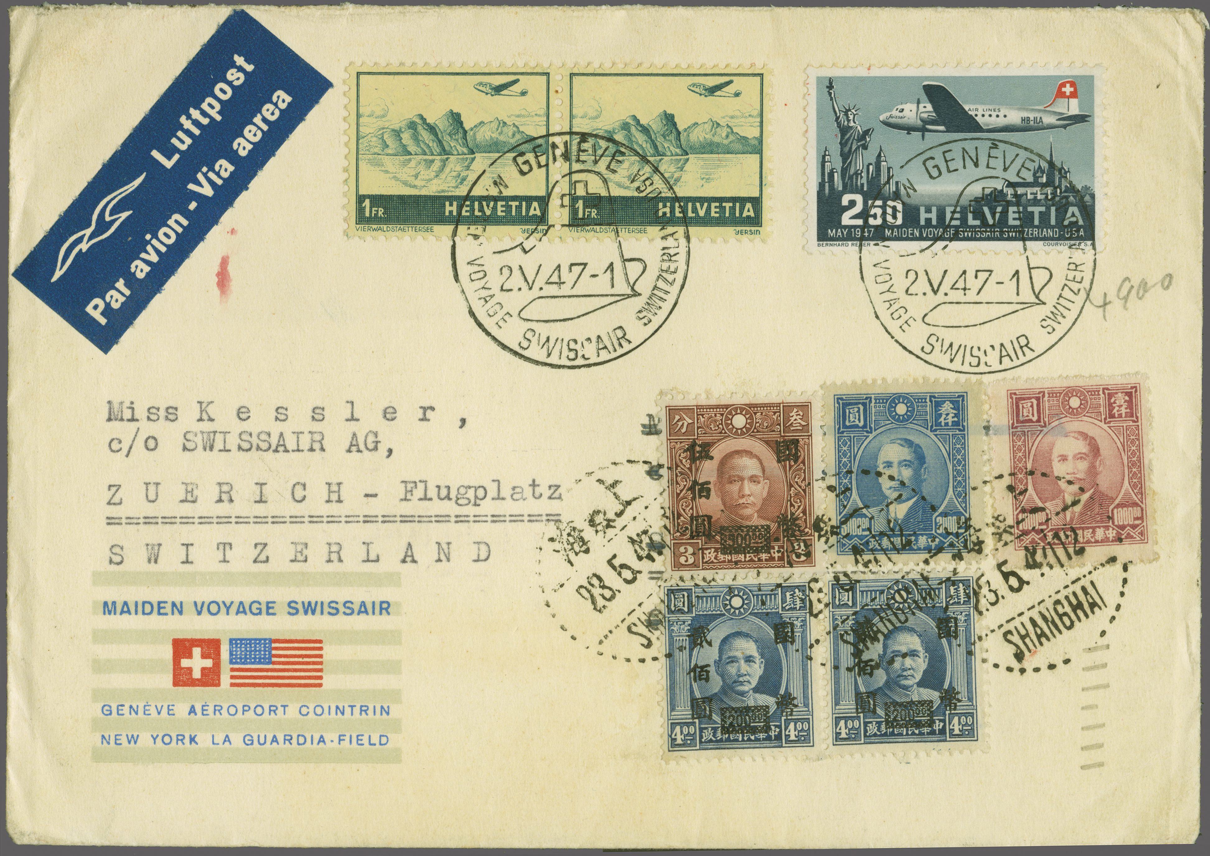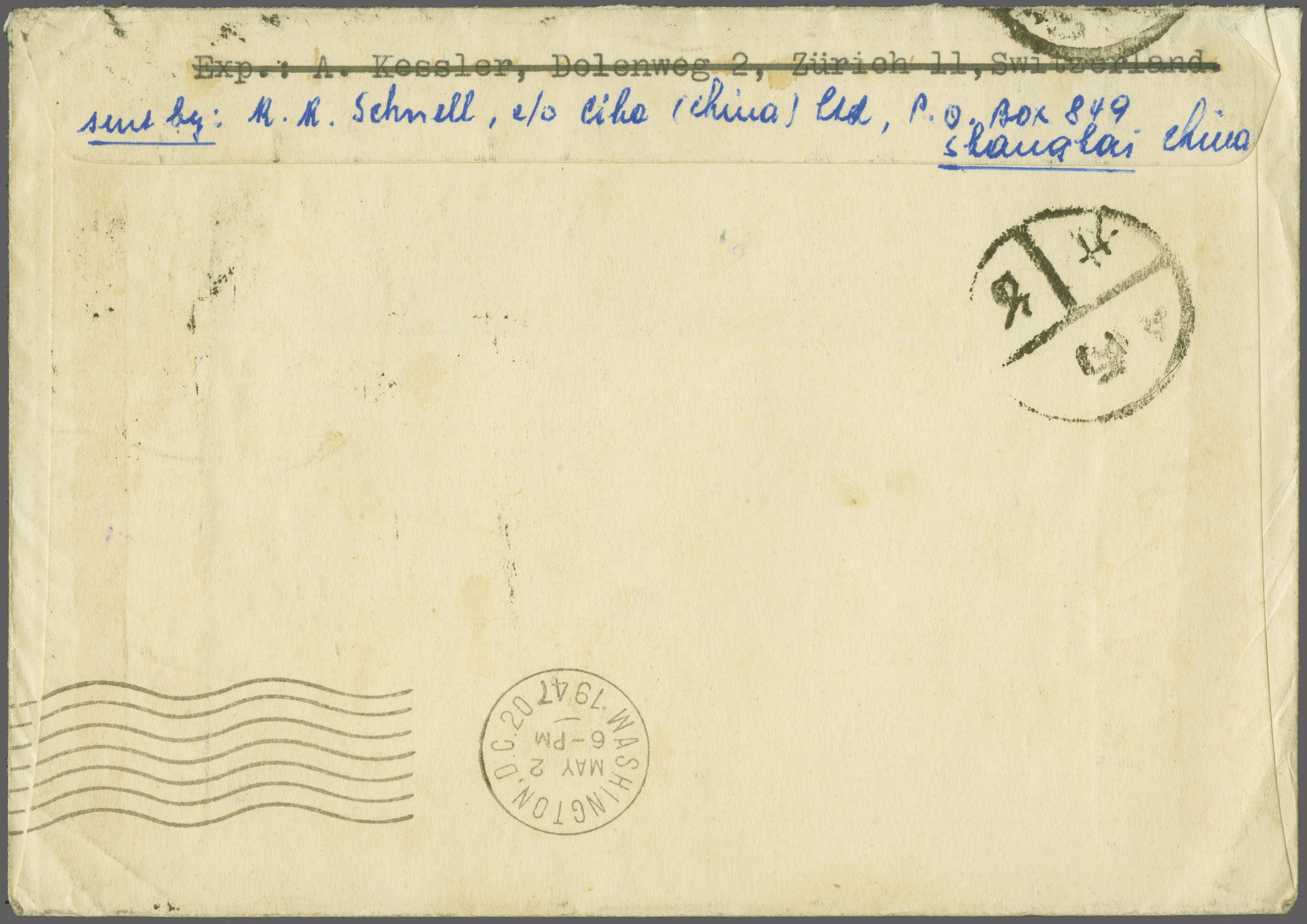 mitrücks. AStp. vom 2. Mai, rücks. neu adressiert mit Vermerk: "sent by: R.R. Schnell c/o Ciba (China) Ltd. P.O. Box 849 Shanghai, China mit chinesischer Zusatzfrankatur gest. "Shanghai 23.5.47/12". Eine seltene Weiterleitung nach China mit korrekten