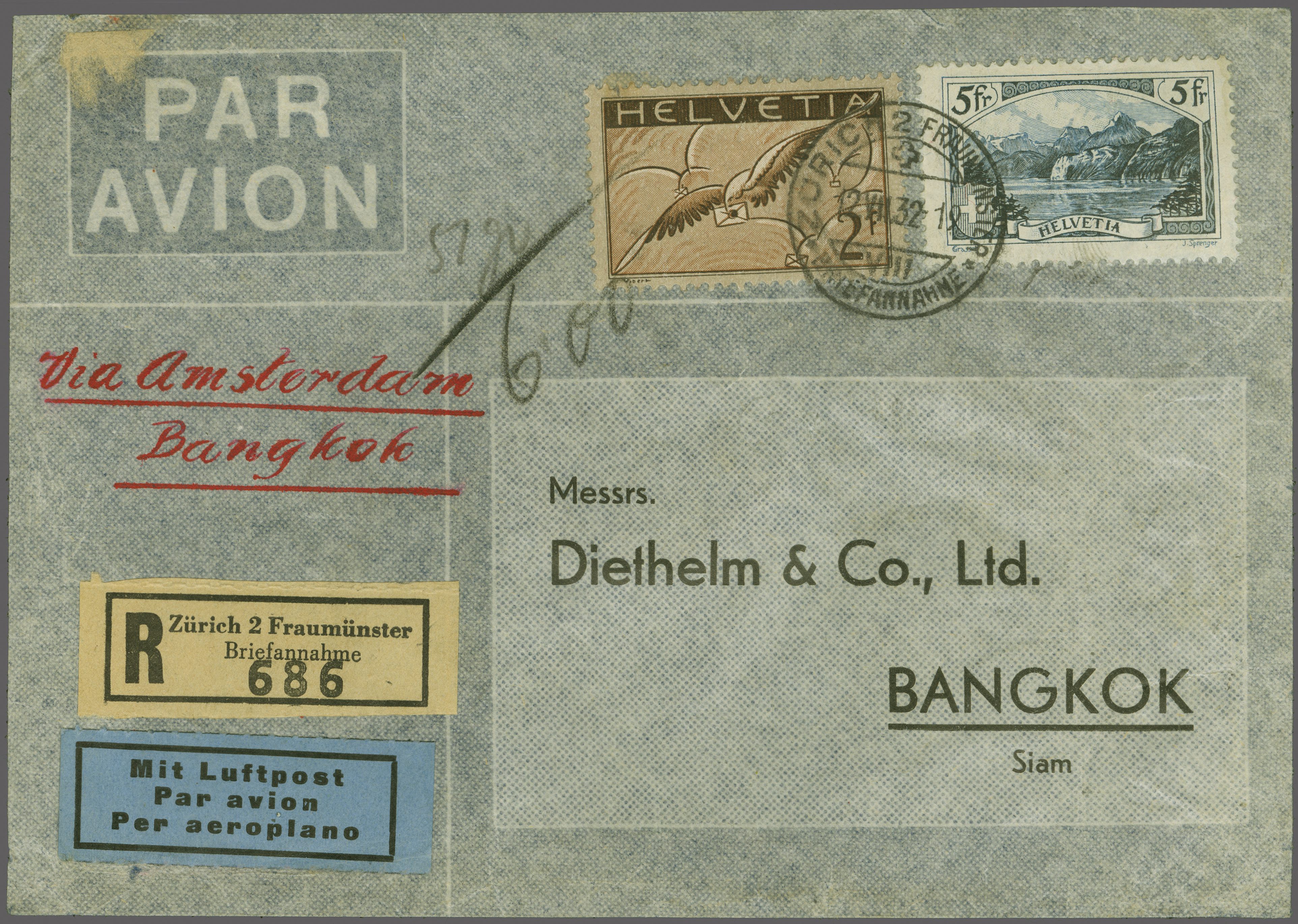 1932 (12.Juli): R-Brief nach Bangkok, portogerecht frankiert mit Gebirgslandschaften 5 Fr. und Flugposttaxe 2 Fr., ab "Zürich Fraumünster 12.VII.32" zugleitet zum KLM Flug ab Amsterdam mit rücks. Astp. von Bangkok (Image 1)