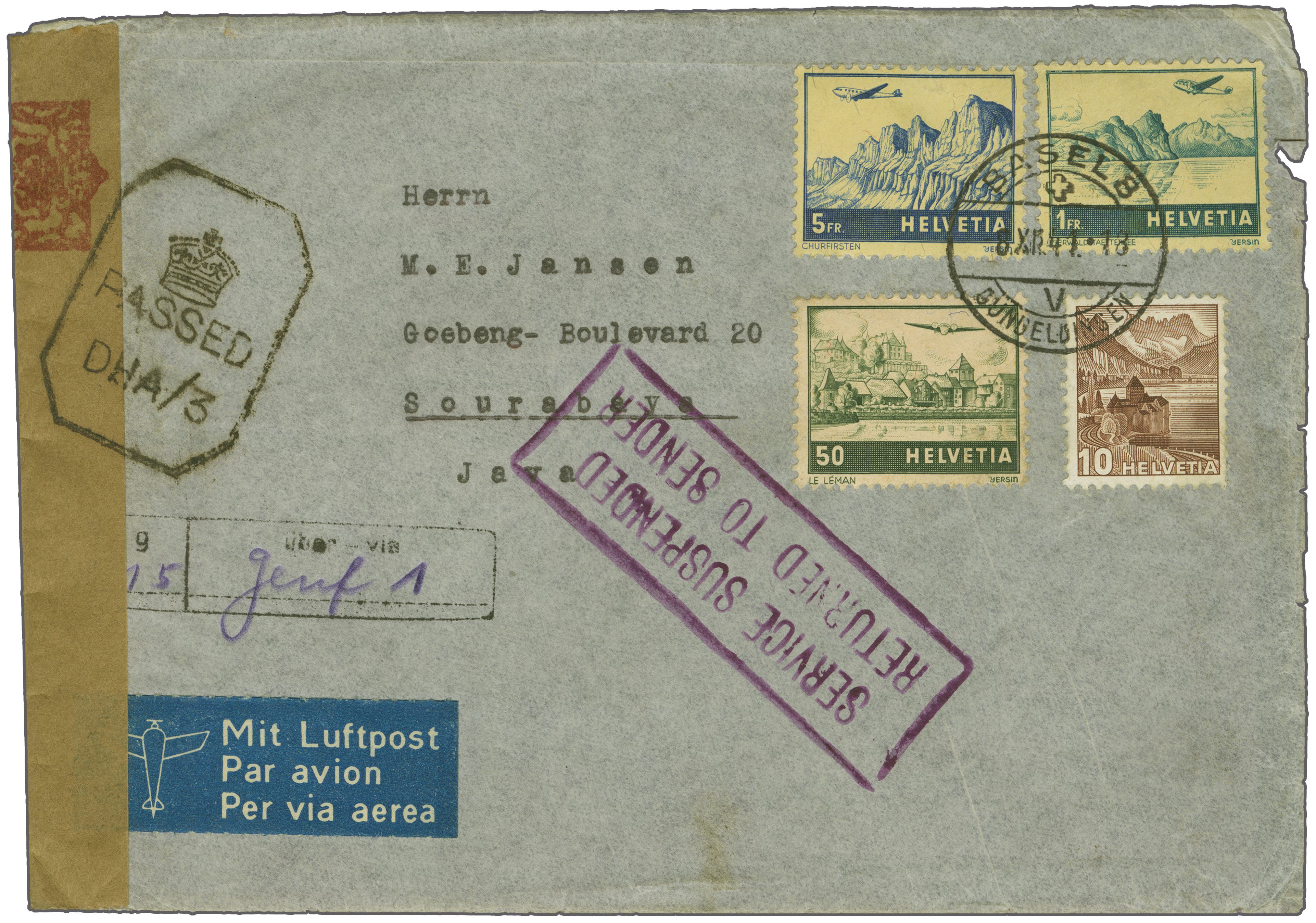 1941 (8. Dez.): Zensurierter Brief von Basel adressiert nach Soerabaya /Java frankiert mit Luftpost 5 Fr., 1 Fr. 50 Rp. plus Chillon 10 Rp. (Porto 6.60) ab "Basel Gundeldingen 8.XII.41" via 'Genf1' mit Brit.- Indischer Zensur