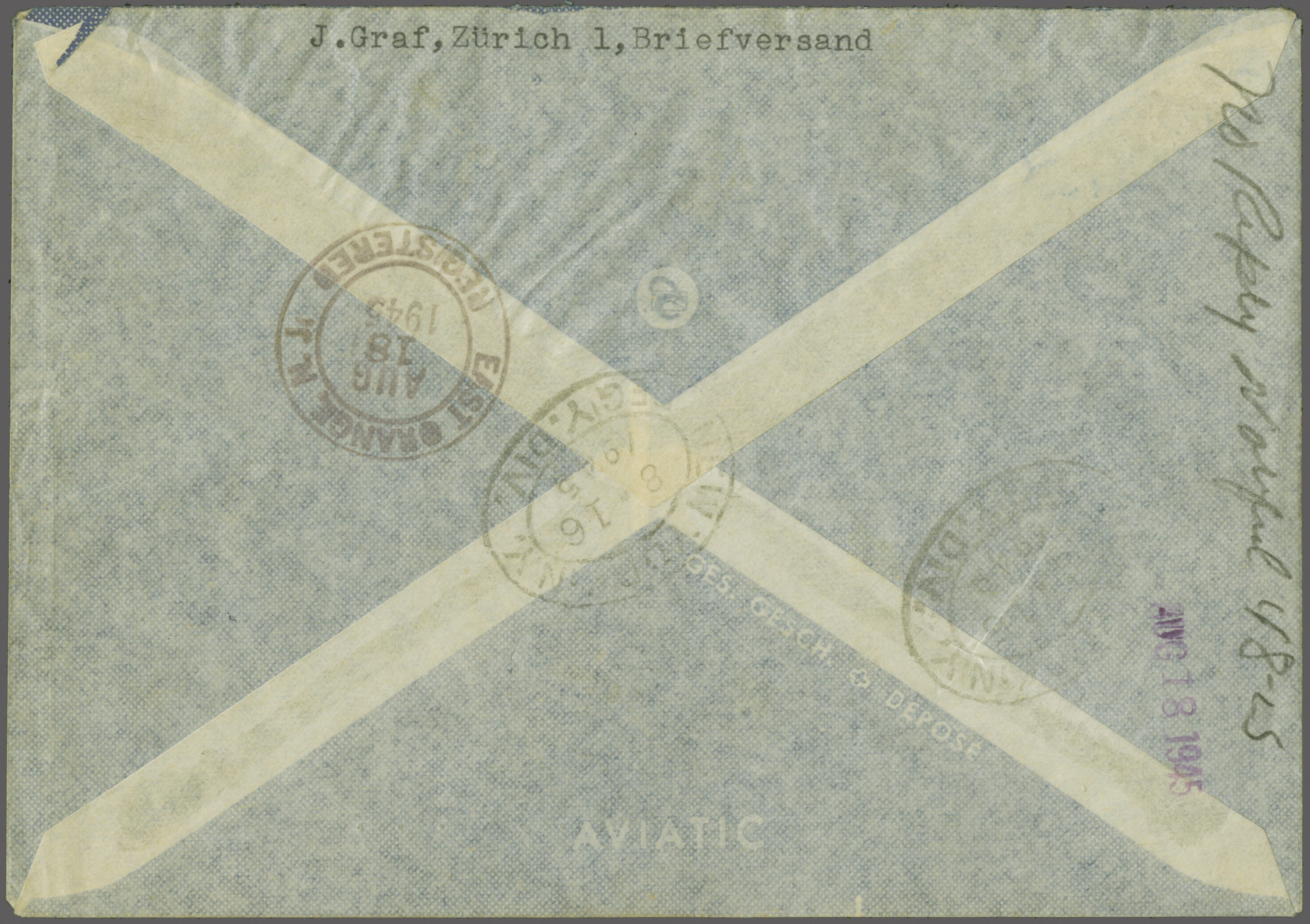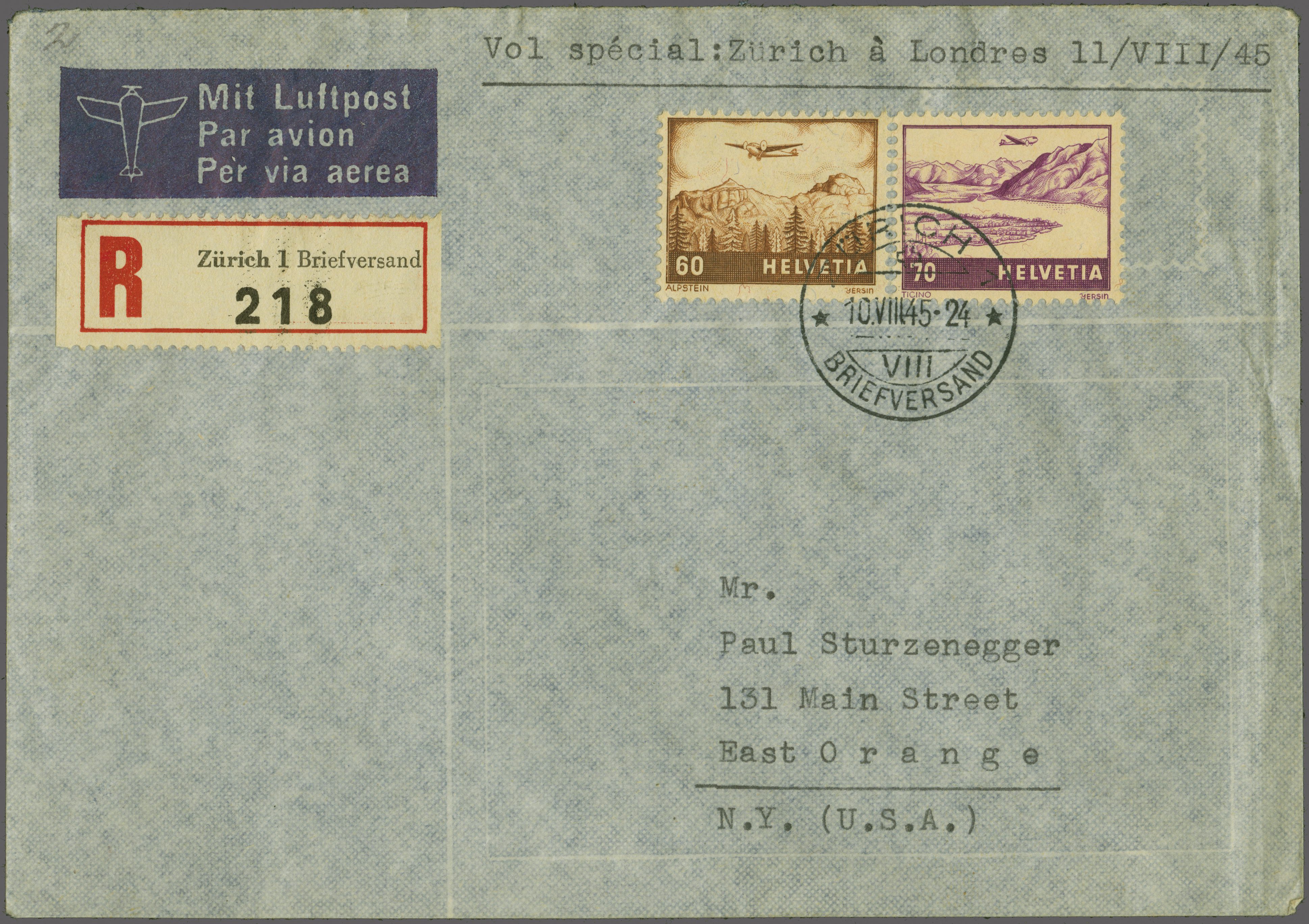 1945: Sonderflug Zürich-London "10.VIII.45", adressiert nach NY, unbekannte Auflage (Image 1)