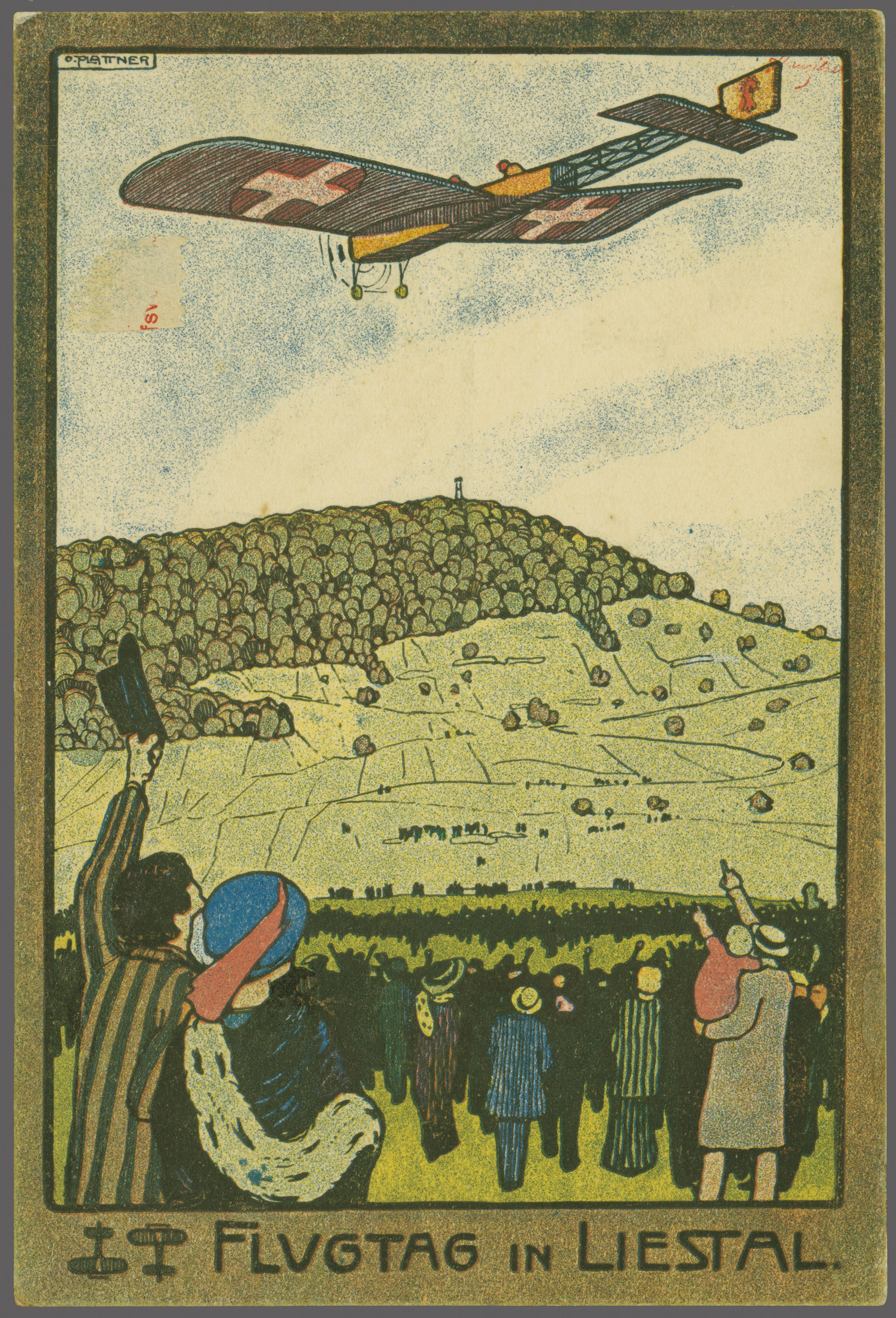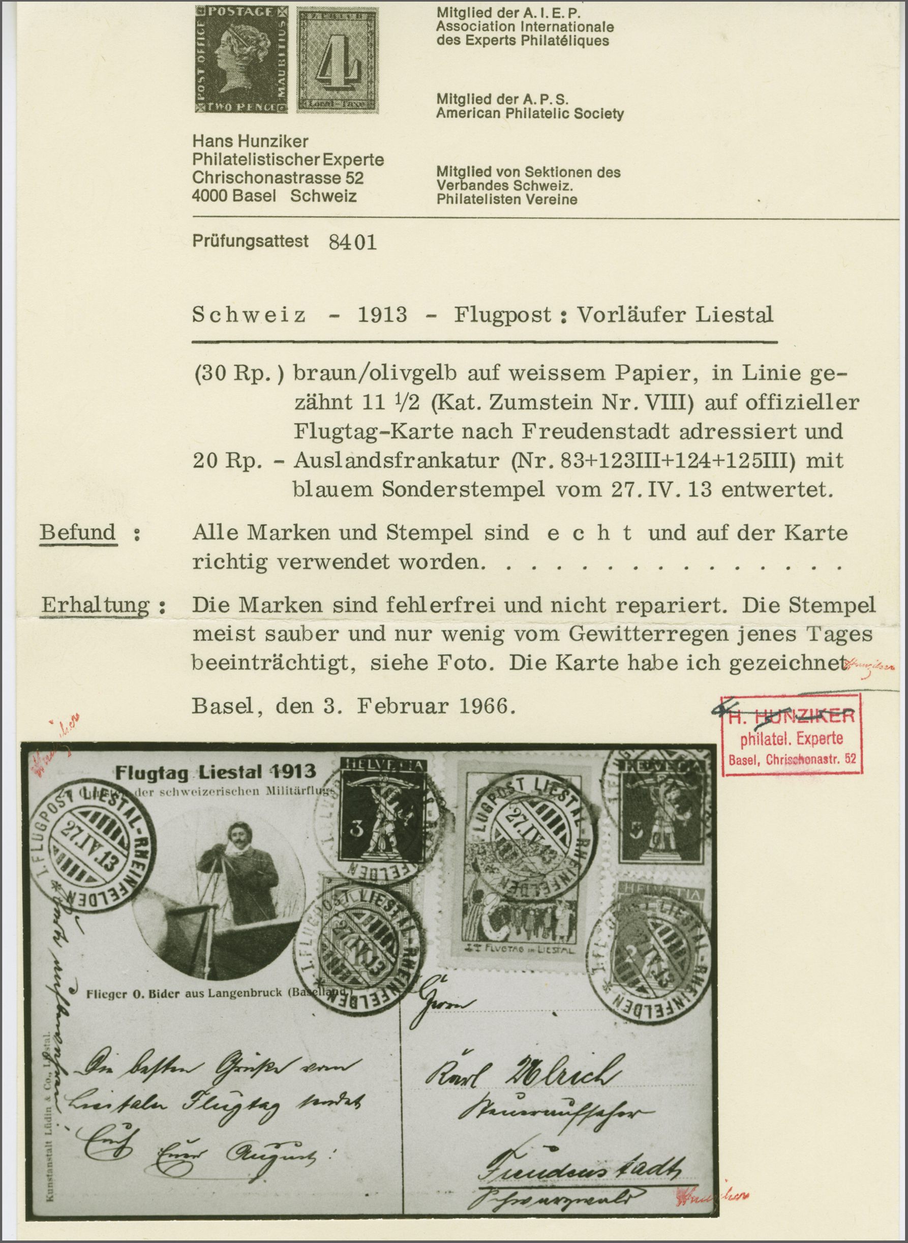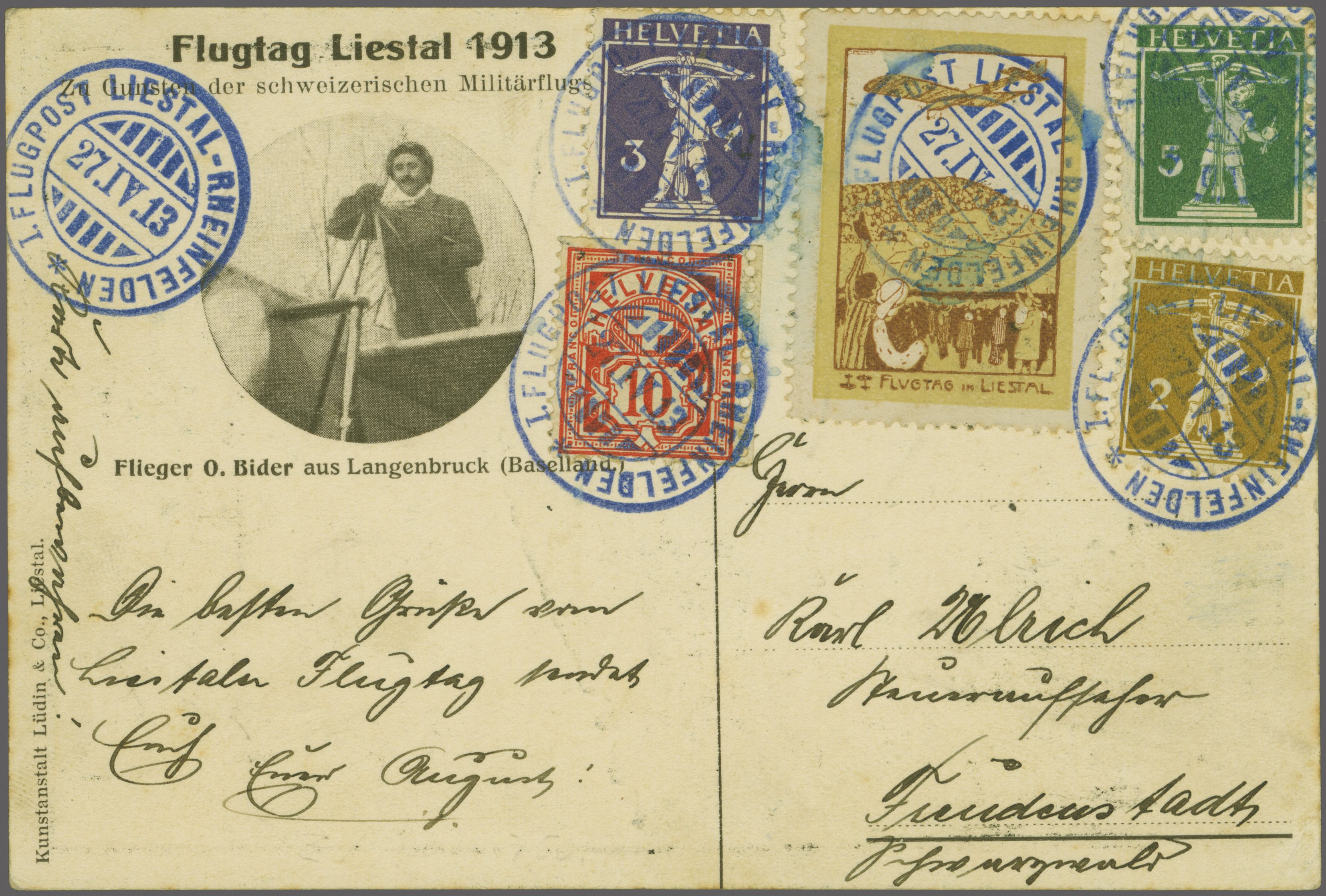 2 Rp. oliv, 3 Rp. violett und 5 Rp. grün, je klar entw. mit blauem SSt. "I. FLUGPOST LIESTAL-RHEINFELDEN 27.IV.133" auf Offizieller Karte Nr. 1 nach Freudenstadt, Württemberg. Trotz zwei leichten Verwischungen durch den Gewitterregen jenes Tages eine