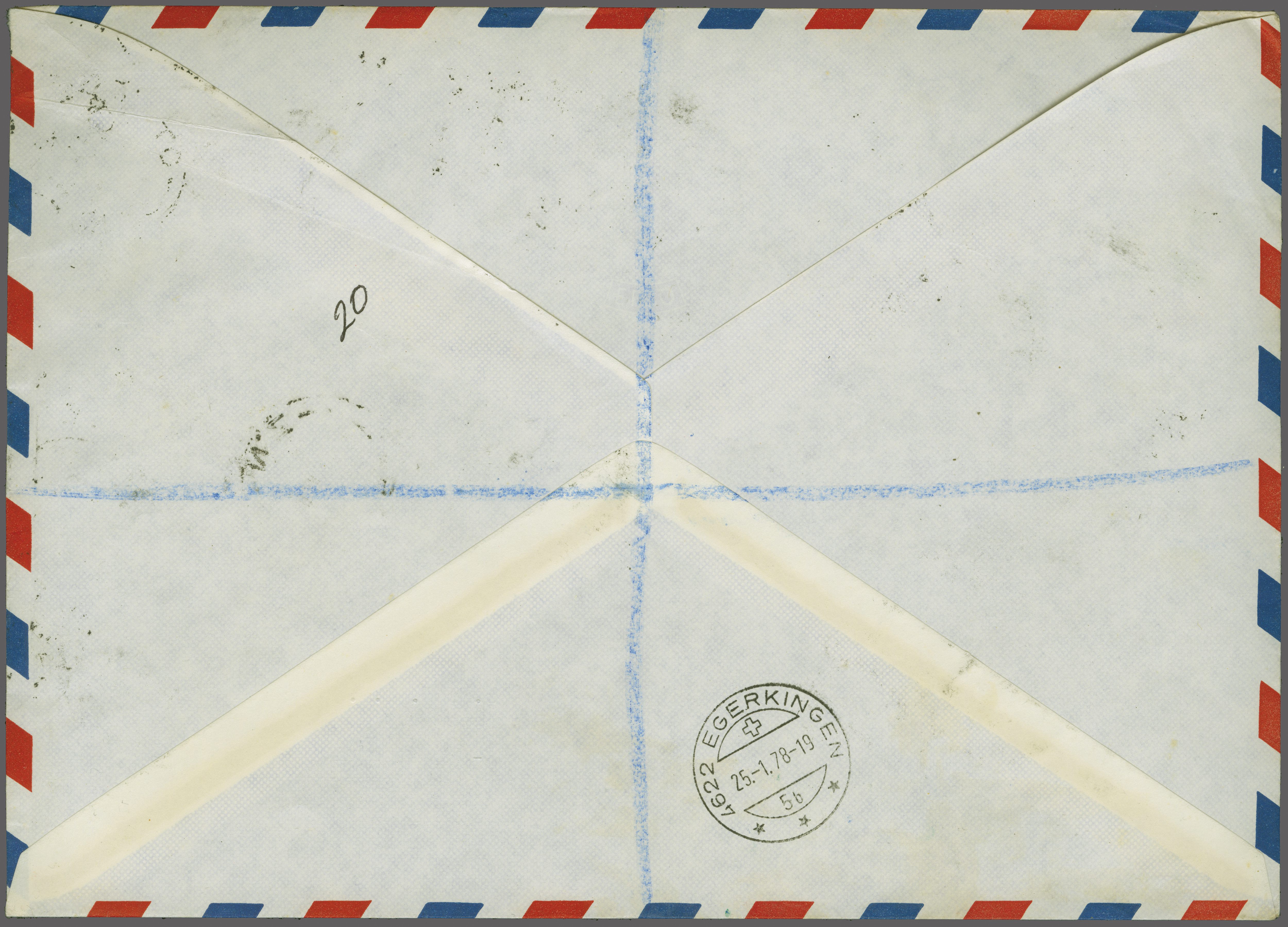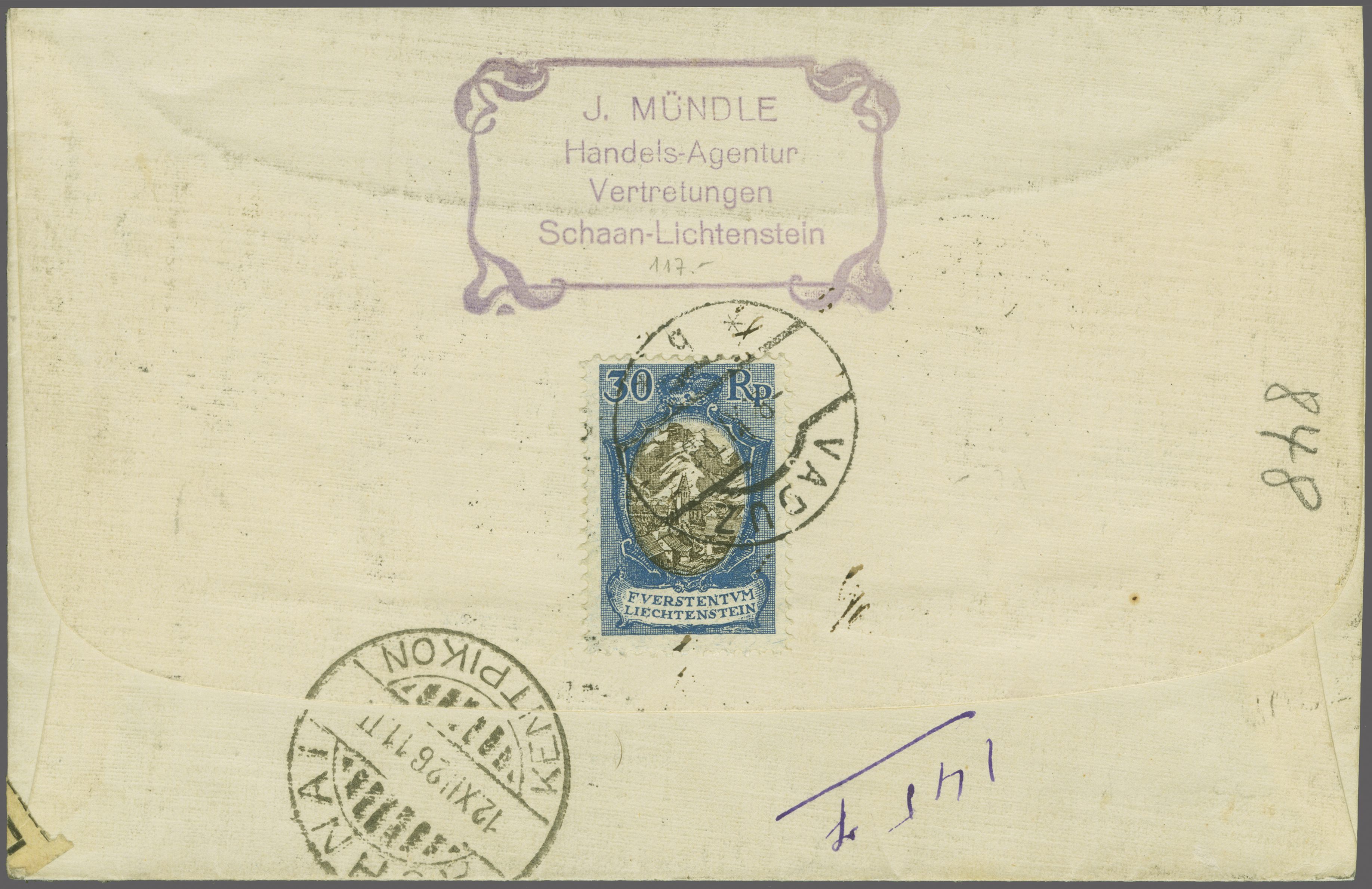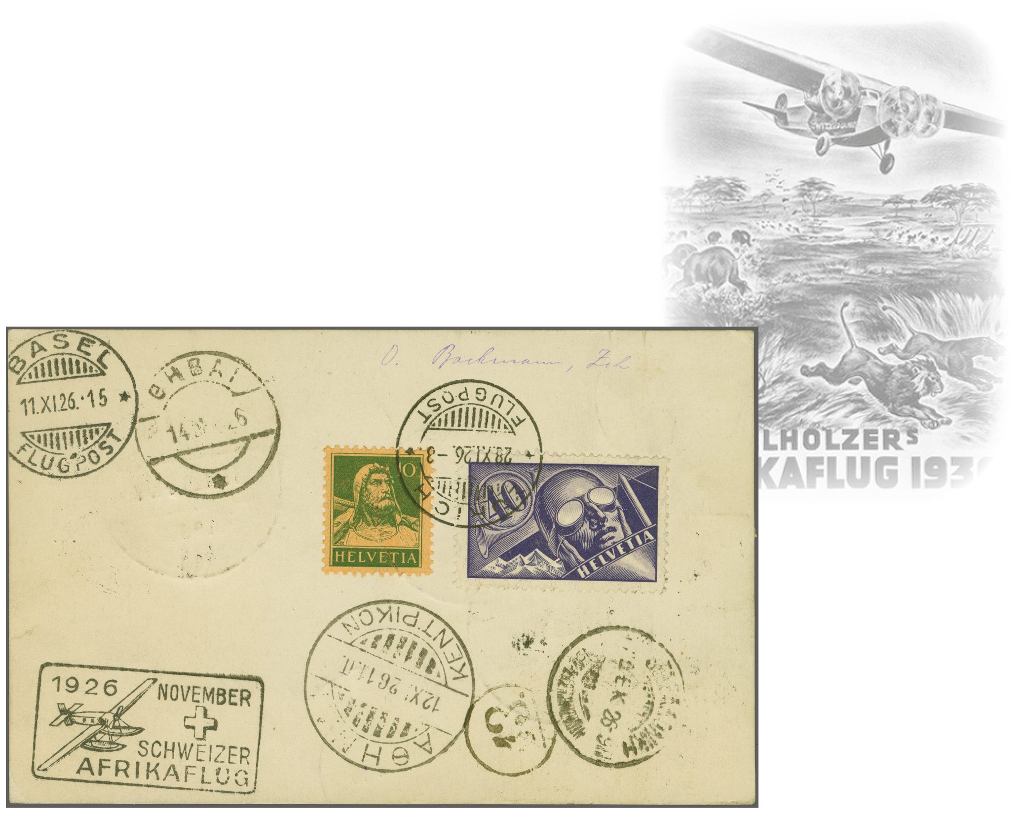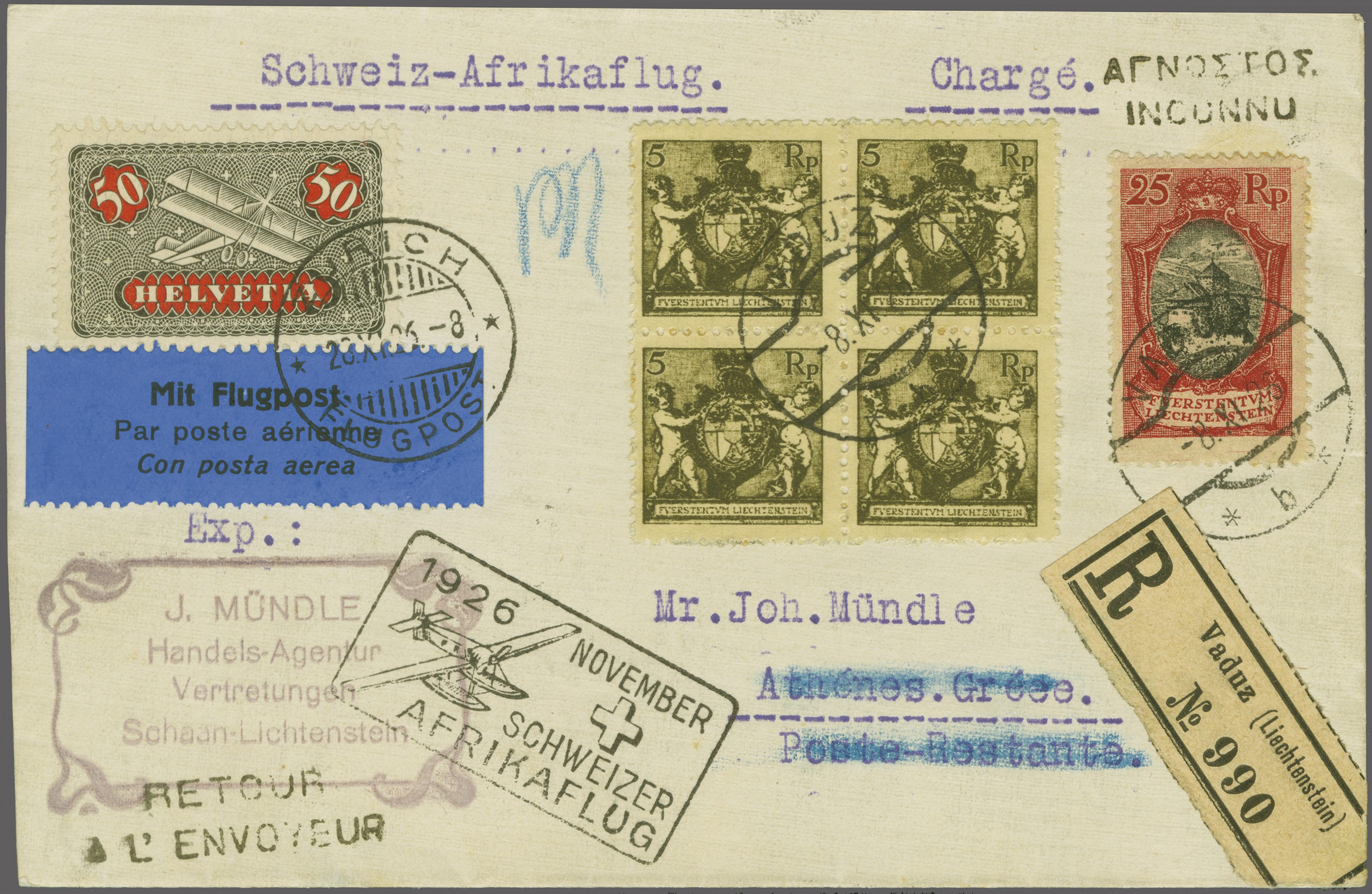 1. Schweizer Afrikaflug Etappe Zürich - Athen 1926 (7. Dez.): R-Brief ab "Vaduz 8.XI.26" mit vorder- und rücks. Mischfrankatur Liechtenstein 75 Rp. und Schweizer Luftpostmarke 50 Rp., gest. "Zürich Flugpost 28.XI.26" mit