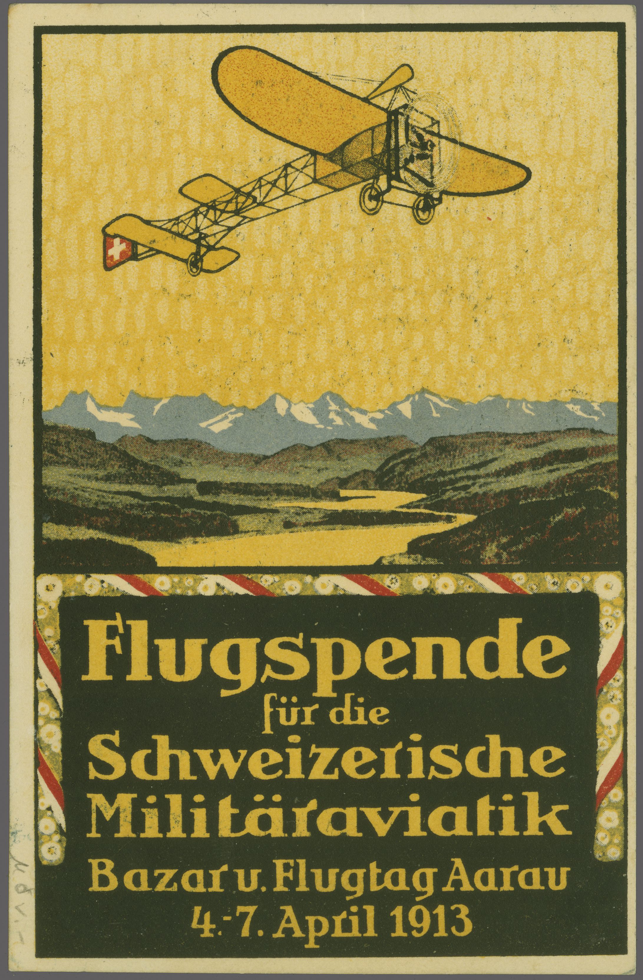 Flugtag Aarau 1913 (6. April): Flugspendemarke 50 Rp. (SBK FI) zus. mit Tellknabe 5 Rp. grün, normal gez., je klar und übergehend entw. mit blauem SSt. 1 auf offizieller Karte Nr. 3 nach Diessenhofen (TG). SLH=CHF 1'600 (Image 1)