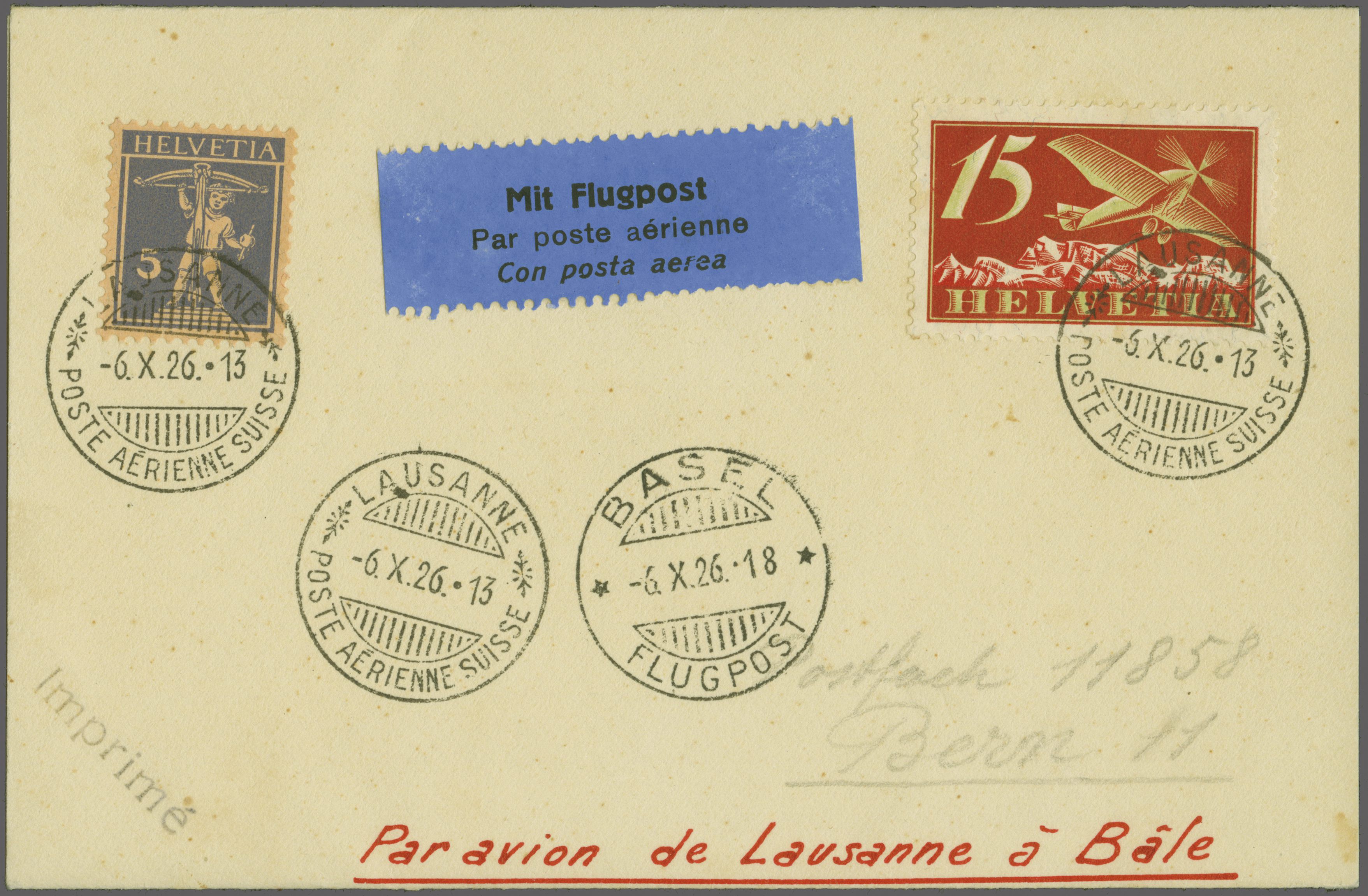 Rp. (SBK F3) und mit vorders. AStp. "Basel Flugpost 6.X.26-18" nach Bern adressiert. Ein ausserordentlich seltener Flug. befS 3. SLH=CHF 8'000 (Image