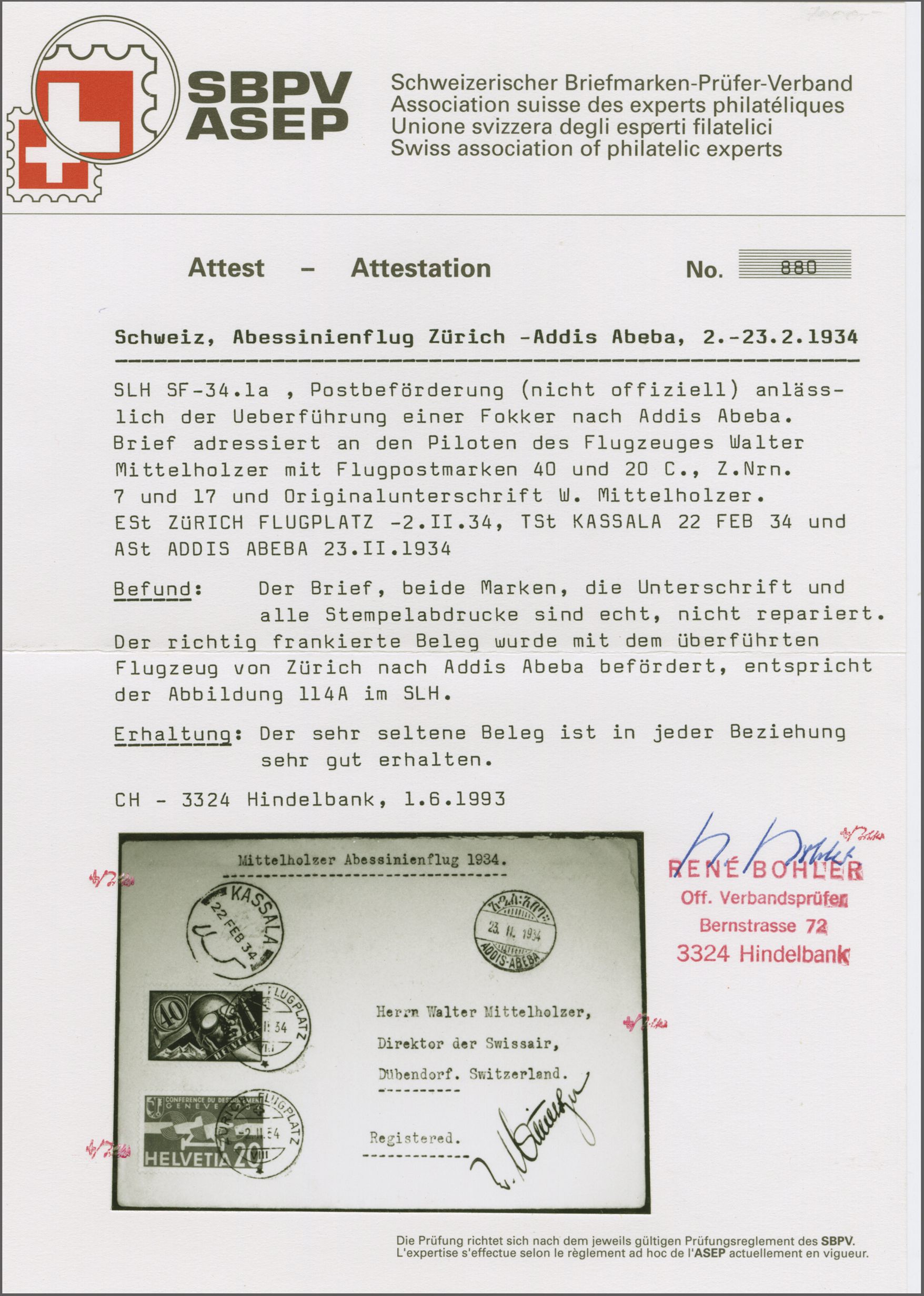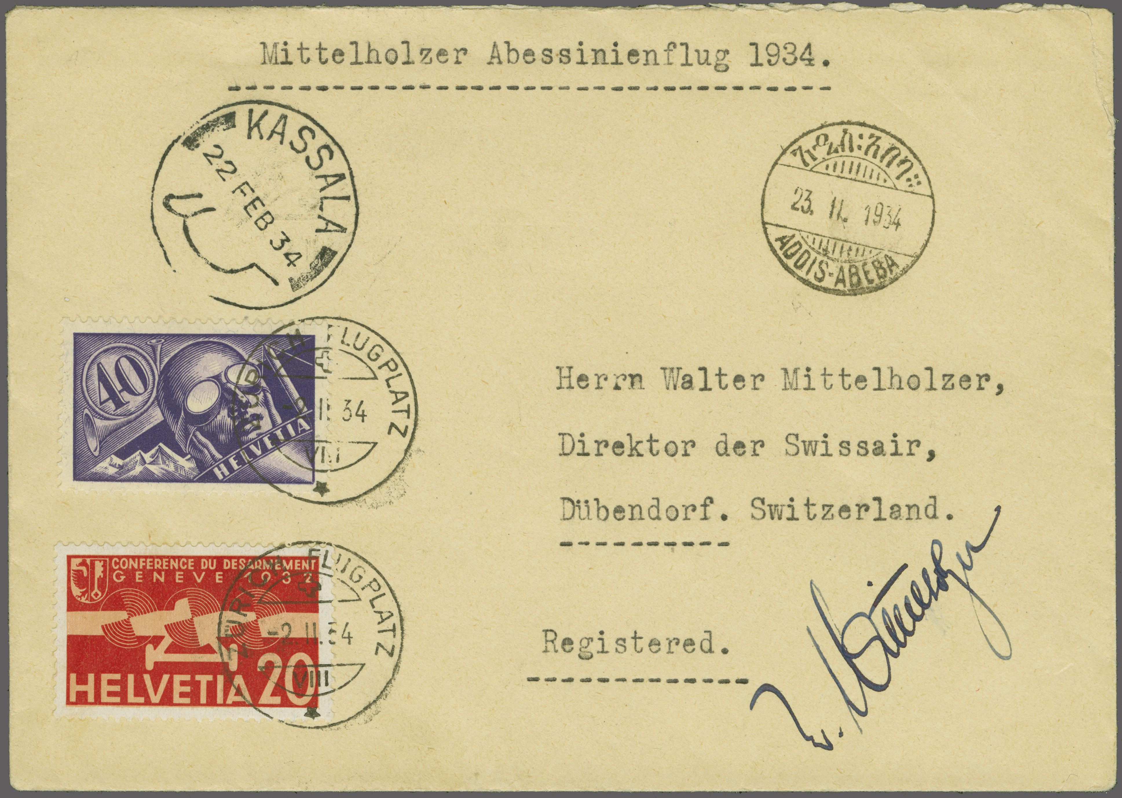 Mittelholzer Abessinienflug 1934 (2. bis 23. Feb.): Brief frankiert mit Schweizer Luftpostmarken zu 20 Rp. und 40 Rp. gest. "Zürich Flugplatz 2.II.31" adressiert und signiert von Walter Mittelholzer mit Tagesstp. "Kassala 22.