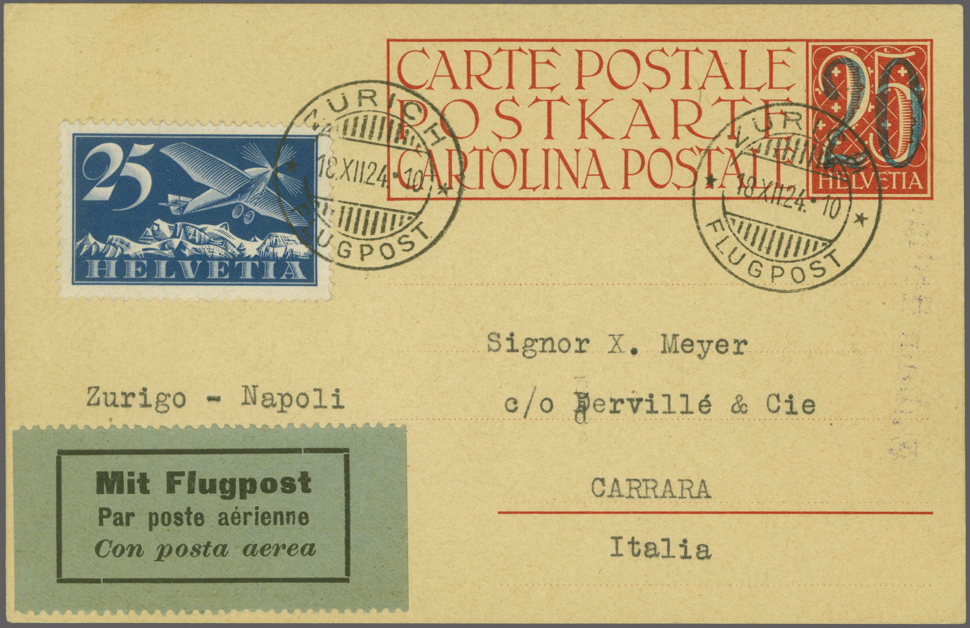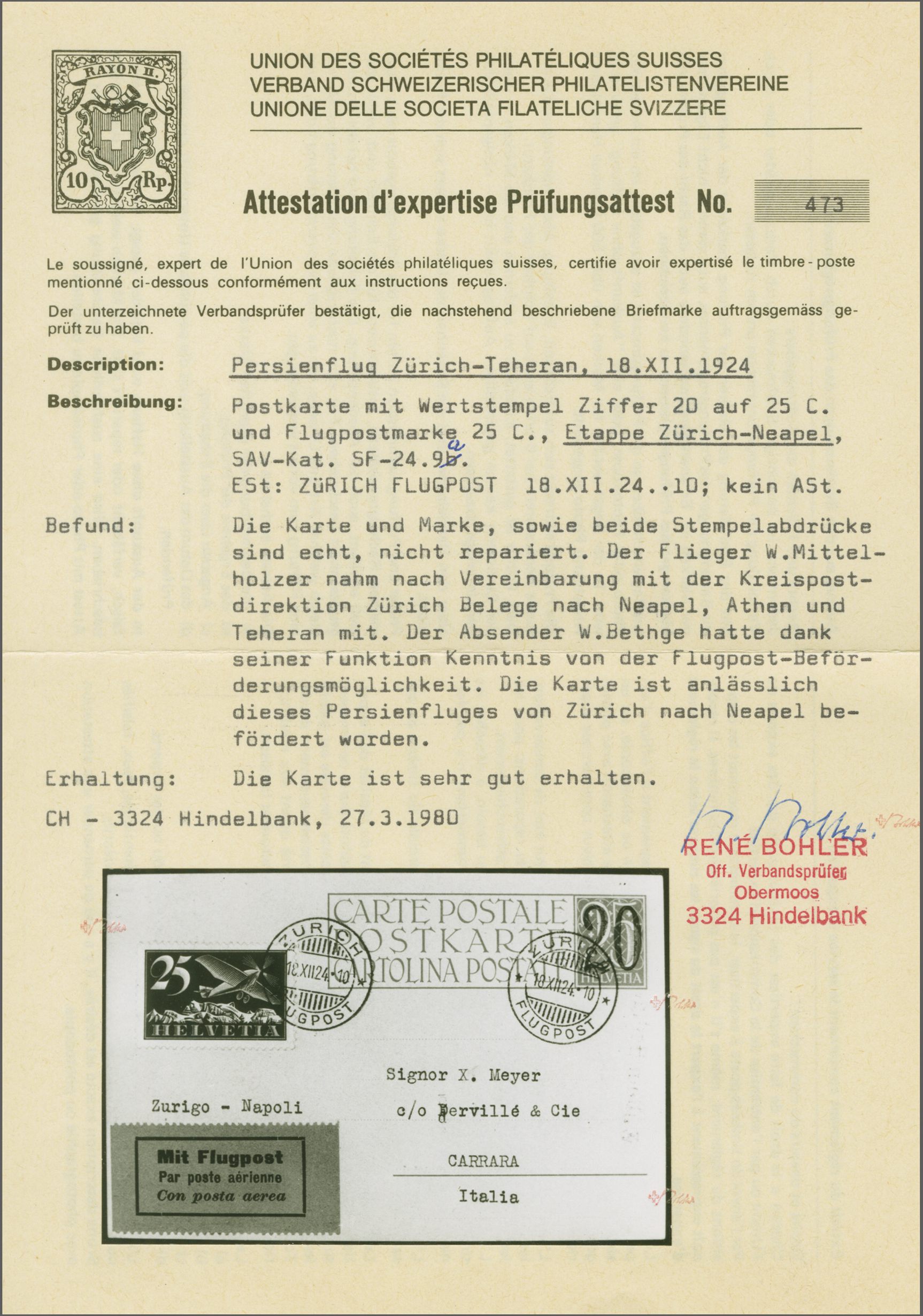 Persienflug Zürich - Teheran, Pilot Walter Mittelholzer mit Junkers A-20 1924 (18. Dez.): 20/25 Rp. - GS-Karte frankiert mit Flugpost 25 Rp. beide sauber und klar entw. "Zürich Flugpost 18.XII.24.10" der Etappe bis Neapel, wie