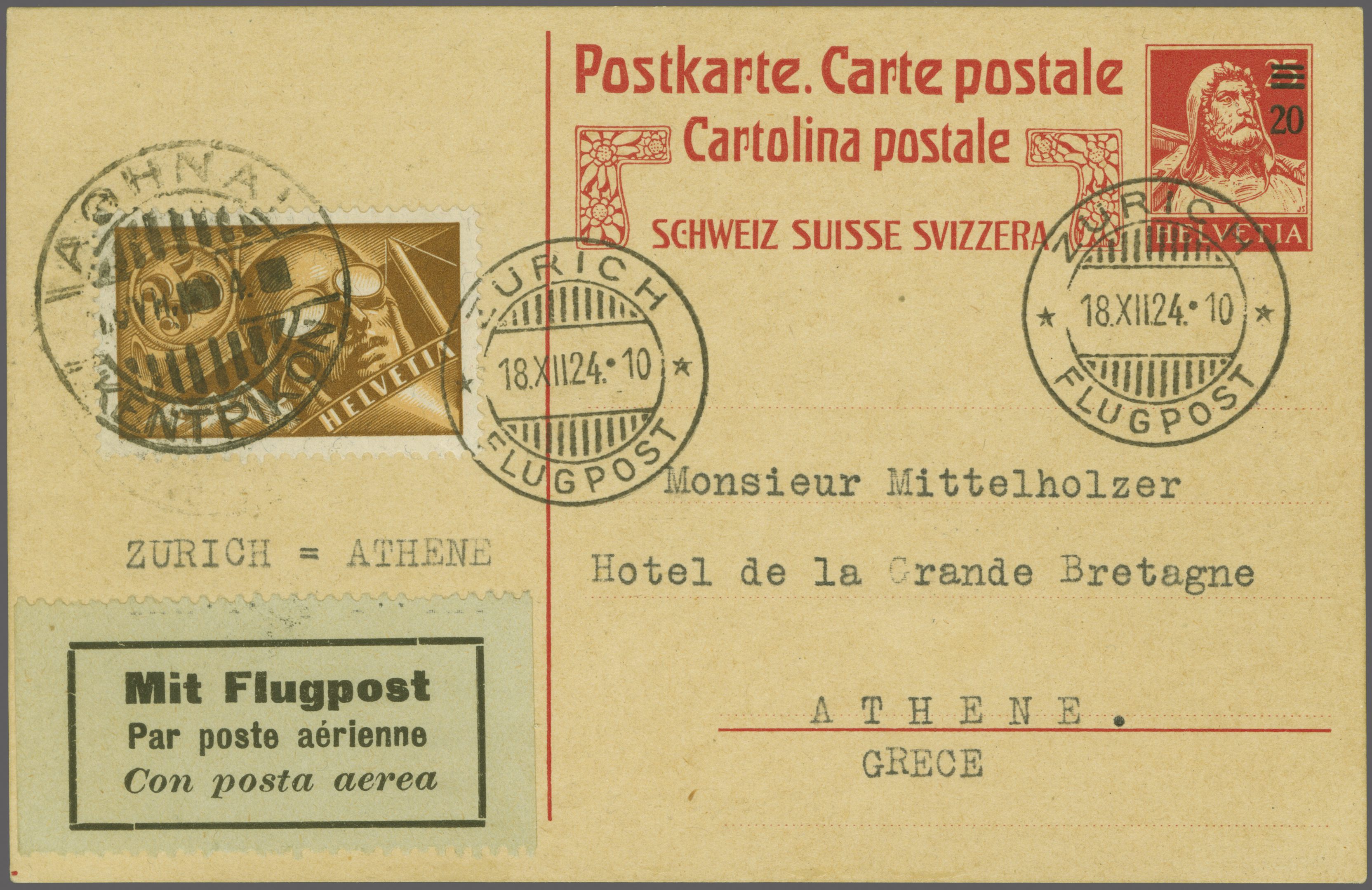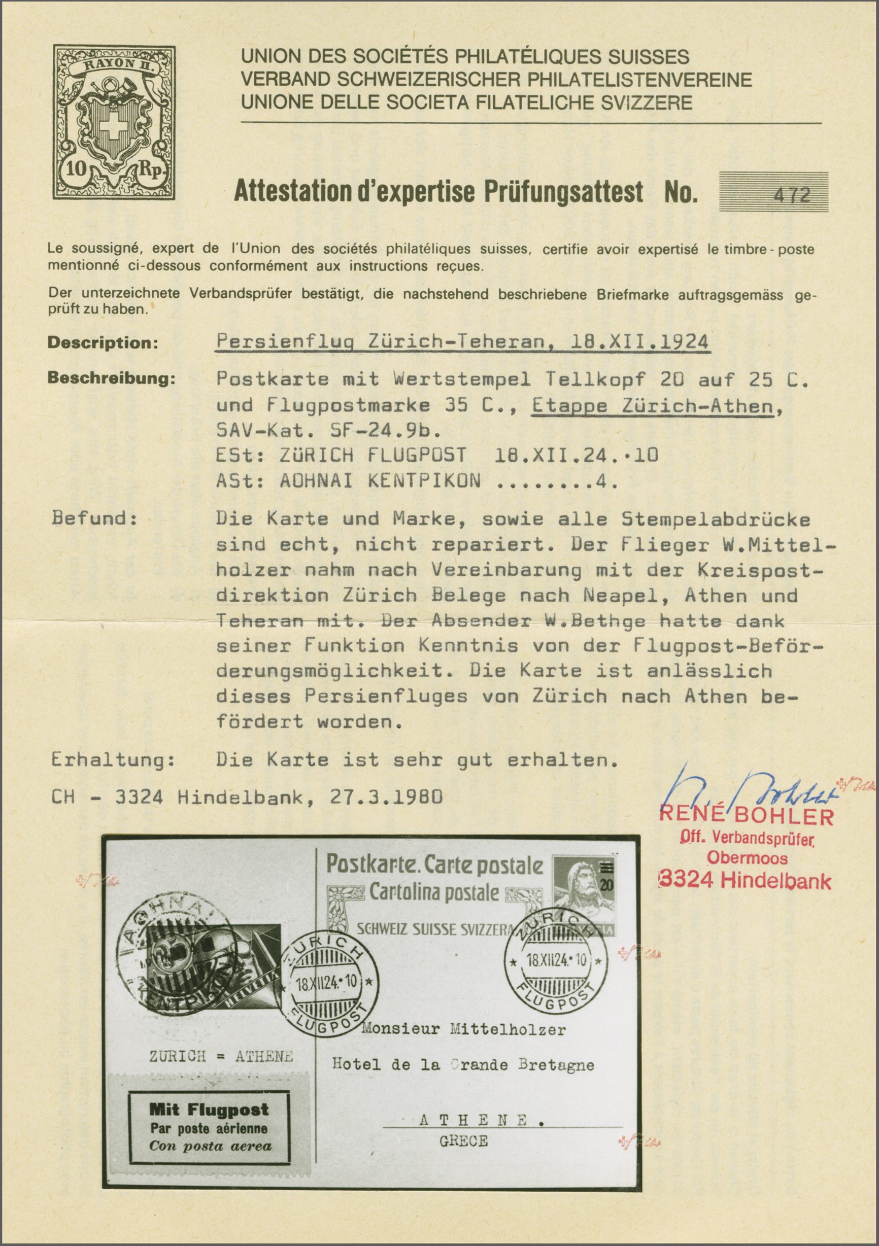 Persienflug Zürich - Teheran, Pilot Walter Mittelholzer mit Junkers A-20 1924 (18. Dez.): 20/25 Rp. - 20/25 Rp. GS-Karte frankiert mit Flugpost 35 Rp. sauber und klar entw. "Zürich Flugpost 18.XII.24.10" der Etappe bis "Athen