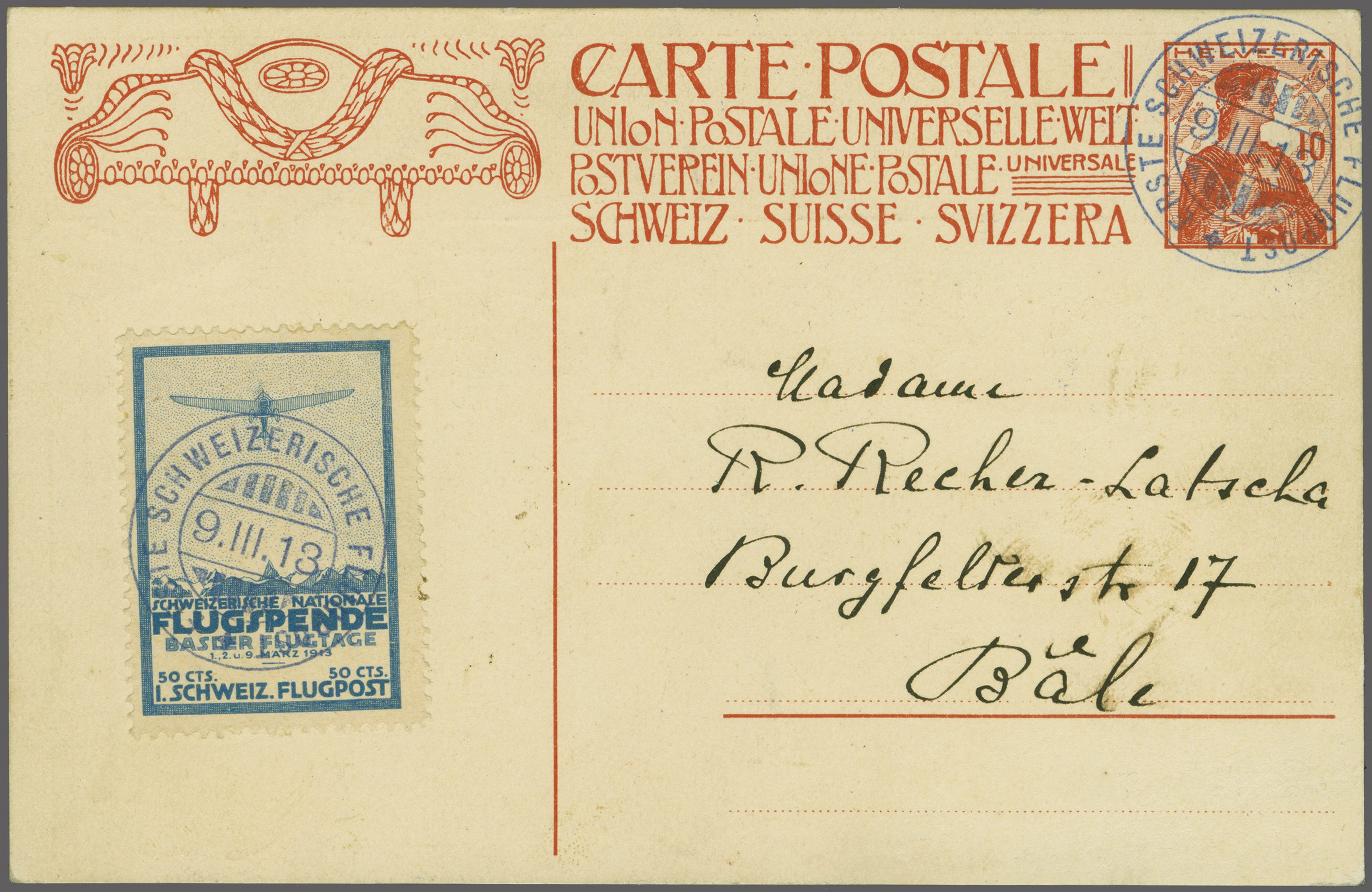Flugtag Basel 1913 (9. März): Flugspendemarke 50 Rp., farbfr. und fehlerfrei gez., auf Ganzsachenpostkarte 10 Rp. rot, beide sauber entw. mit blauem SSt. "Erste Schweizerische Flugpost 9.III.13" und an die Burgfelderstrasse 17