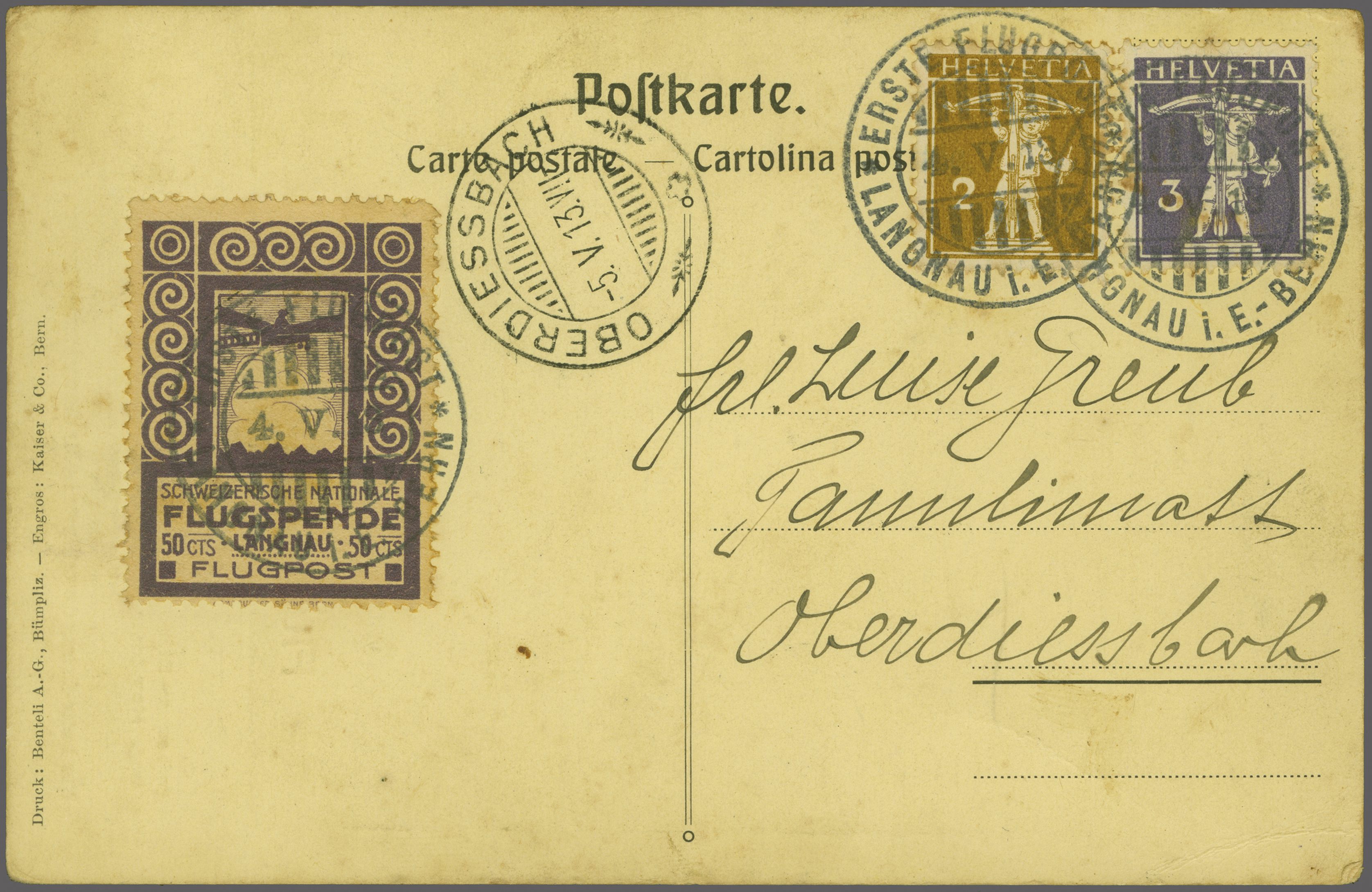 schwarzem SSt. "Erste Flugpost Langnau i.E-BERN 4.V.13" auf Offizieller Karte Nr. 2 nach Oberdiessbach mit vorders. Distributionssstp. vom 5. Mai. SBK FVI+123/III+124, SLH=CHF 1'400 (Image 1)