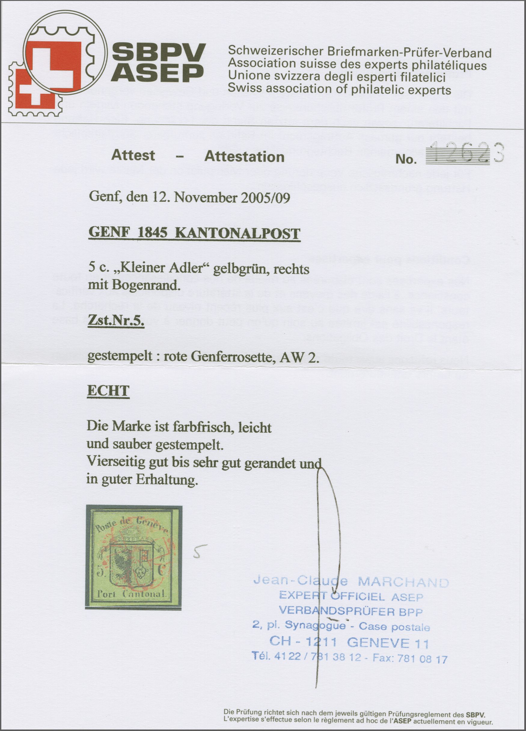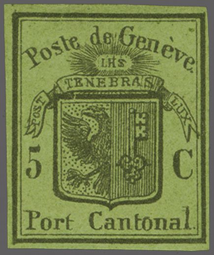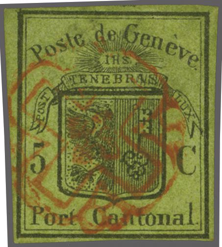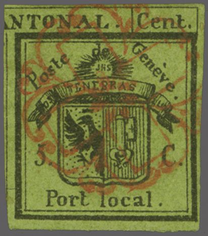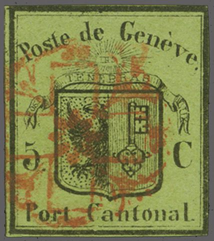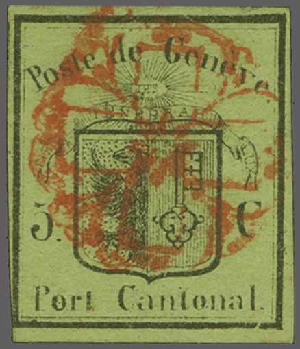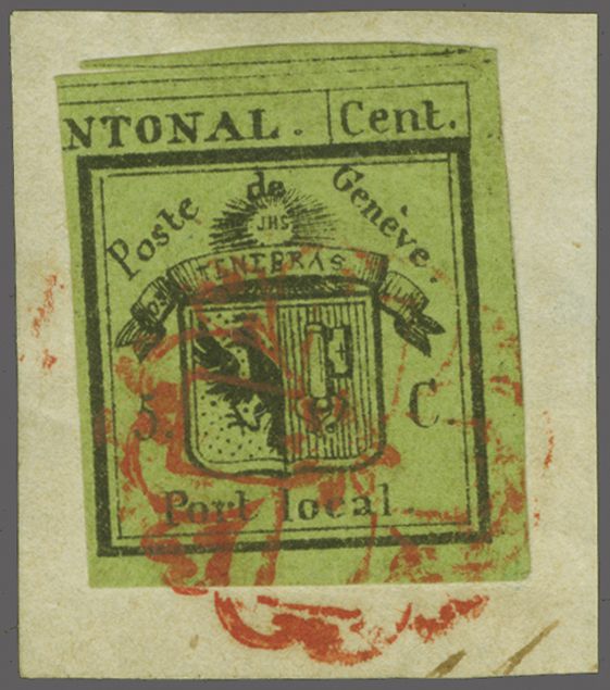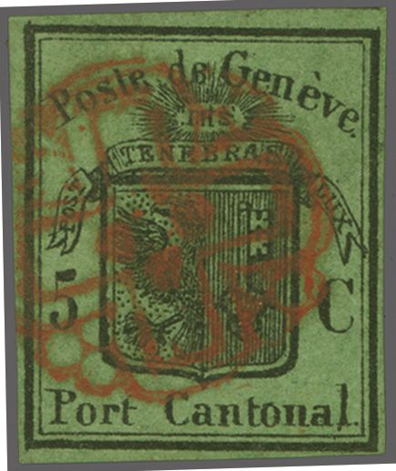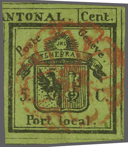 Kl. Adler, farbfr. Prachtstück, allseits grünrandig und für diese eng gedruckte Ausgabe breit geschnitten mit Teilen einer Nachbarmarke, klar und übergehend entwertet mit roter Genfer Rosette (AW 2) mit nebenges. rotem "GENEVE