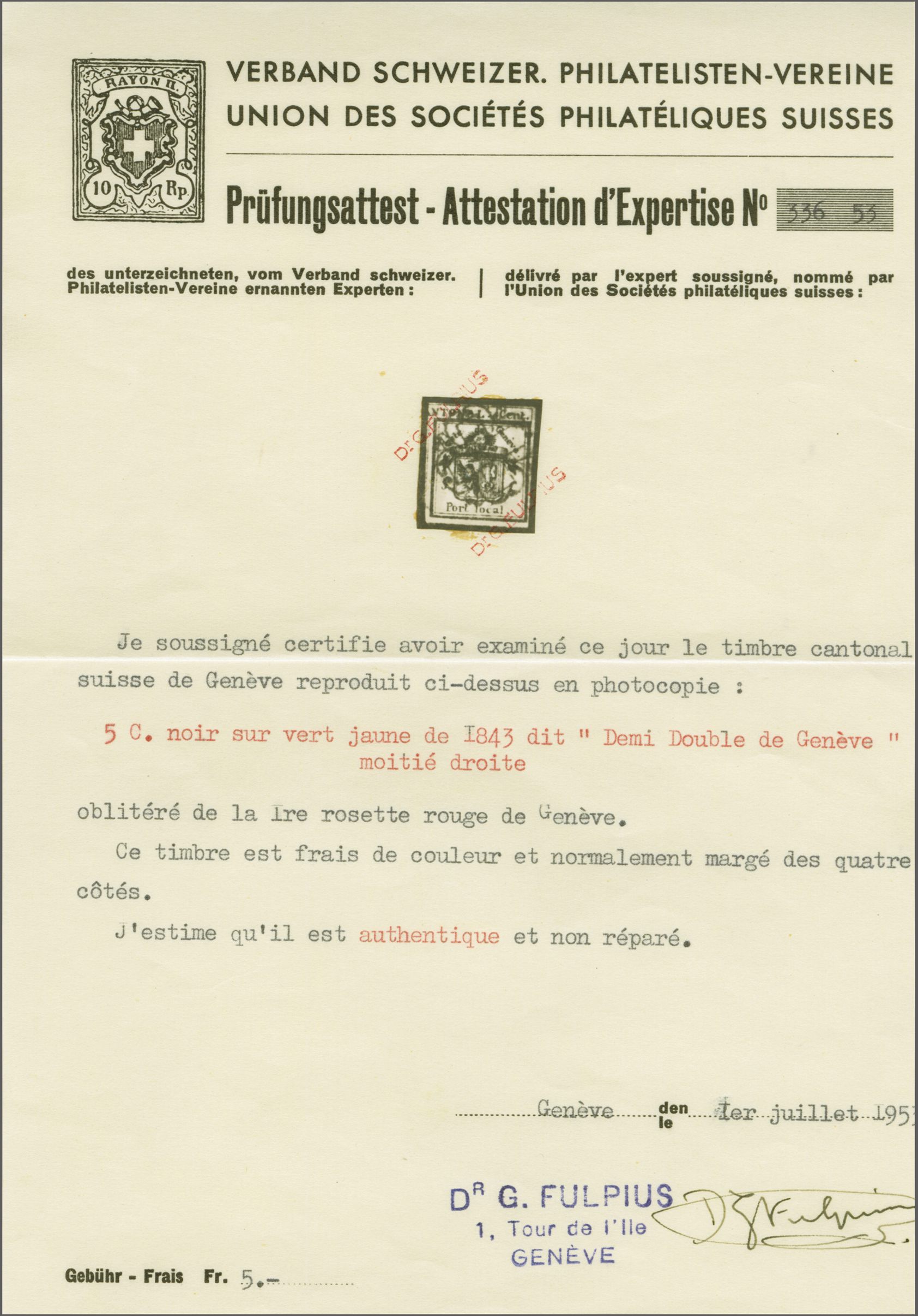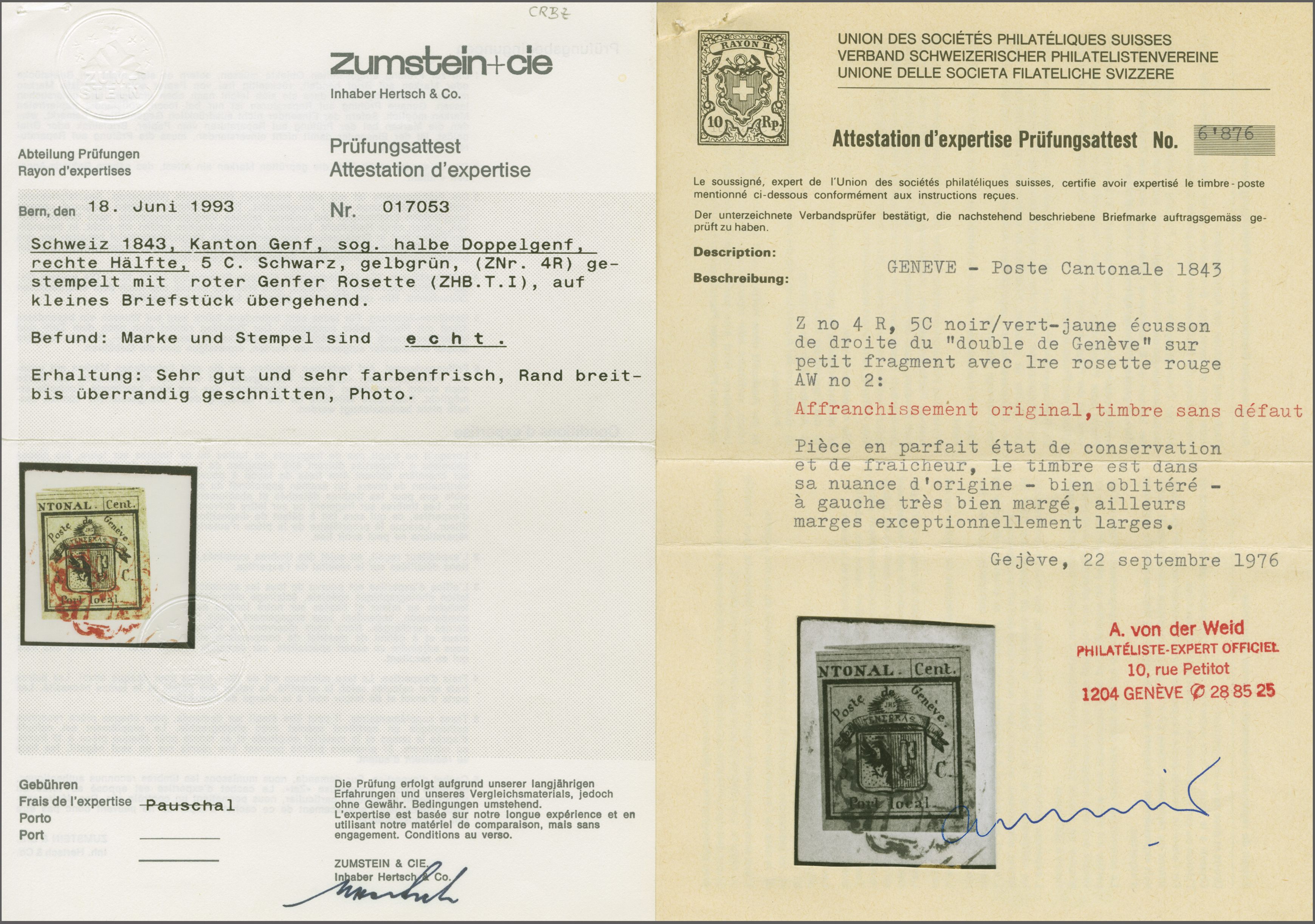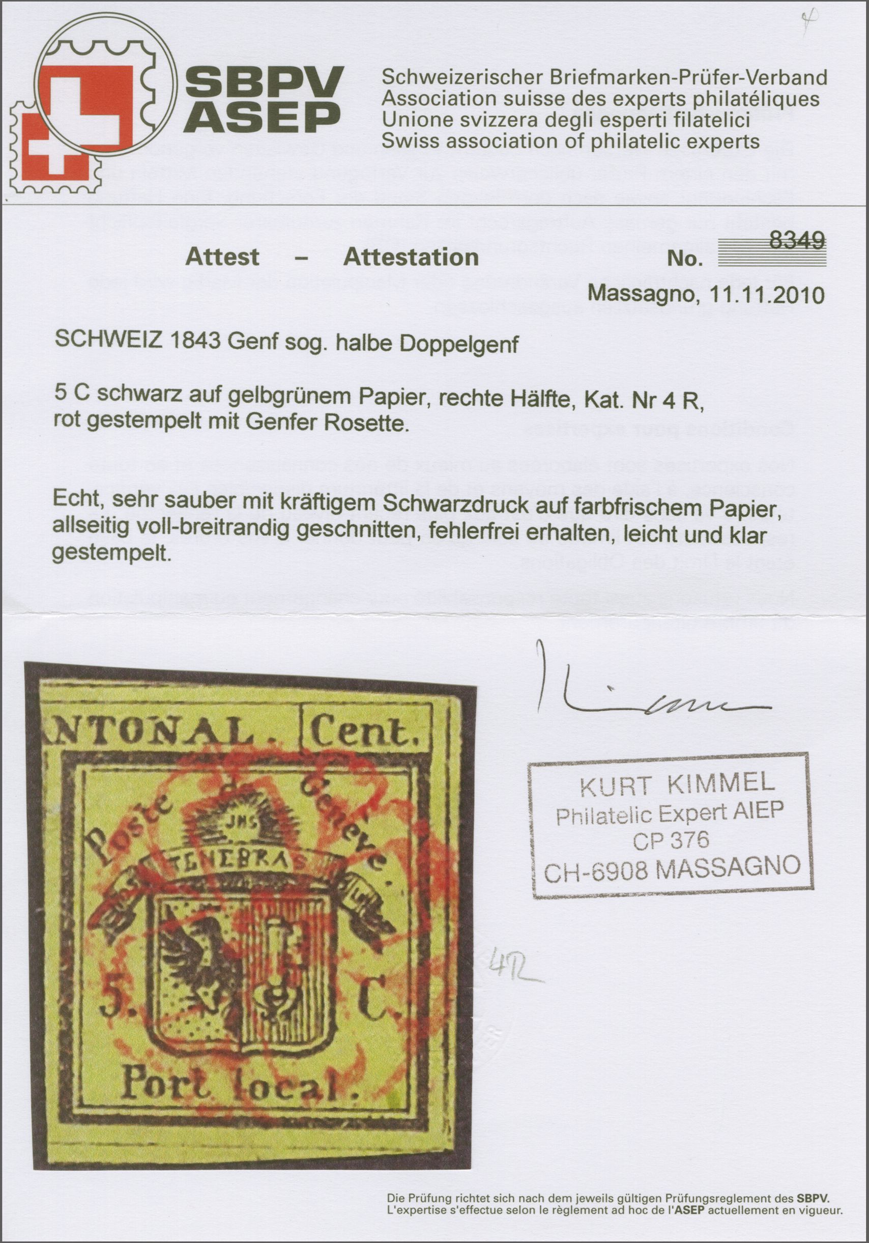 Rechte Hälfte Doppelgenf, farbintensiv und gut- bis überrandig, zartklar und nahezu voll aufges. entw. mit fein ausgeprägter roter Genfer Rosette (AW 2). Eine schöne Marke mit eleganter Entwertung; Atteste Fulpius (1953) und