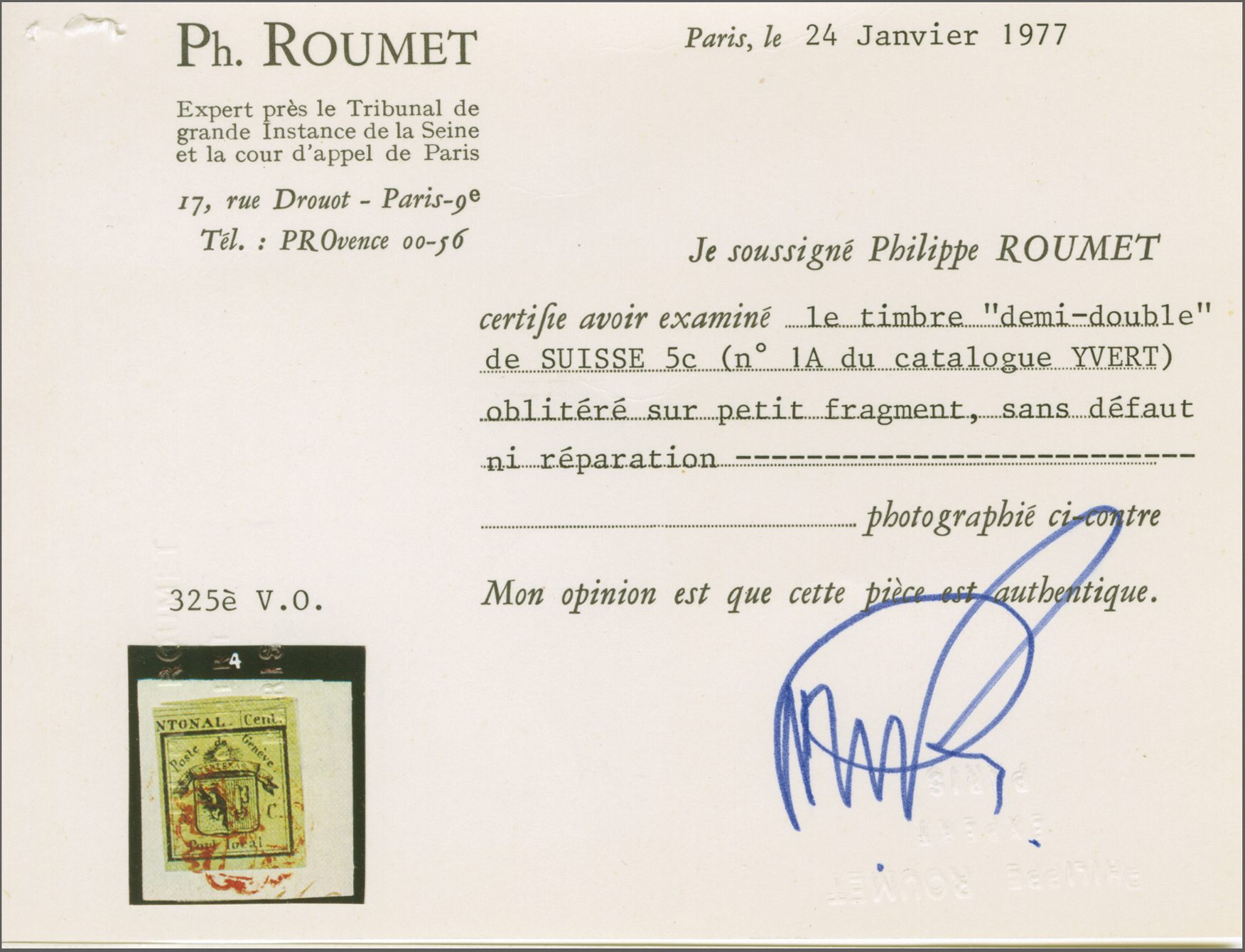 ausserordentlich grosszügig geschnittene Marke; Atteste von der Weid (1976), Roumet (1977) und Hertsch (1993). SBK=CHF 10'000+ (Image 1)