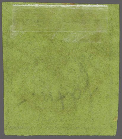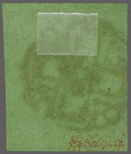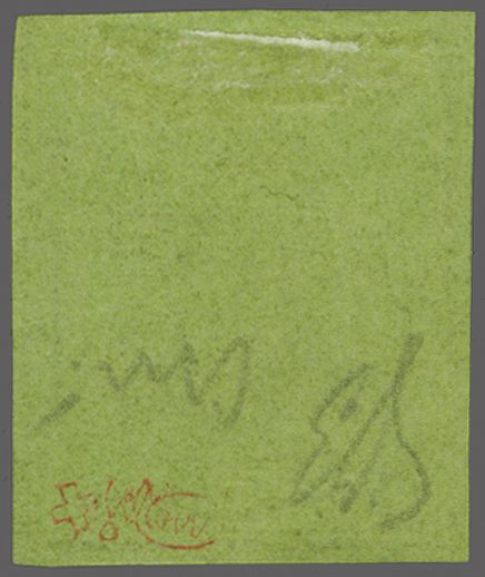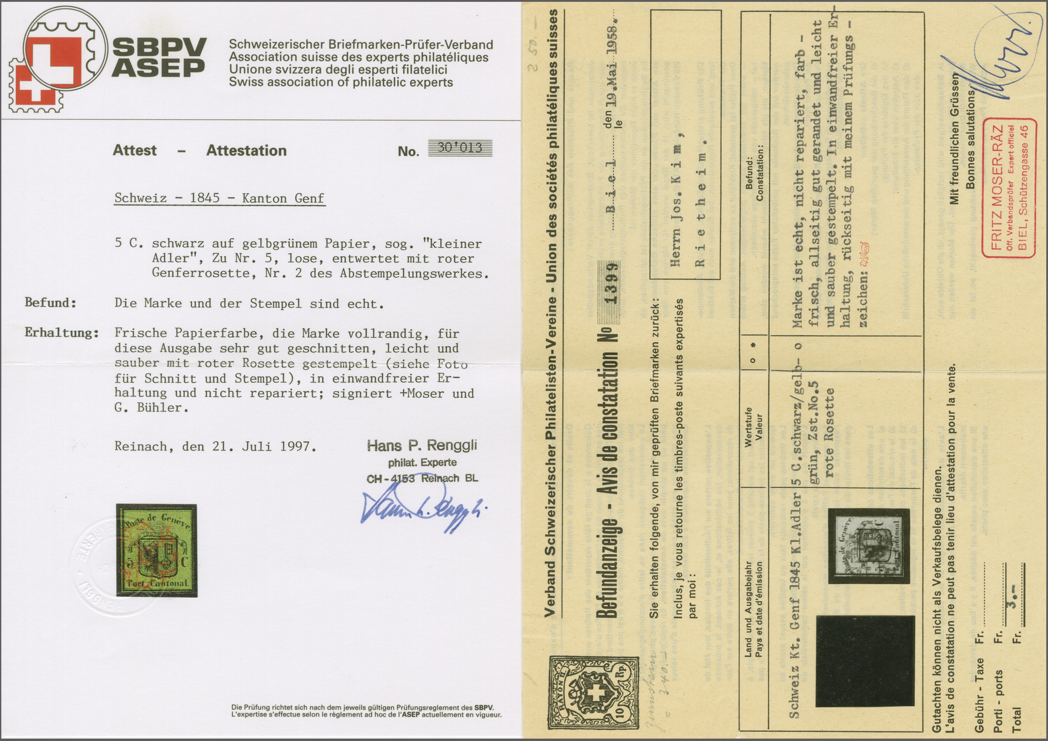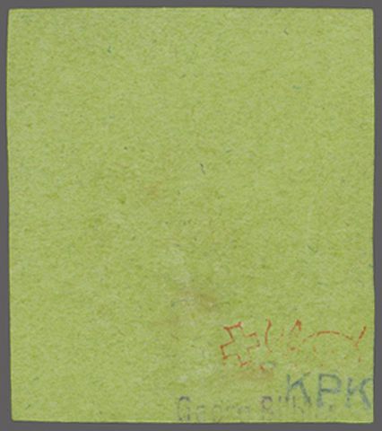Kl. Adler, farbfr. und für diese eng gedruckte Ausgabe gut- bis zweiseitig grünrandig mit Ansatz der linken Nebenmarke, zart entw. mit roter Genfer Rosette (AW 2). Signiert Bühler, Befund Moser (1958), Atteste Renggli (1997)