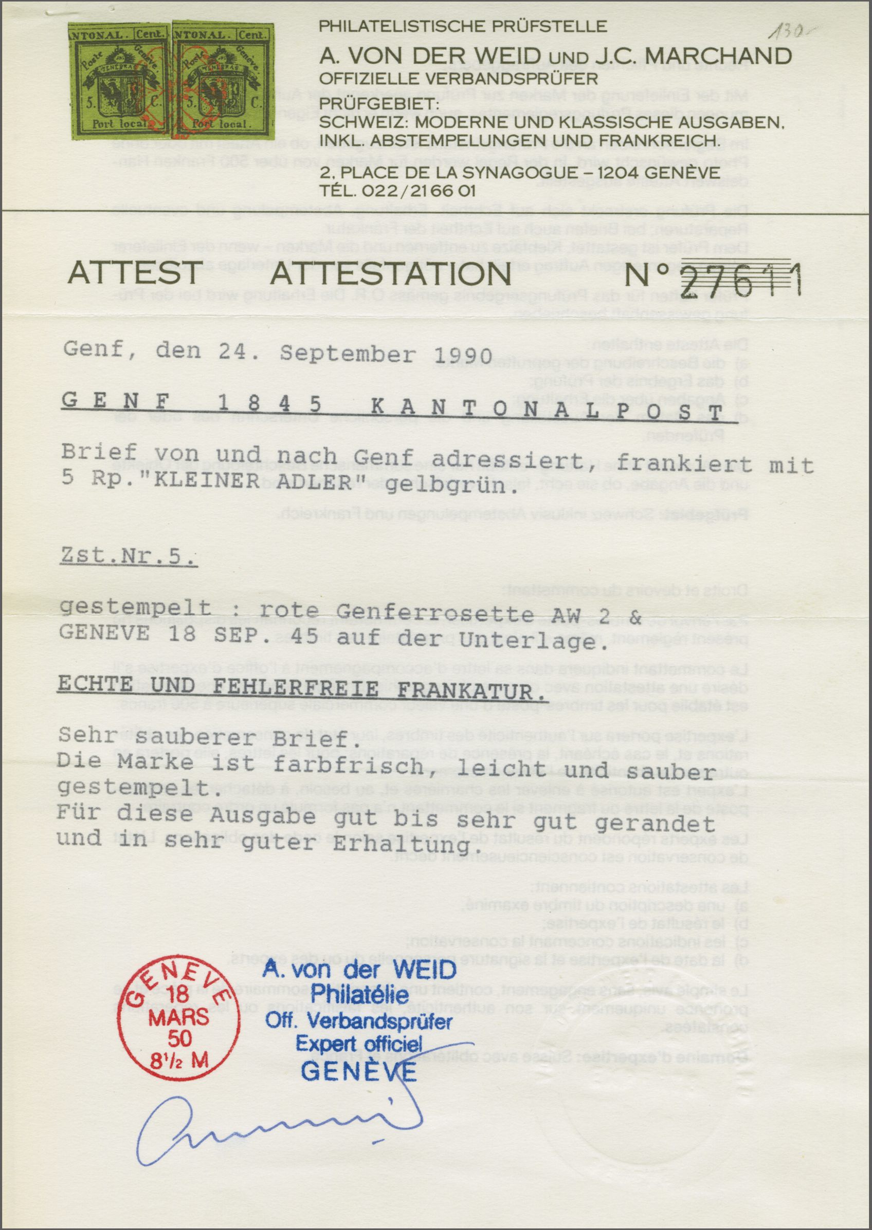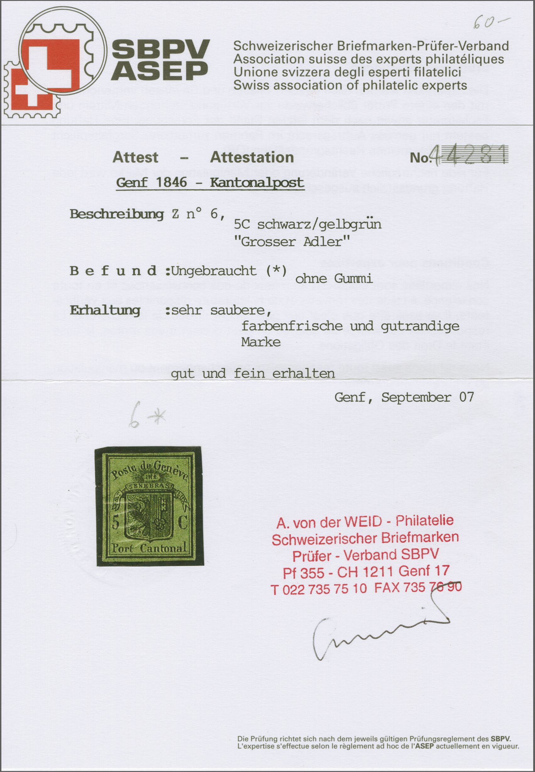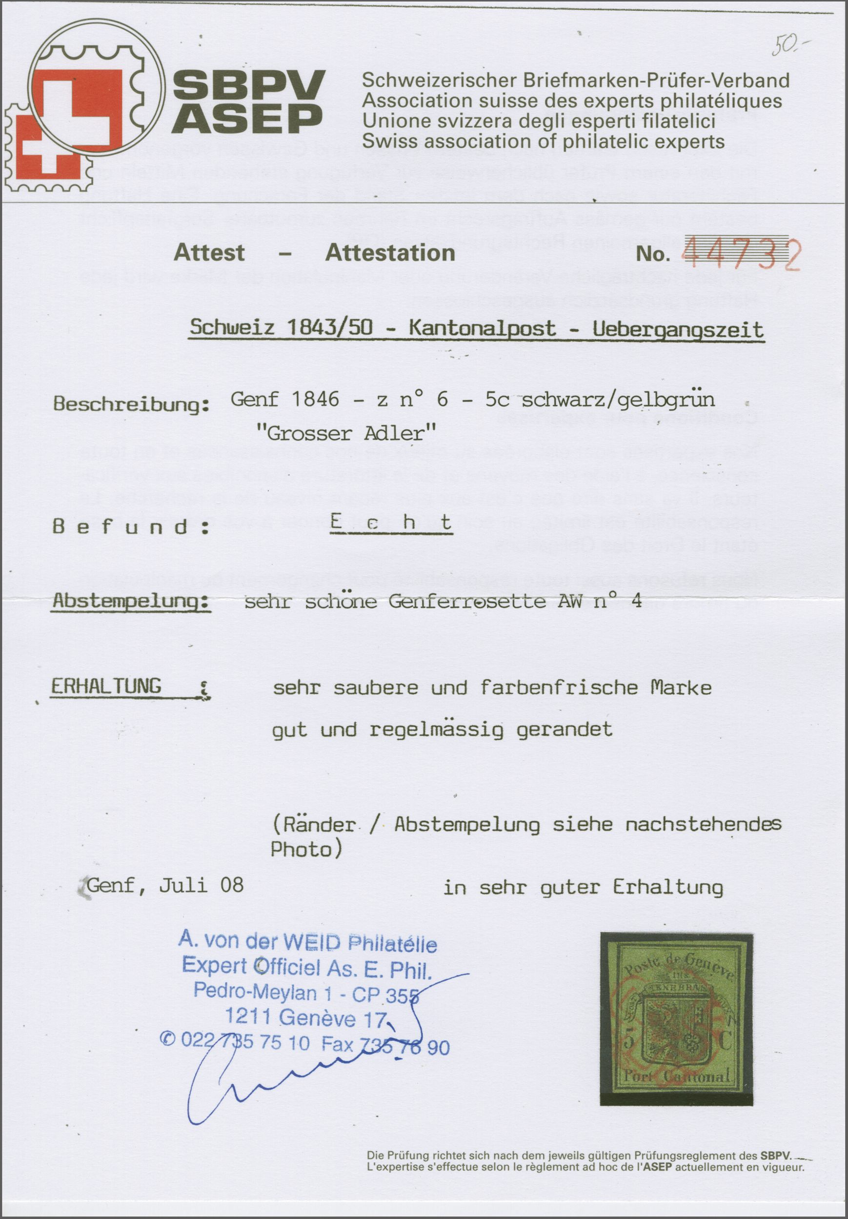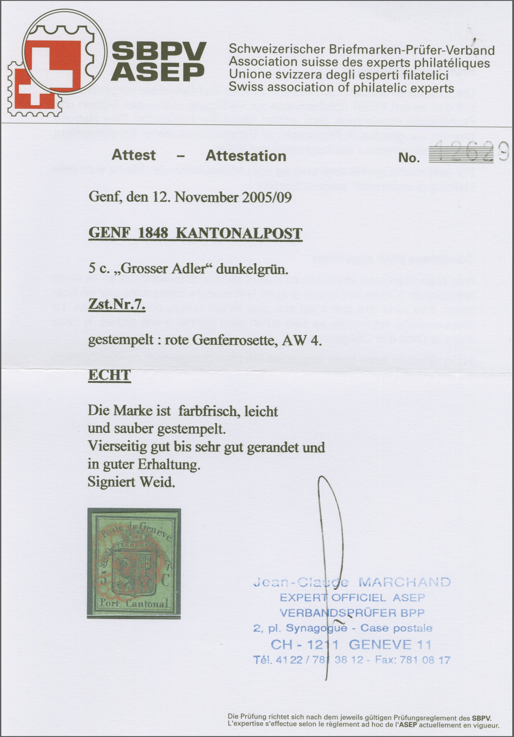 Gr. Adler dunkelgrün, farbfr. und voll- bis breitrandig, klar und kontrastreich entw. mit roter Genfer Rosette (AW 4). Signiert von der Weid; Attest Marchand (2005). SBK=CHF 4'000 (Image 1)