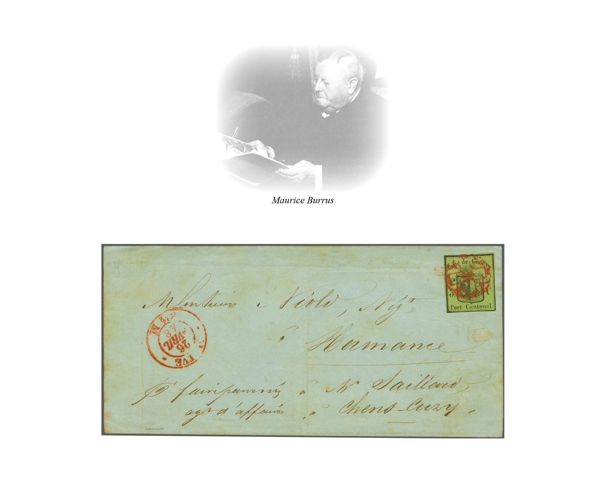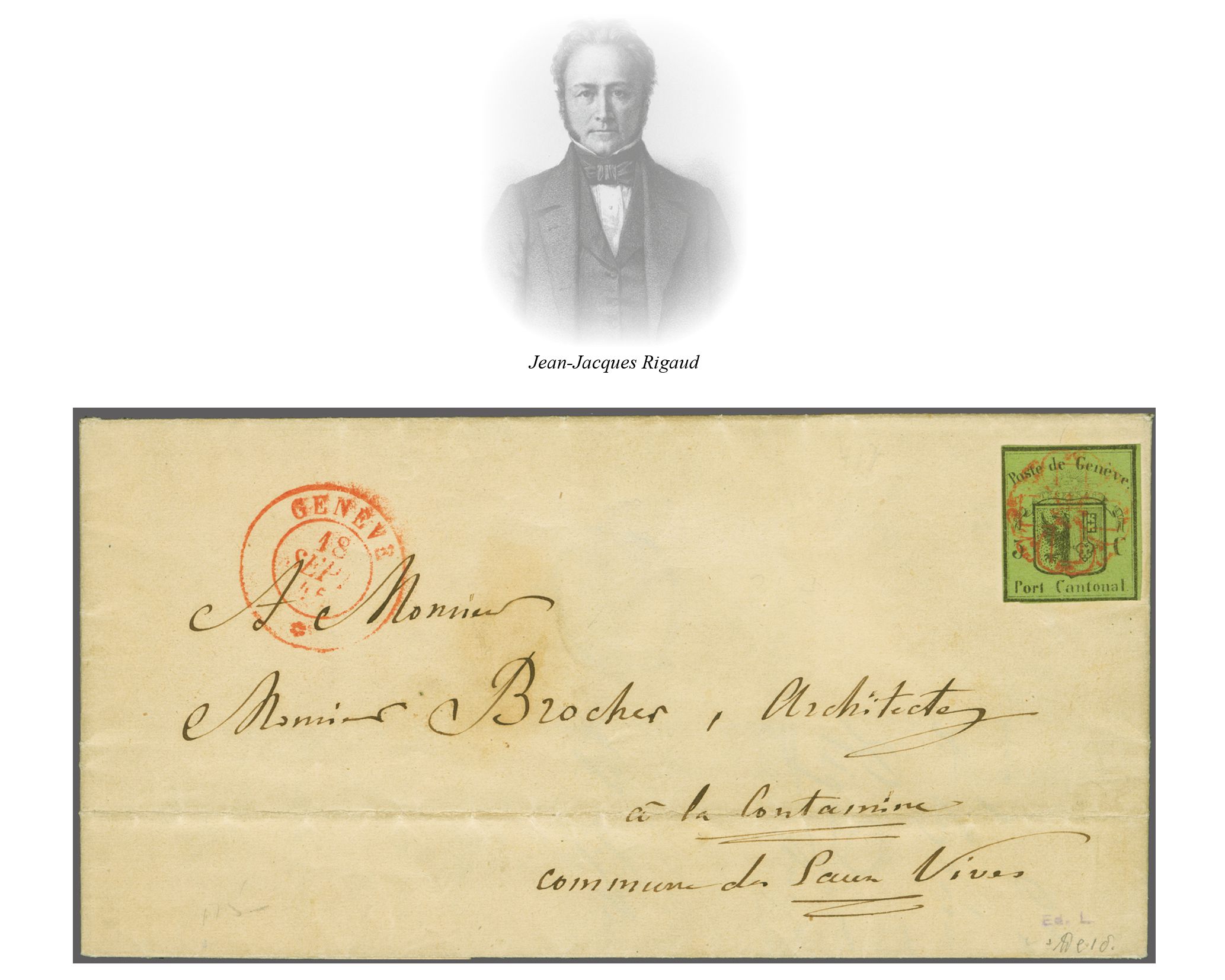 Faltbrief aus Privatkorrespondenz an den Architekten Jacques-Louis Brochet in Contamines (Eaux-Vives). Signiert Locher, Attest von der Weid (1990). SBK=CHF 4'900. Anmerkung: Absender des Briefes ist Jean-Jacques Rigaud (1785-1845), einflussreicher