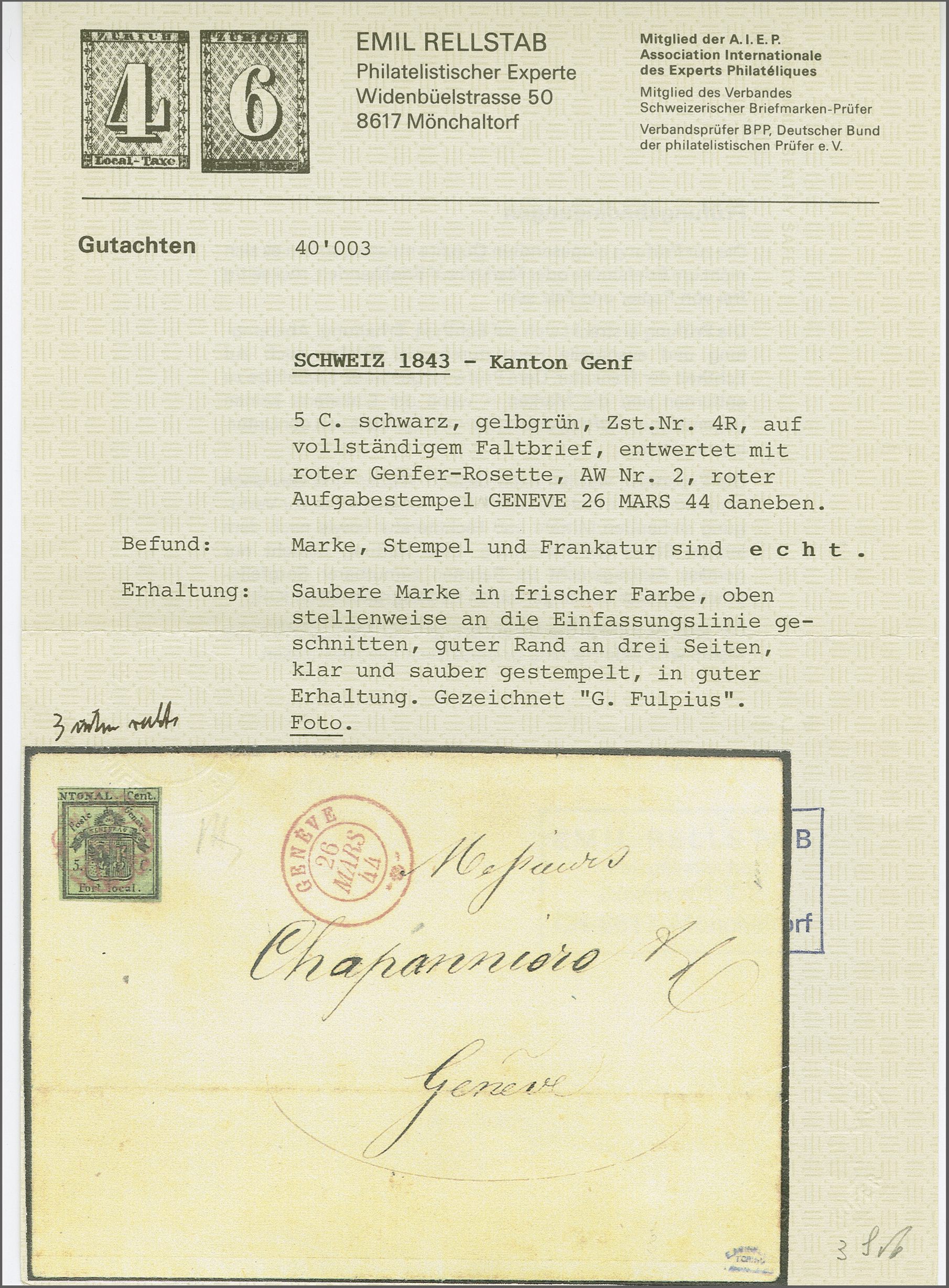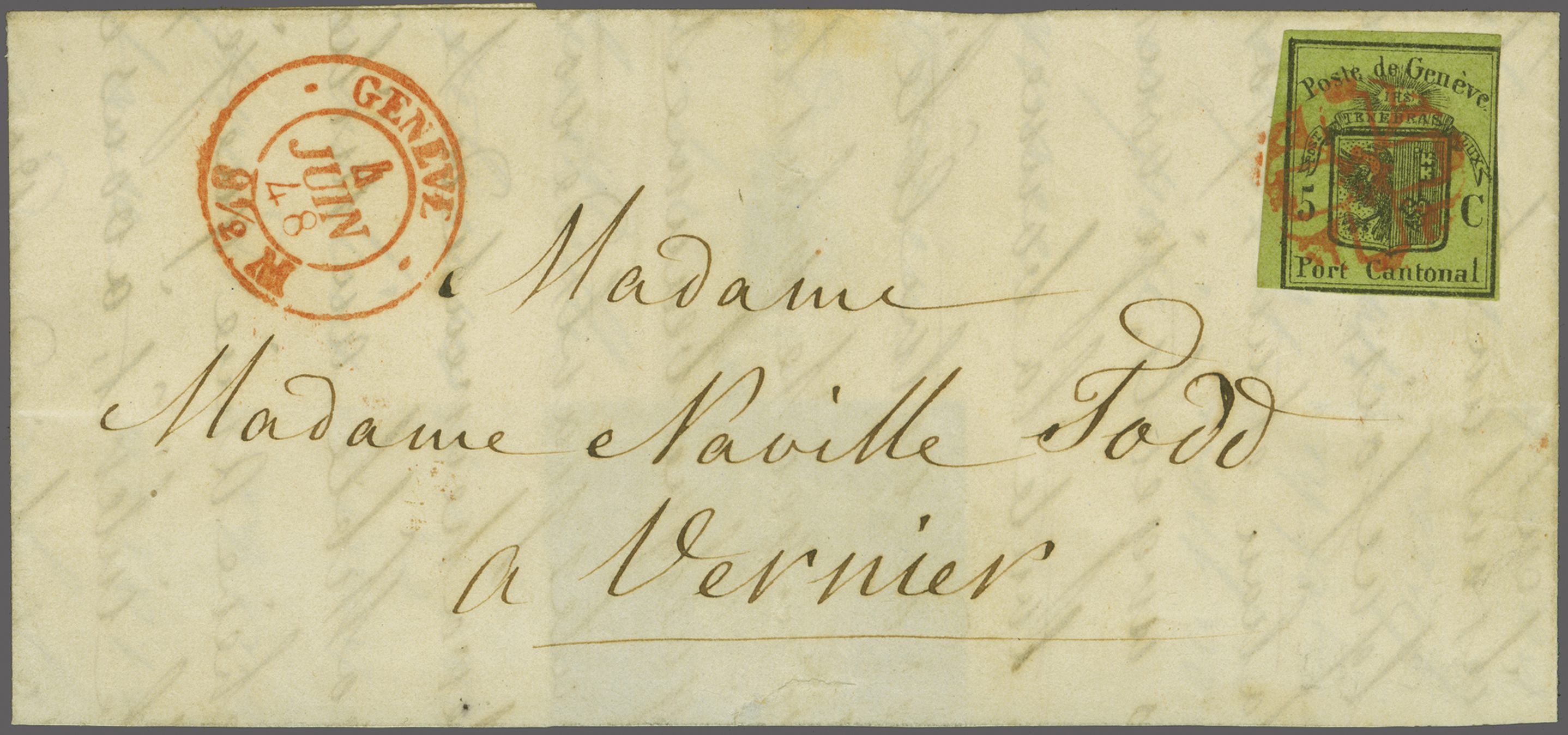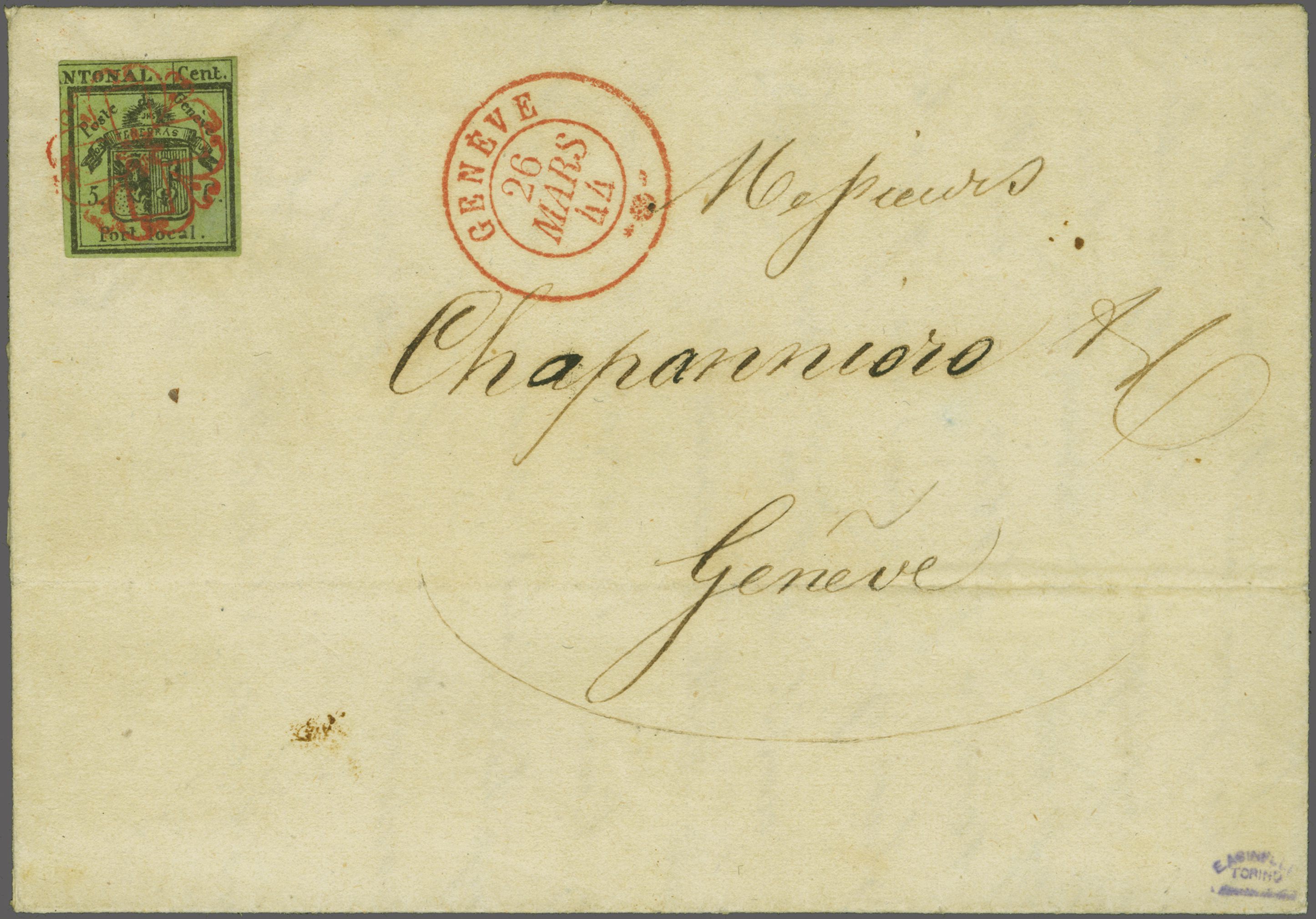 frischer und ansprechender Brief in eine kleine, ländlich geprägte Kantonsgemeinde am linken Seeufer; Atteste Rellstab (1972) und Berra (2000). SBK=CHF 4'900. Referenz: Abgebildet und diskutiert in: Grand, Morand, Dinichert: "Genfer Briefmarken