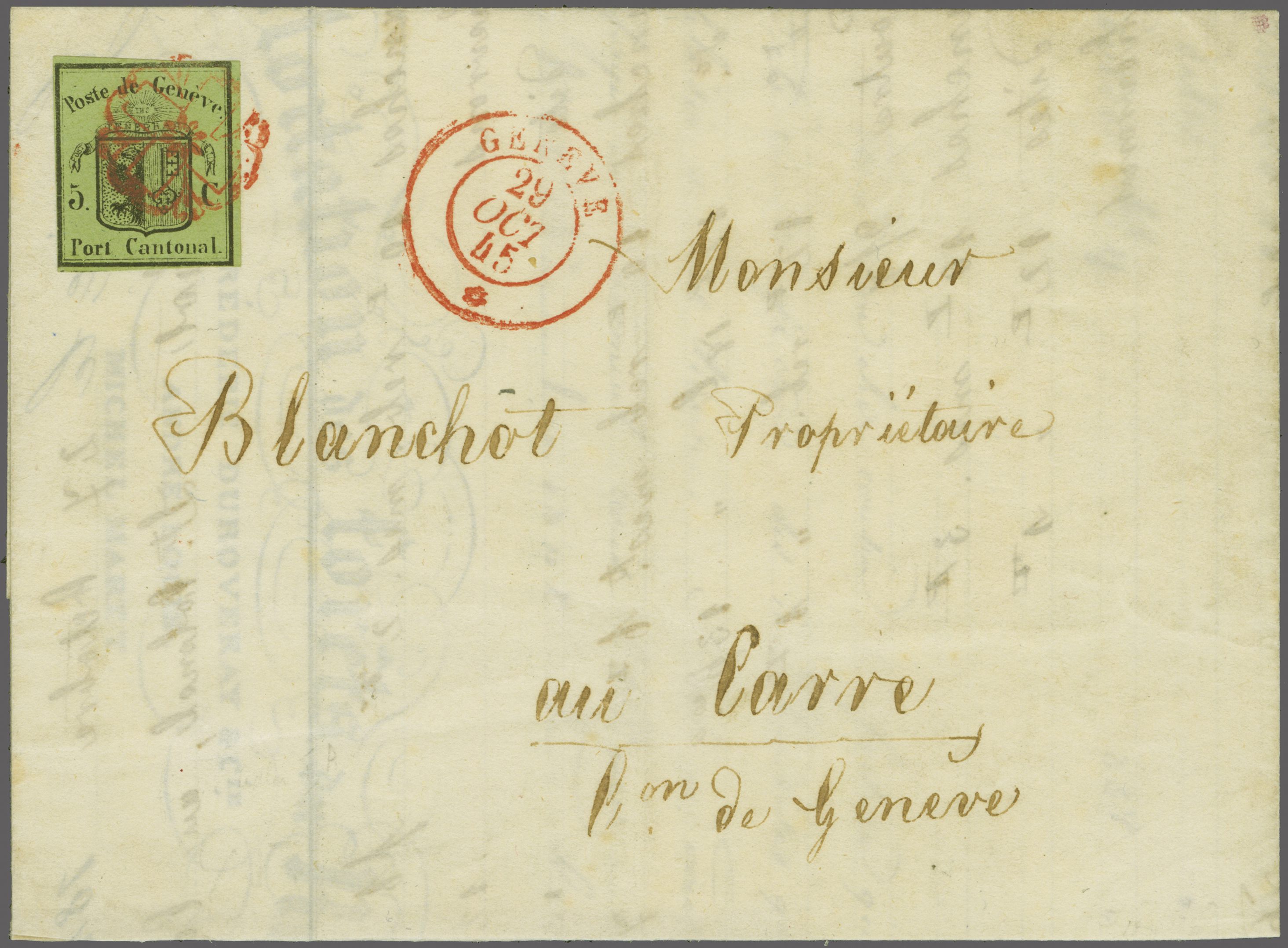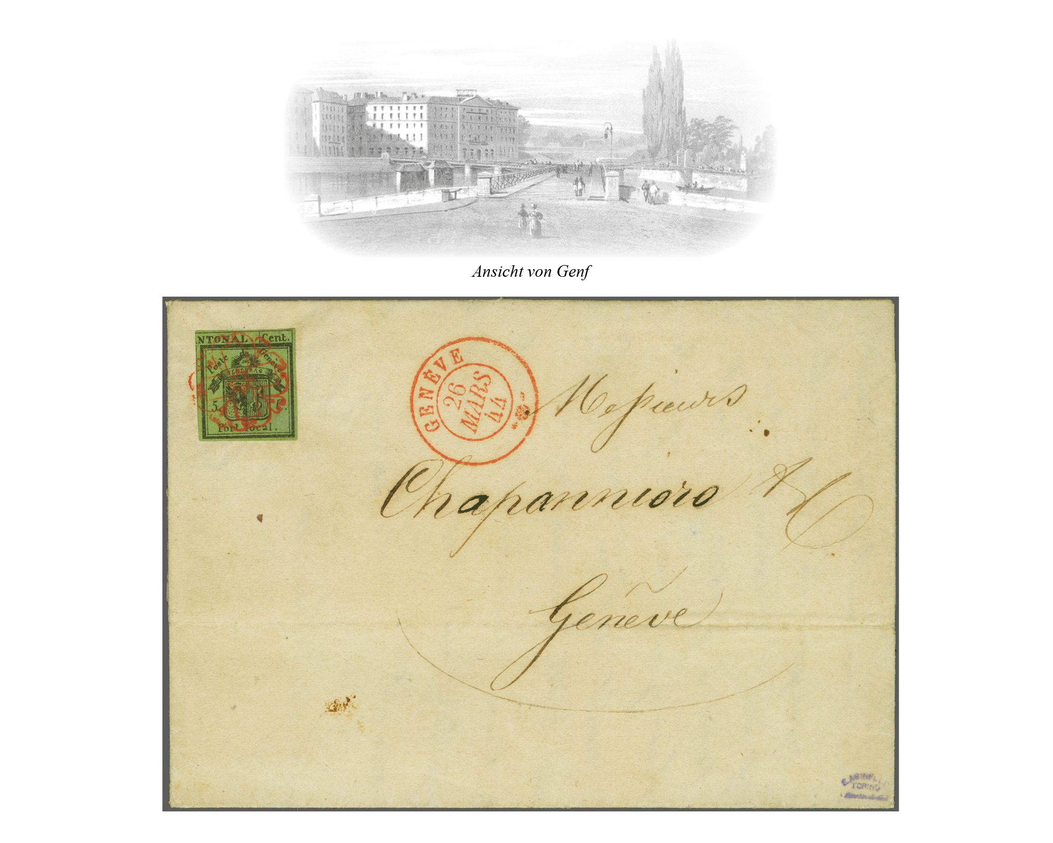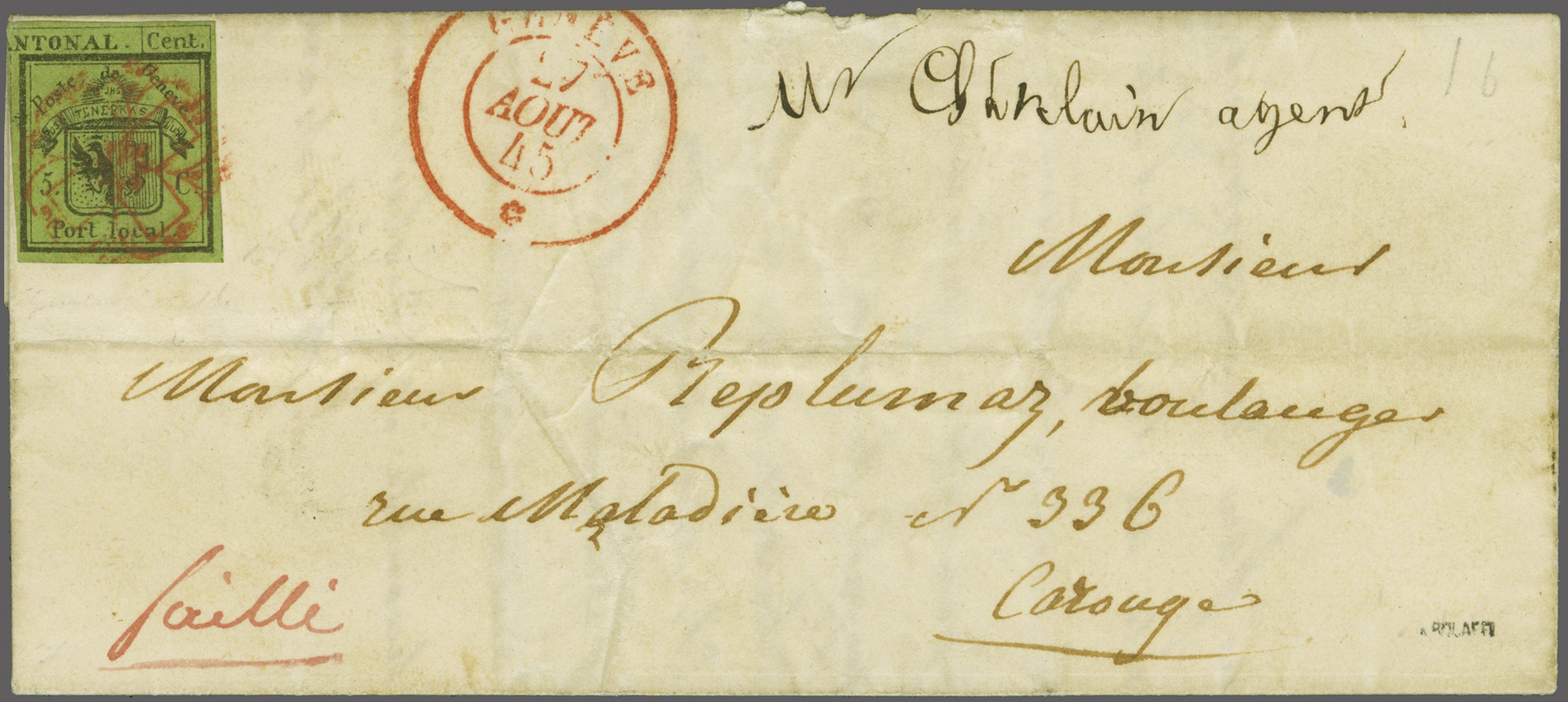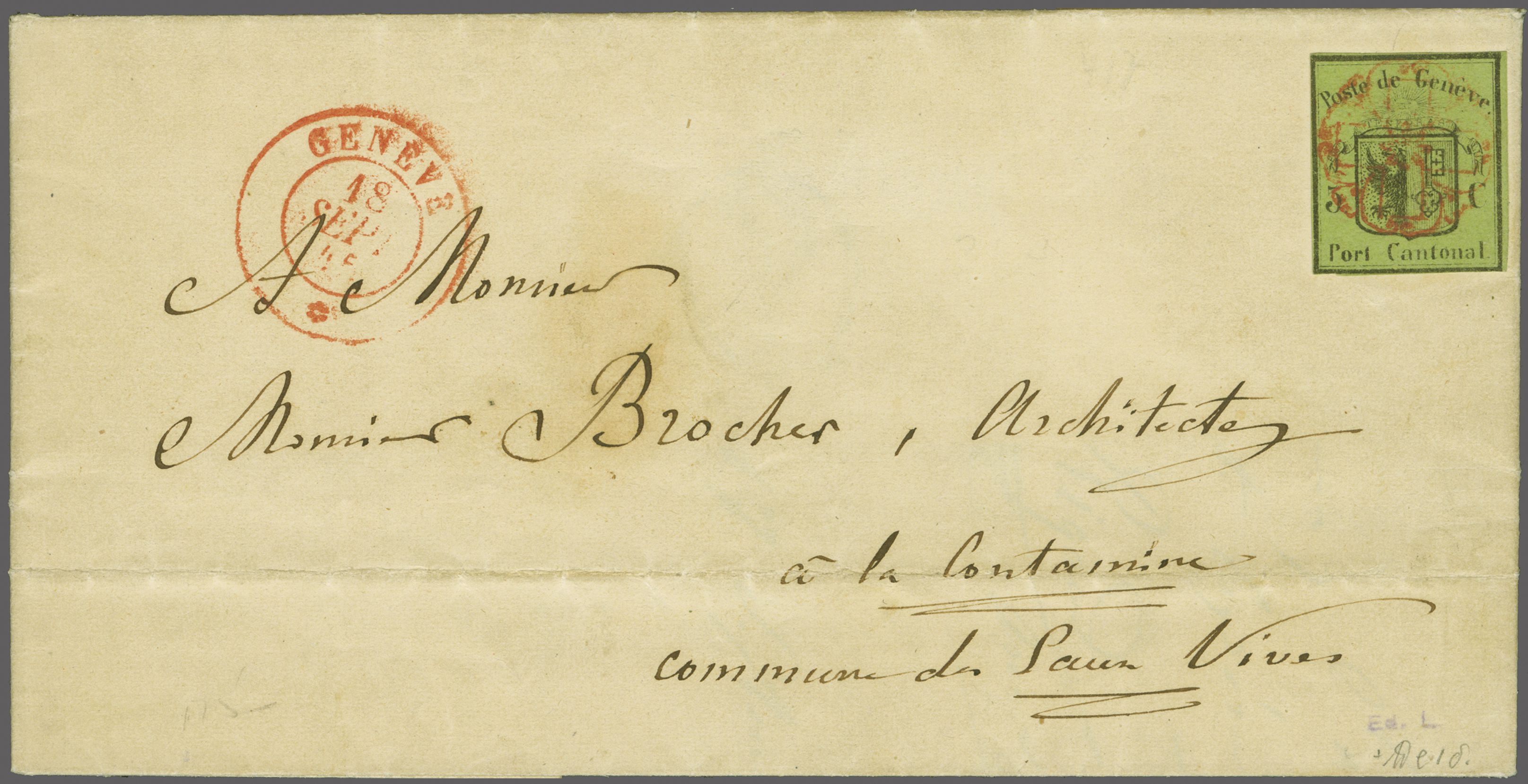 frischer und ansprechender Brief in eine kleine, ländlich geprägte Kantonsgemeinde am linken Seeufer; Atteste Rellstab (1972) und Berra (2000). SBK=CHF 4'900. Referenz: Abgebildet und diskutiert in: Grand, Morand, Dinichert: "Genfer Briefmarken
